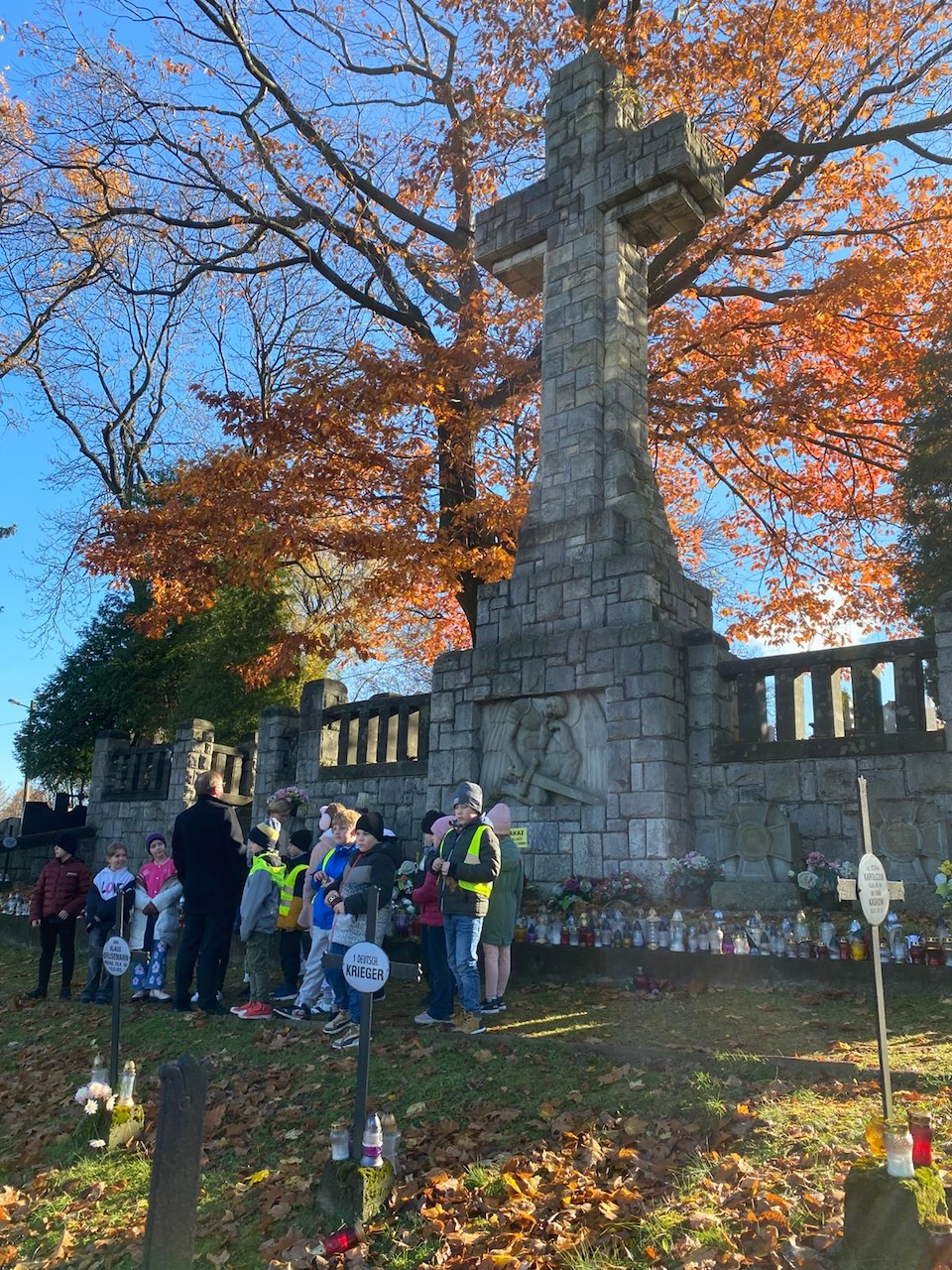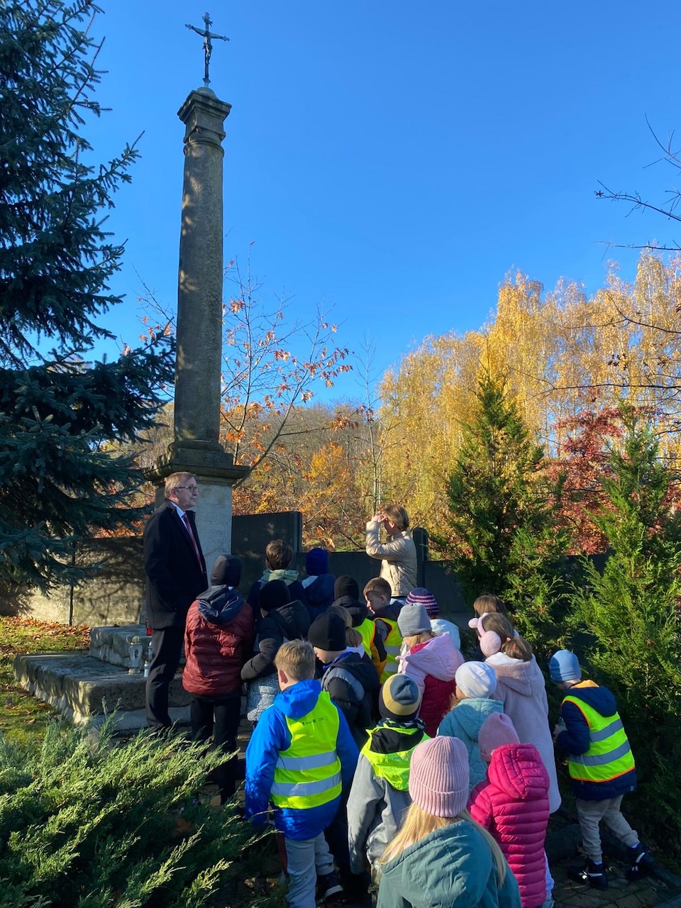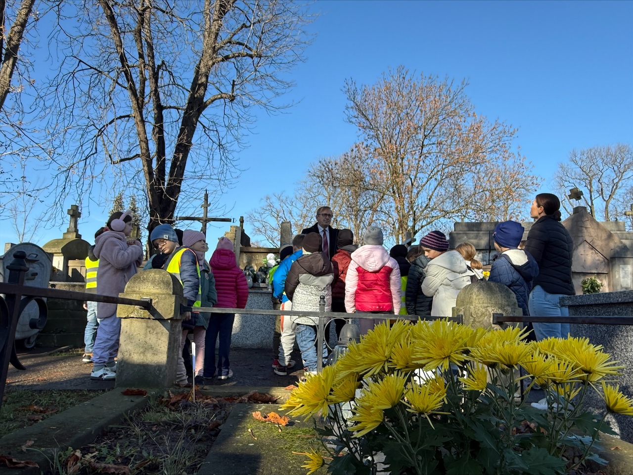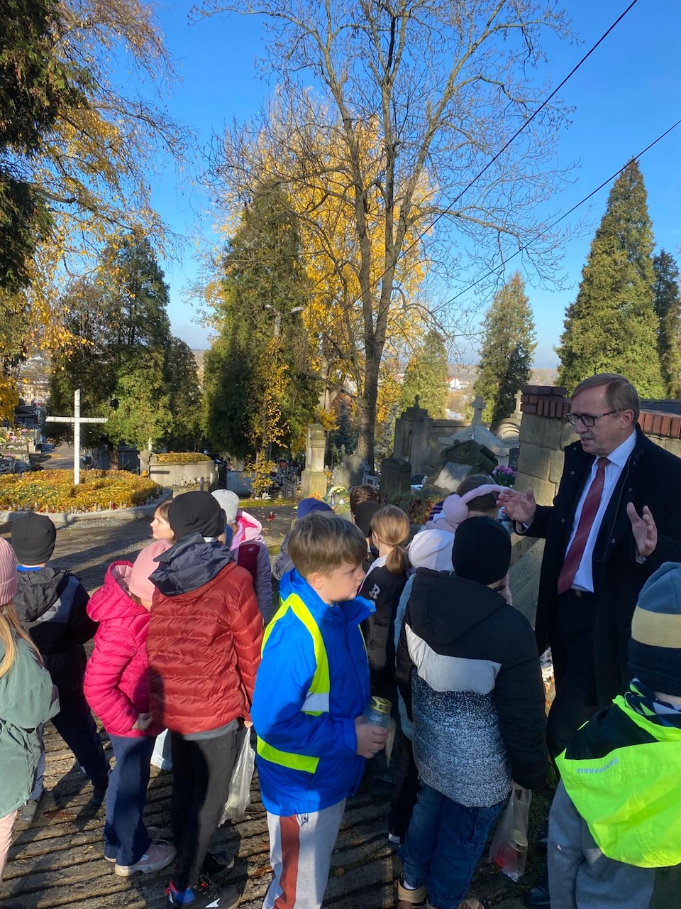 Tego dnia pogoda dopisała – piękne, jesienne słońce i kolorowe liście stworzyły wyjątkowy nastrój sprzyjający refleksji i spokojnemu spacerowi. Po cmentarzu oprowadzał uczniów pan dyrektor Zbigniew Solak, który