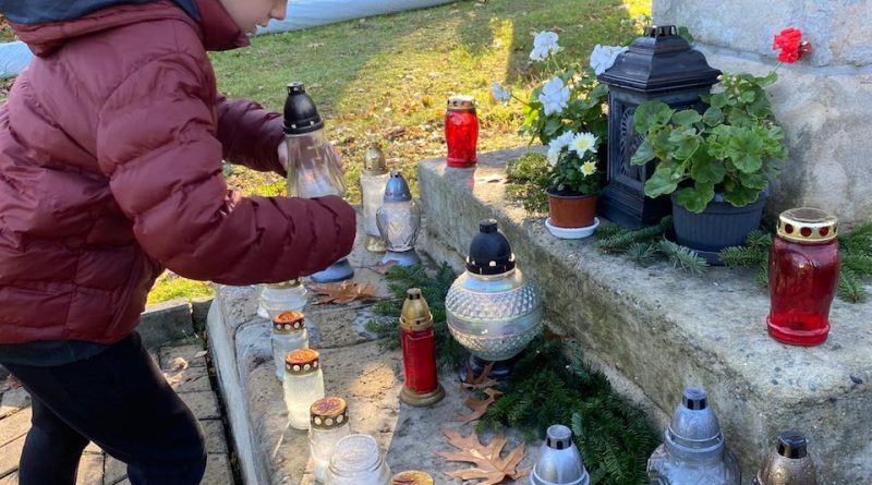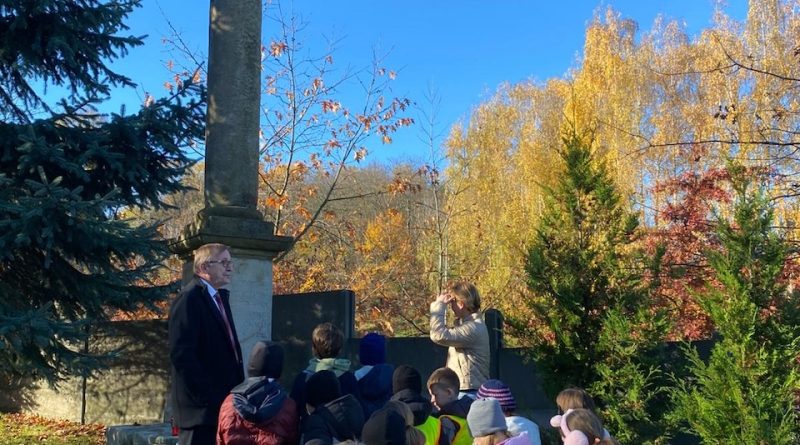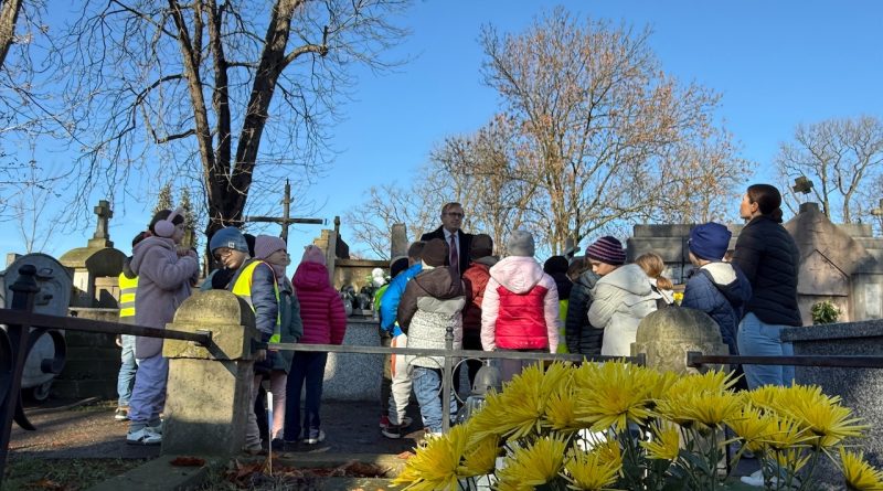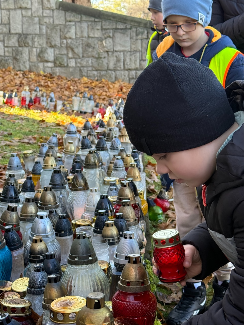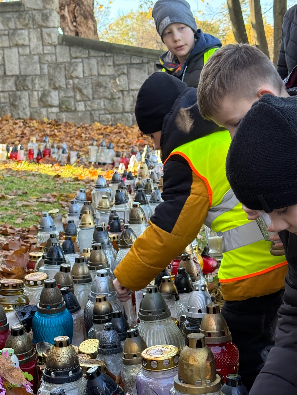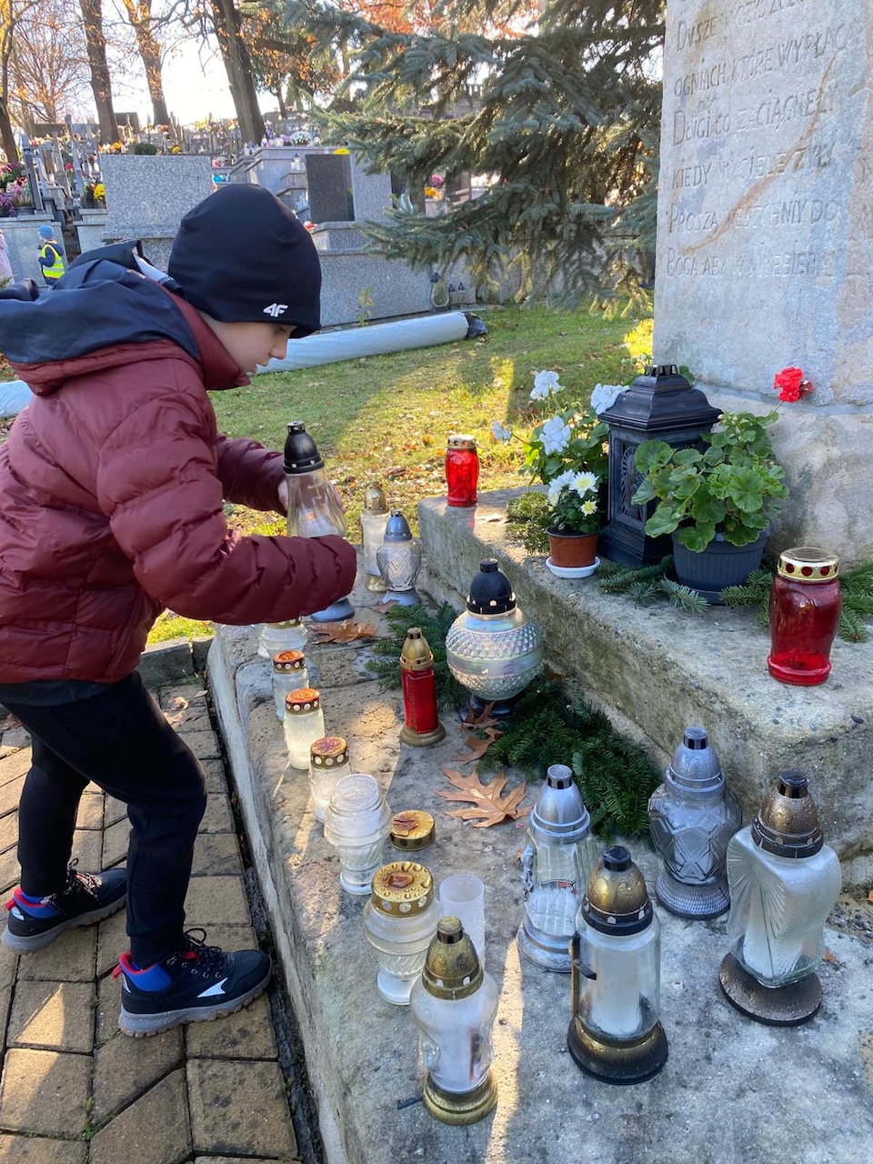 Tego dnia pogoda dopisała – piękne, jesienne słońce i kolorowe liście stworzyły wyjątkowy nastrój sprzyjający refleksji i spokojnemu spacerowi. Po cmentarzu oprowadzał uczniów pan dyrektor Zbigniew Solak, który