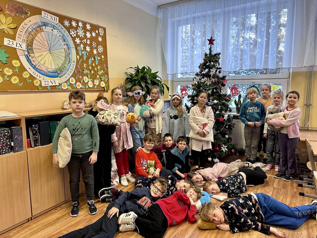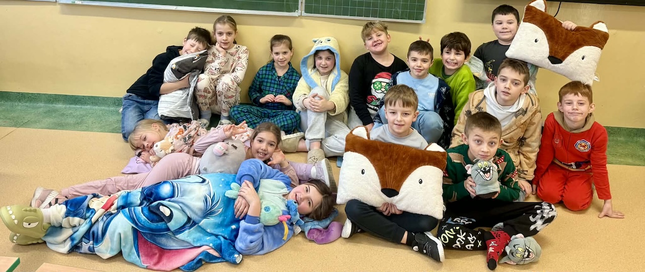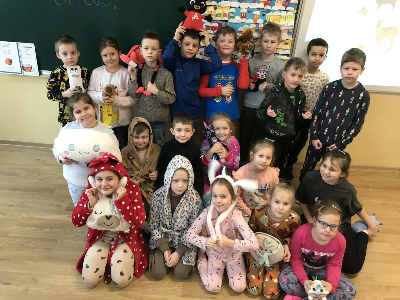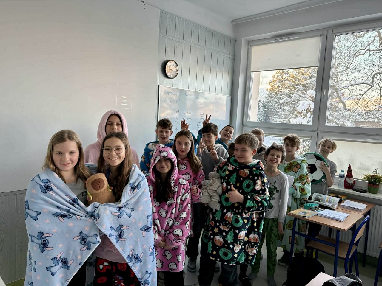 Uczniowie przyszli na zajęcia w piżamach, szlafrokach, kapciach oraz z poduszkami, tworząc wyjątkową, bardzo przytulną atmosferę 🤗.