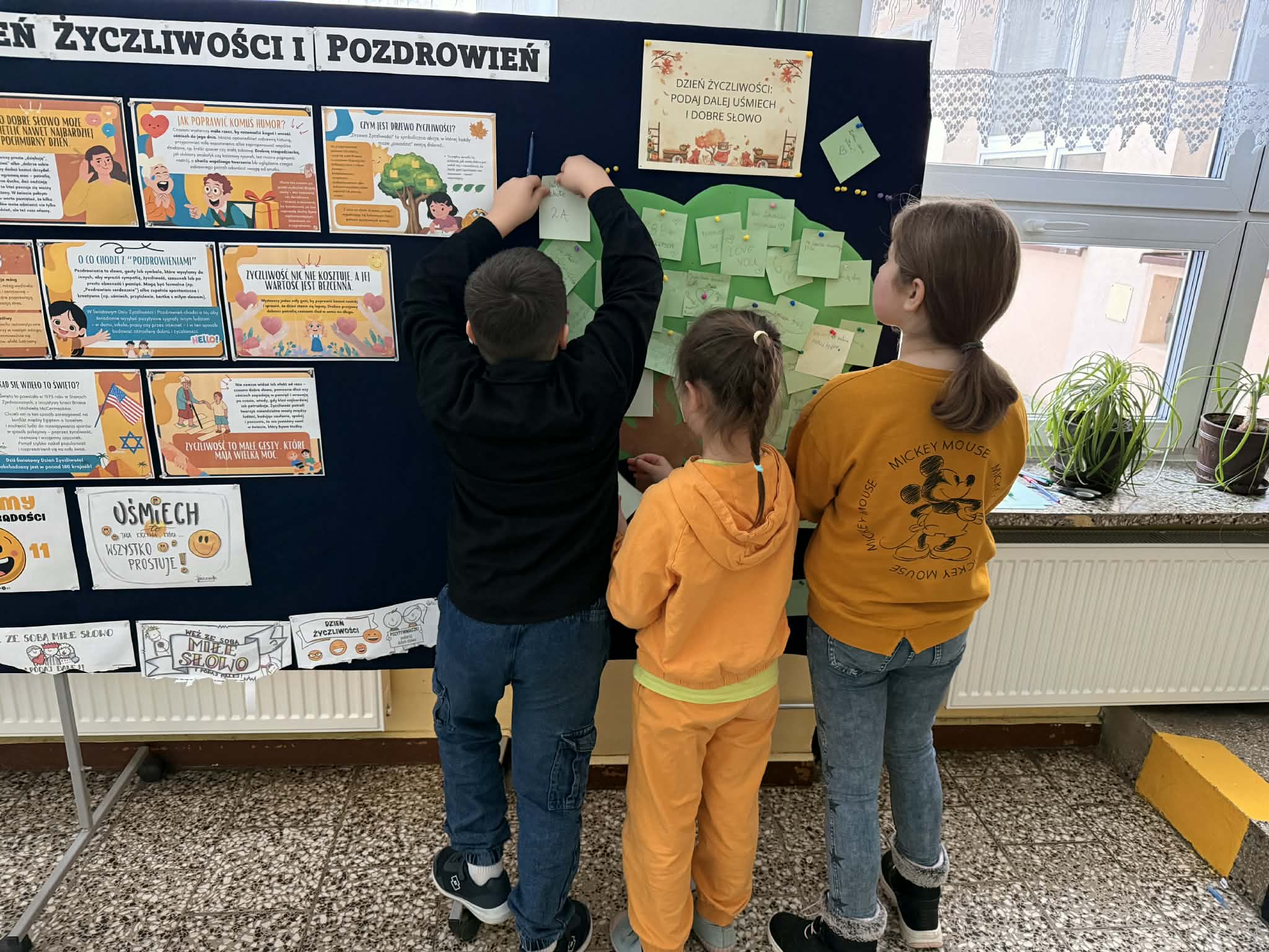 Już od rana na parterze szkoły uwagę przyciągała kolorowa gazetka tematyczna oraz wyjątkowe Drzewo Życzliwości i Pozdrowień. Każdy mógł zatrzymać się na chwilę, dopisać własne miłe słowo, życzenie lub komplement i zawiesić je na gałęziach symbolicznego drzewa.