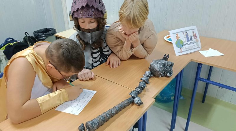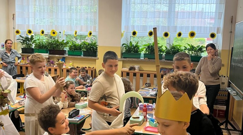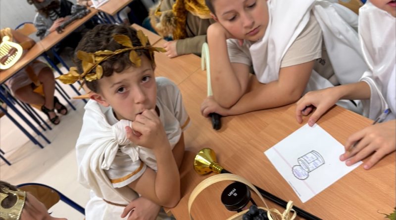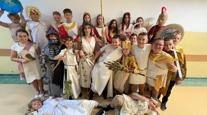 Uczniowie z 5c, przebrani za bogów i bohaterów greckich, wzięli udział w konkursie wiedzy mitologicznej. Z wielkim zaangażowaniem wykonywali kolejne zadania.