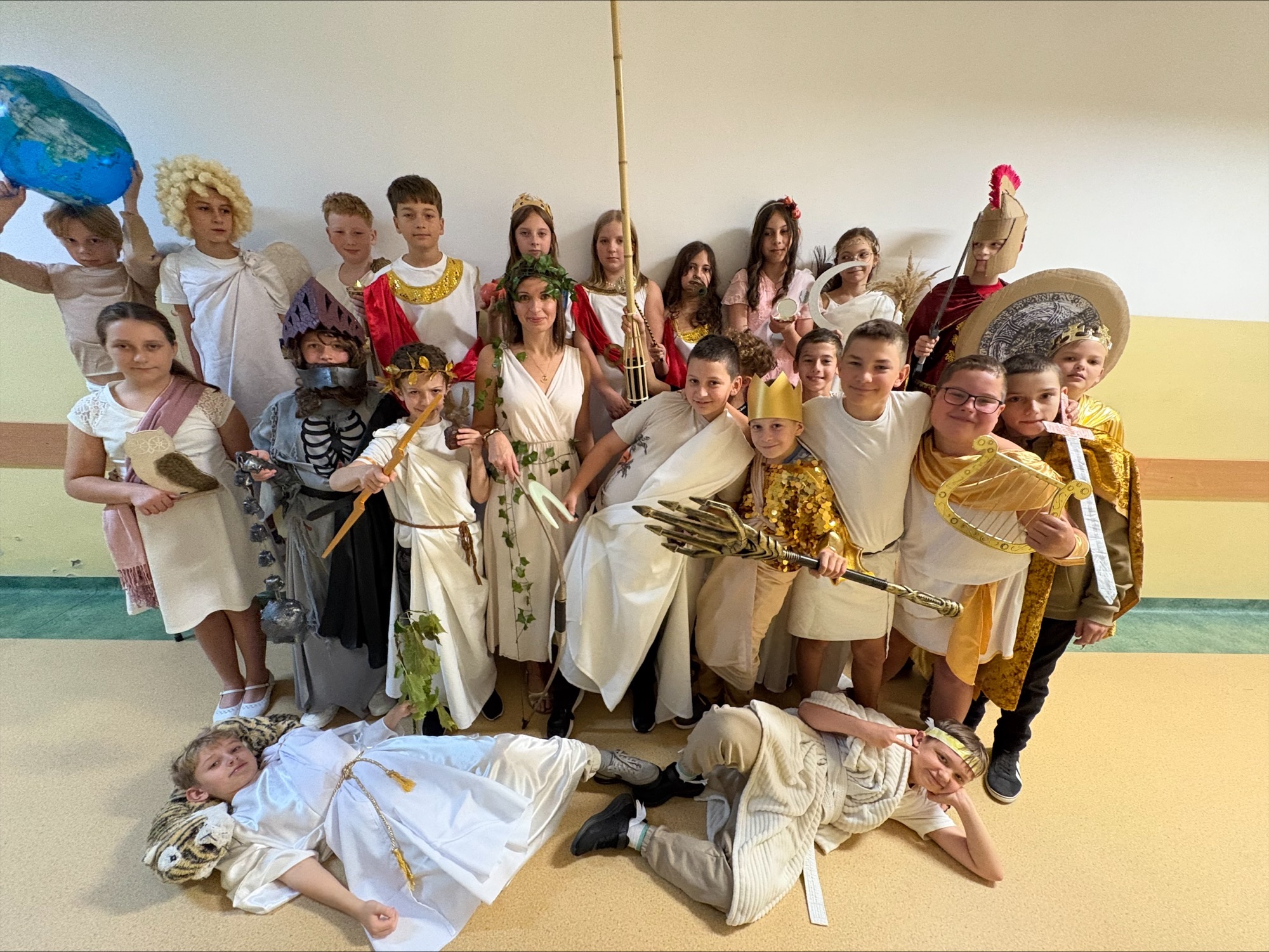 Na zakończenie dnia kolorowym korowodem odwiedzili młodszych kolegów z edukacji wczesnoszkolnej, prezentując swoje stroje i dzieląc się mitologiczną atmosferą. 🌿⚡