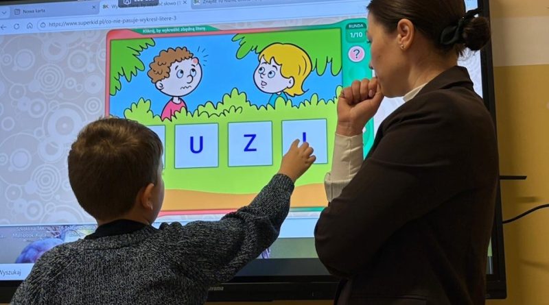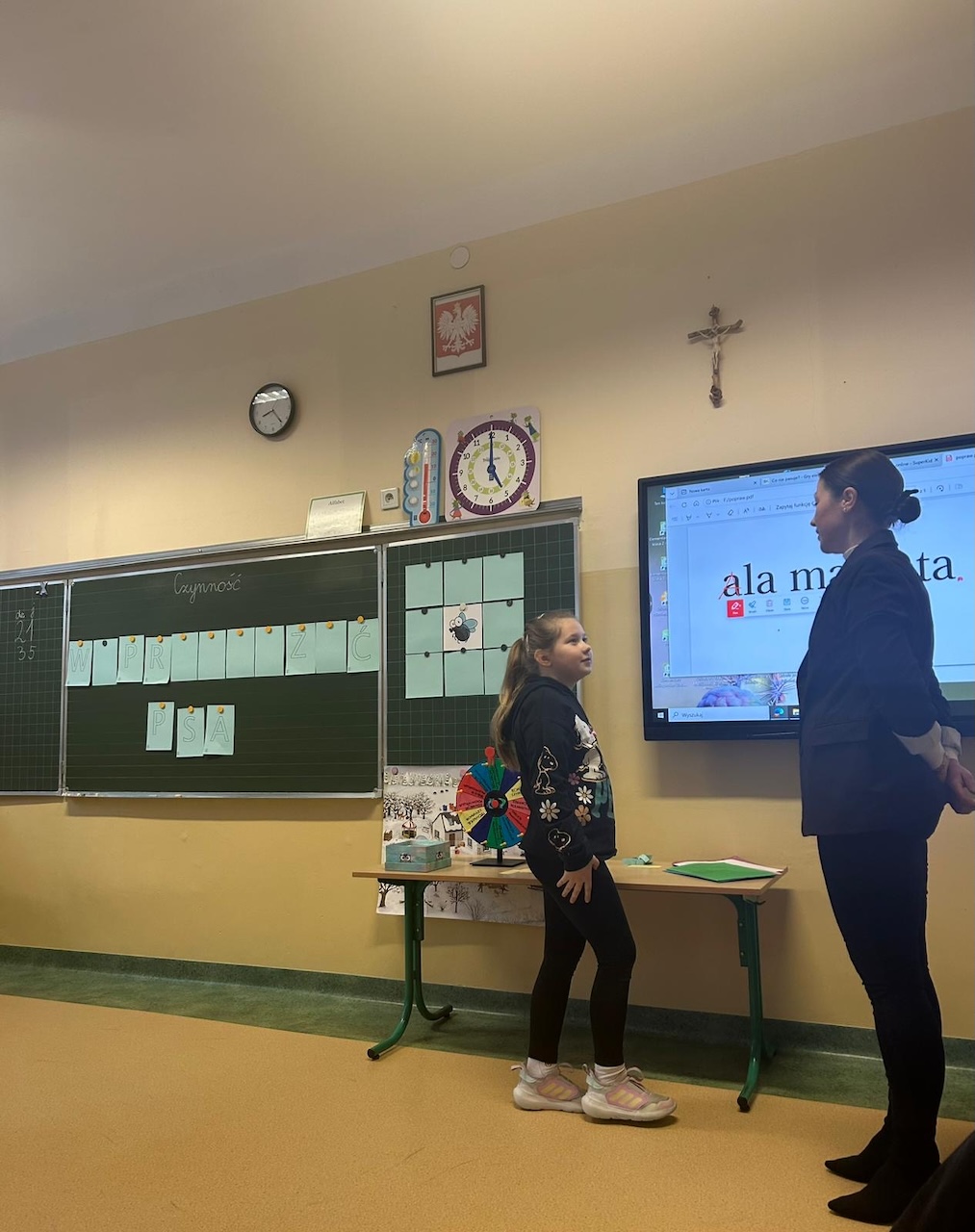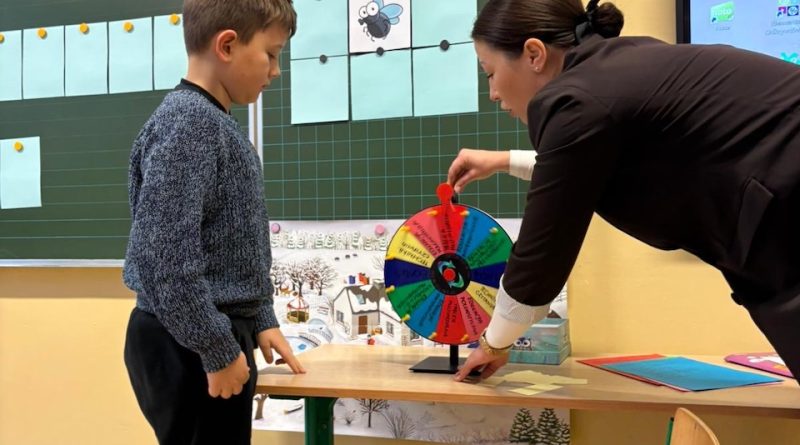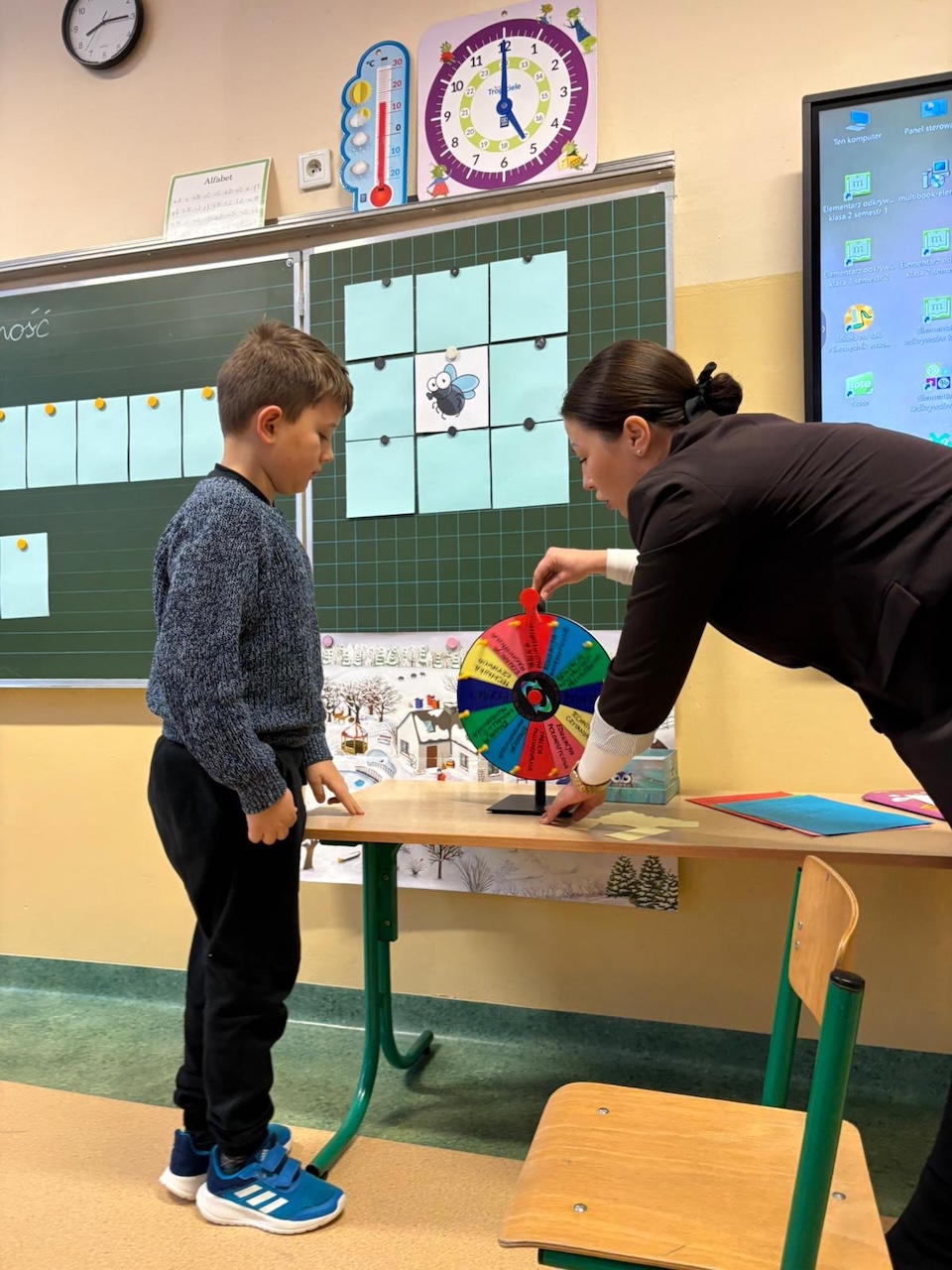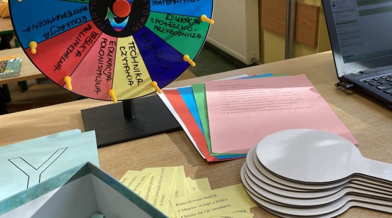 Główną część zajęć stanowiła zabawa edukacyjna „Koło fortuny”. Uczniowie kręcili kołem