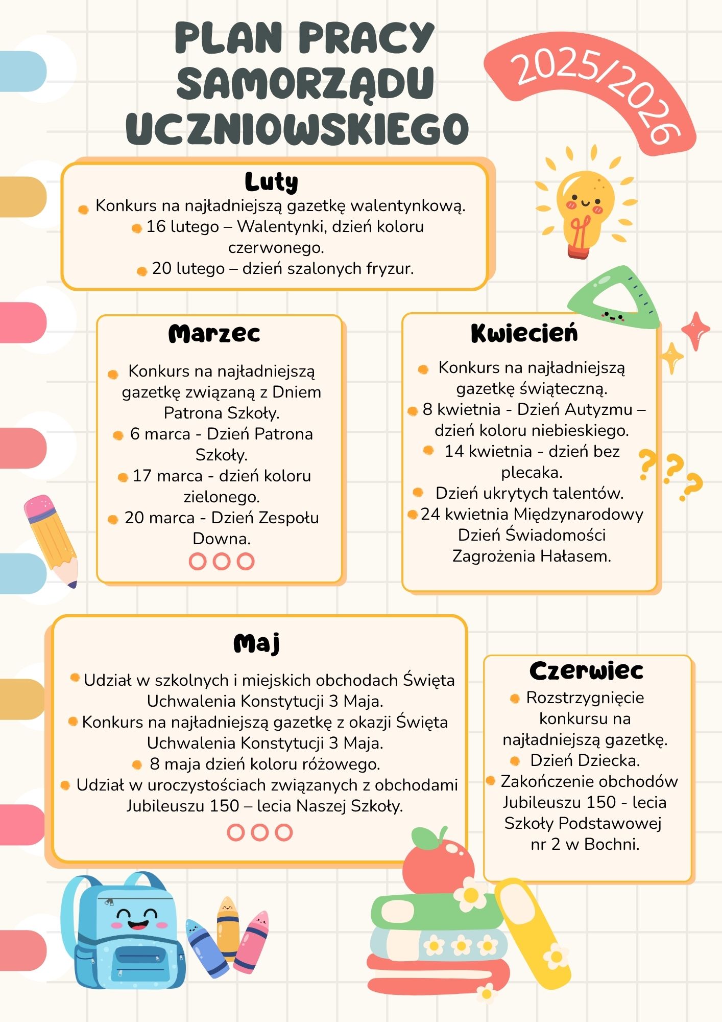 Samorząd Uczniowski wraz z opiekunami przedstawia plan pracy na rok szkolny 2025/2026.