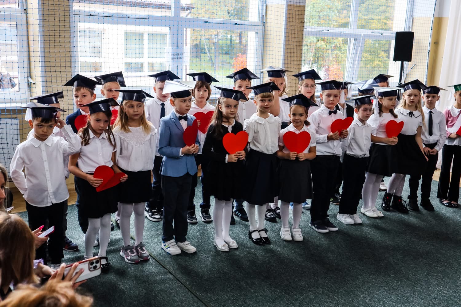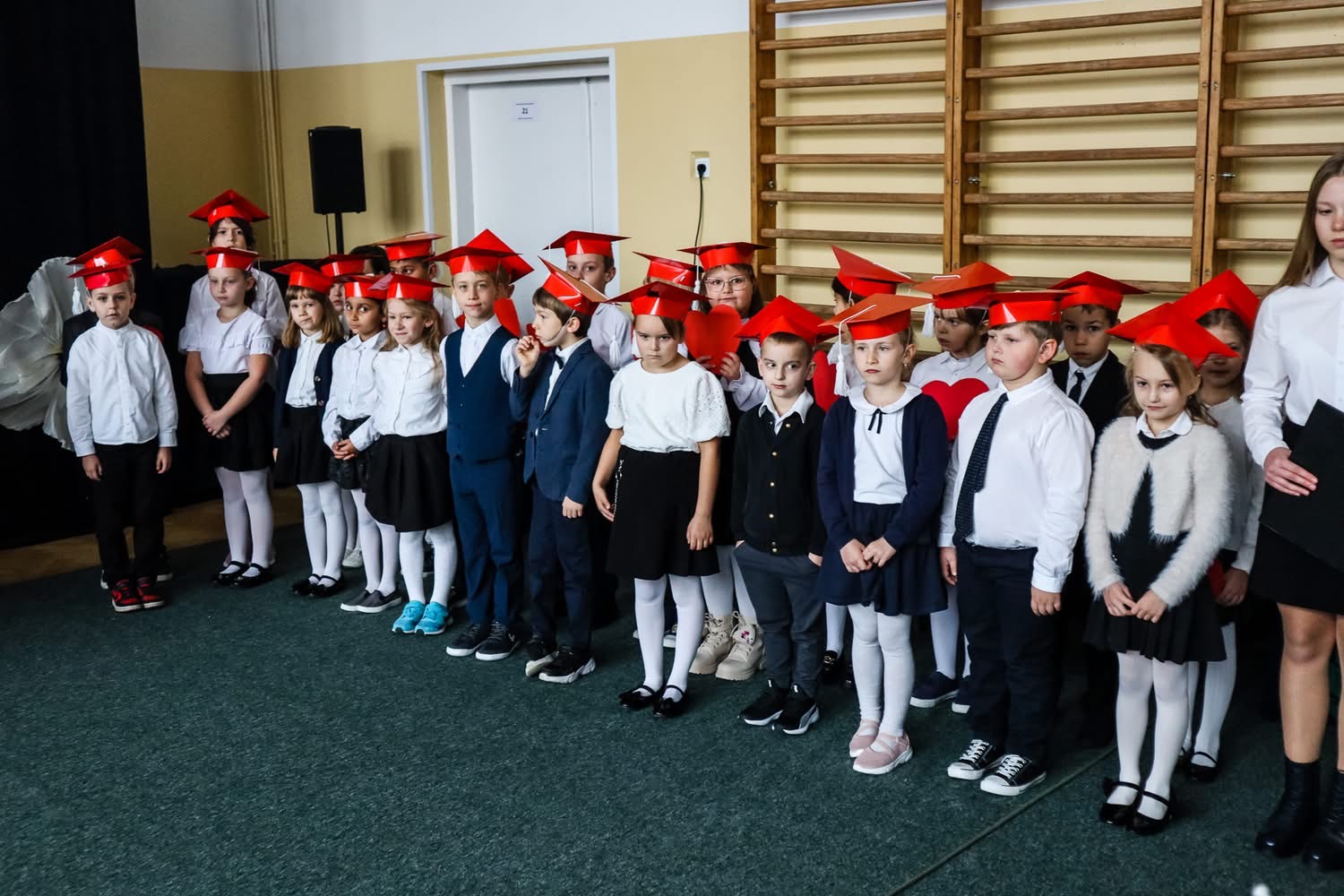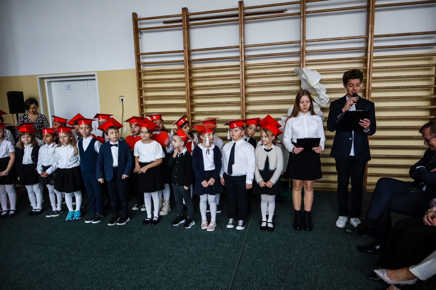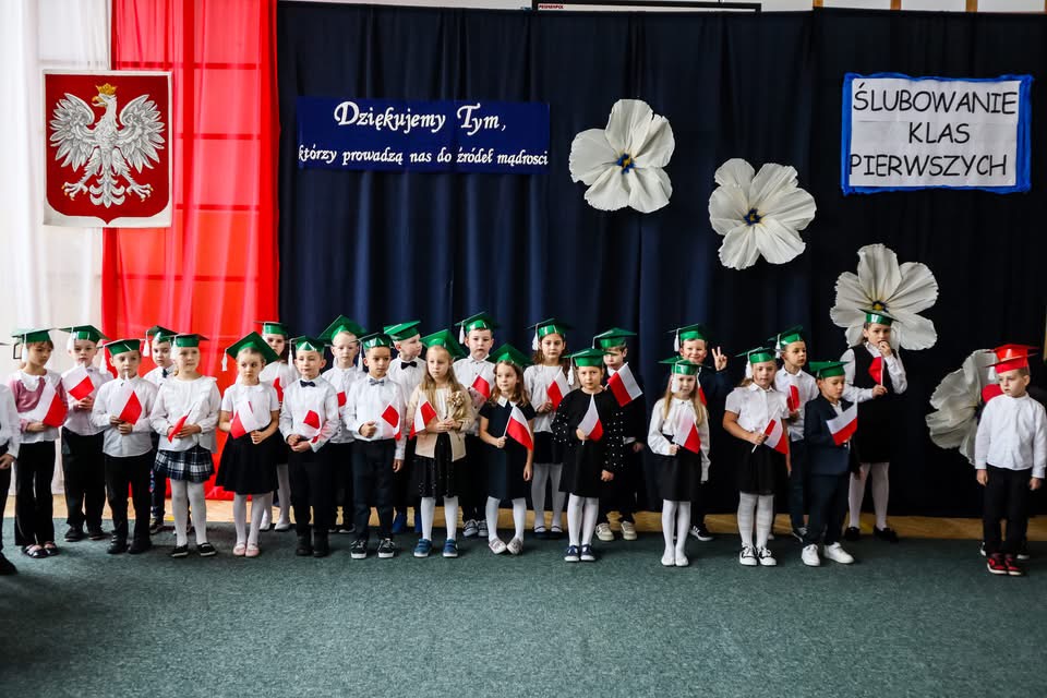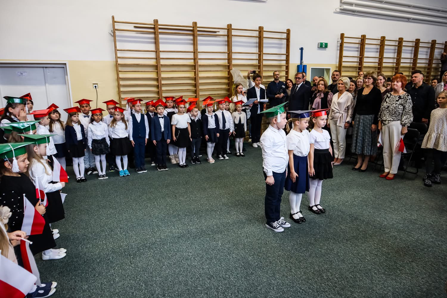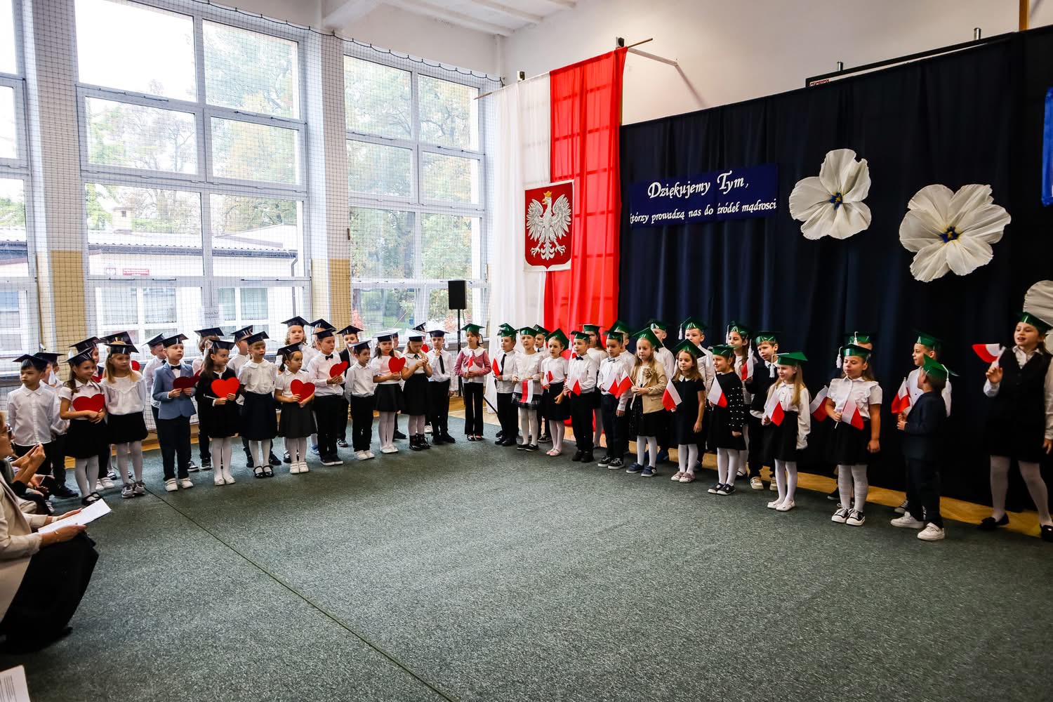 Te słowa wypowiedziały wszystkie pierwszaki w czasie uroczystości na sali gimnastycznej w dniu 14 października 2025 r. Dzieci recytowały również wiersze i śpiewały piosenki o tematyce szkolnej i patriotycznej.