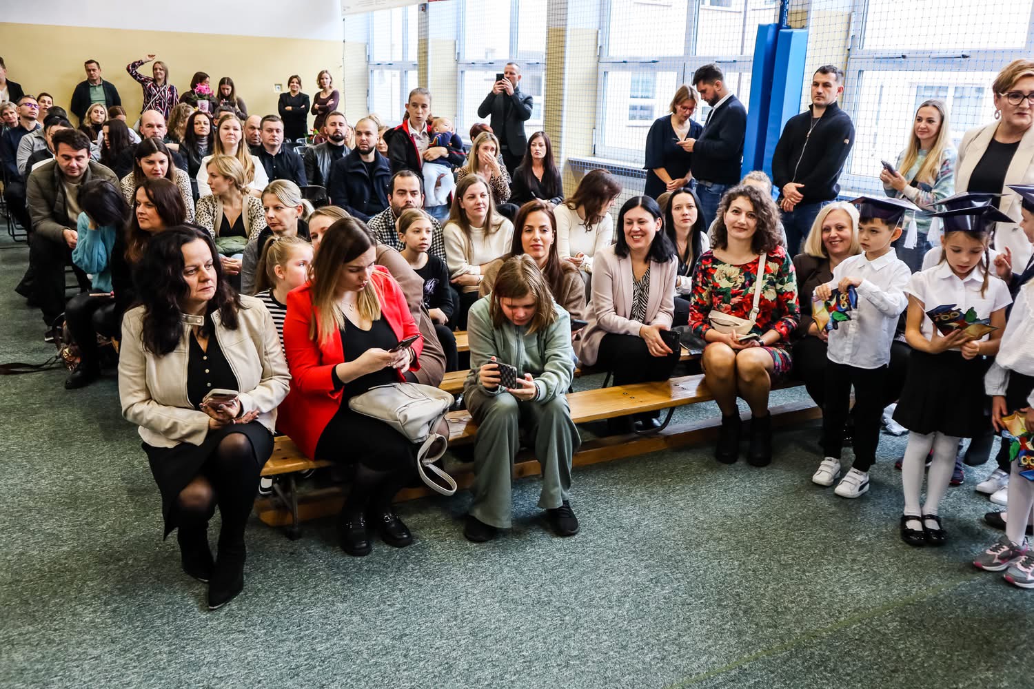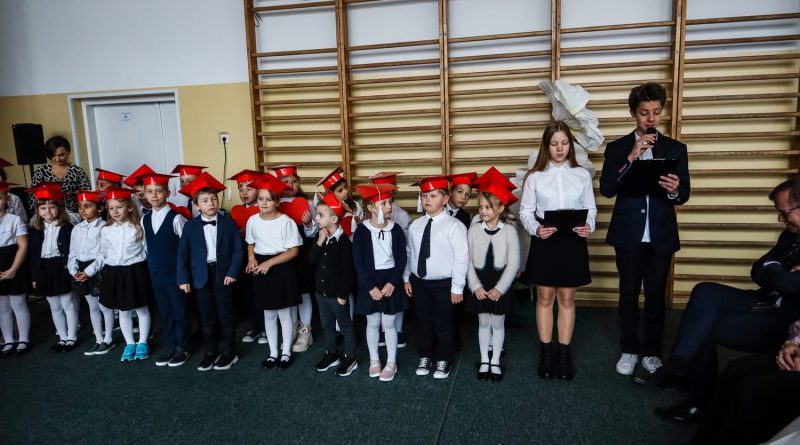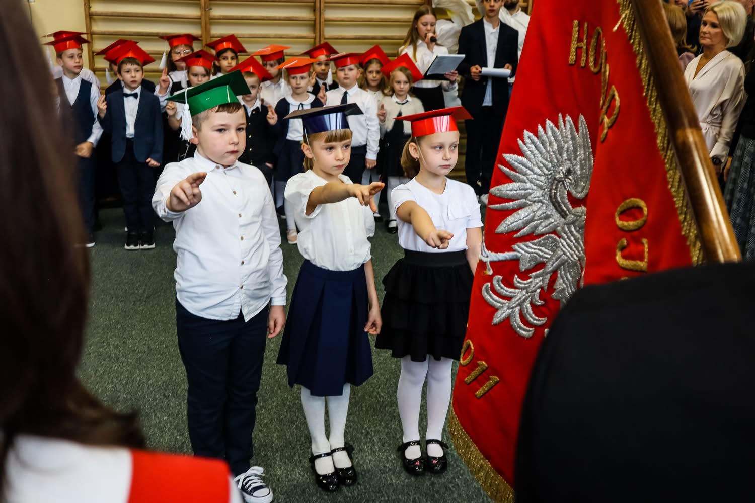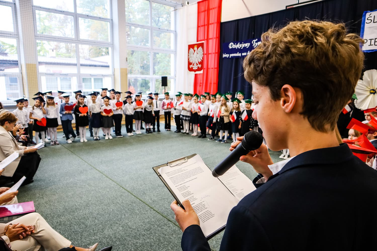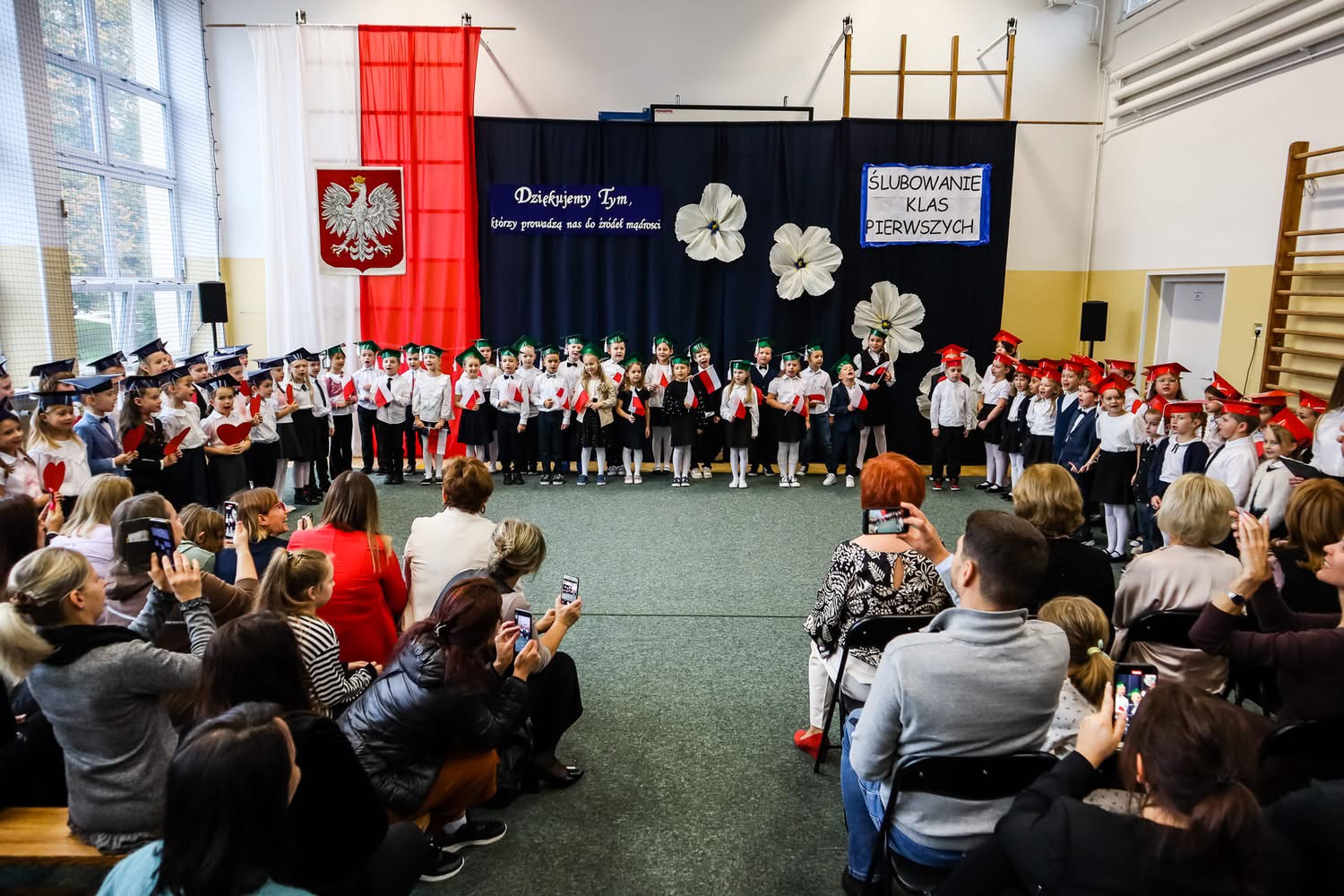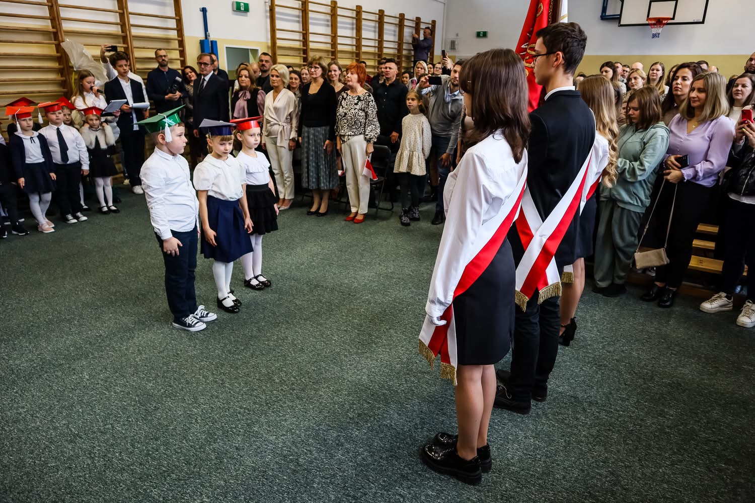 Te słowa wypowiedziały wszystkie pierwszaki w czasie uroczystości na sali gimnastycznej w dniu 14 października 2025 r. Dzieci recytowały również wiersze i śpiewały piosenki o tematyce szkolnej i patriotycznej.