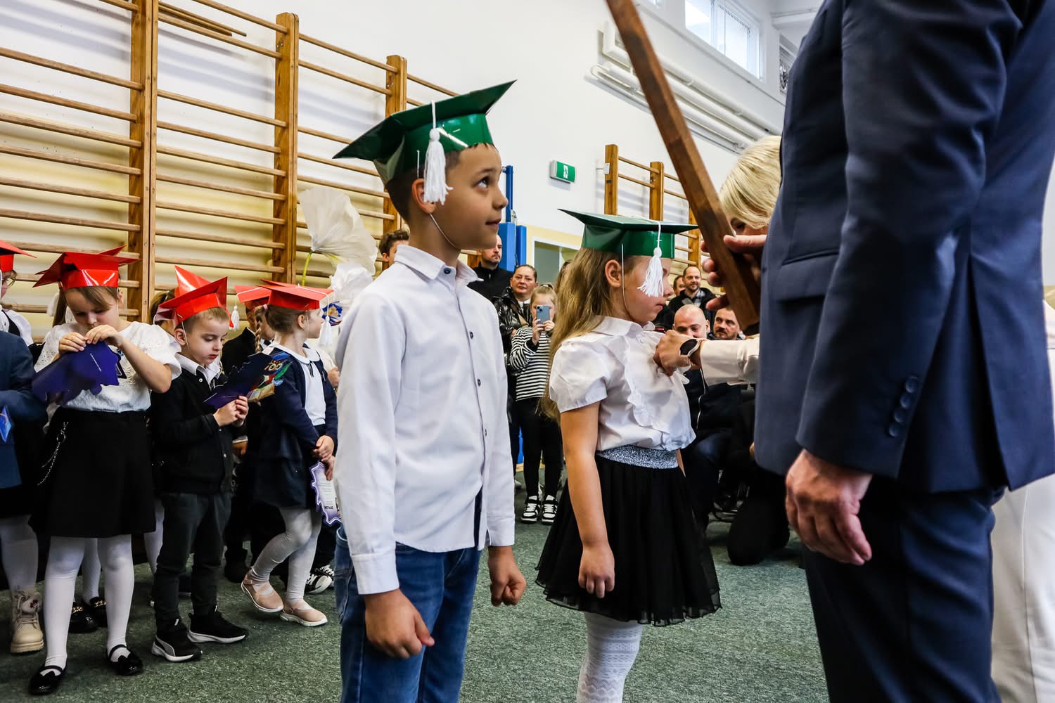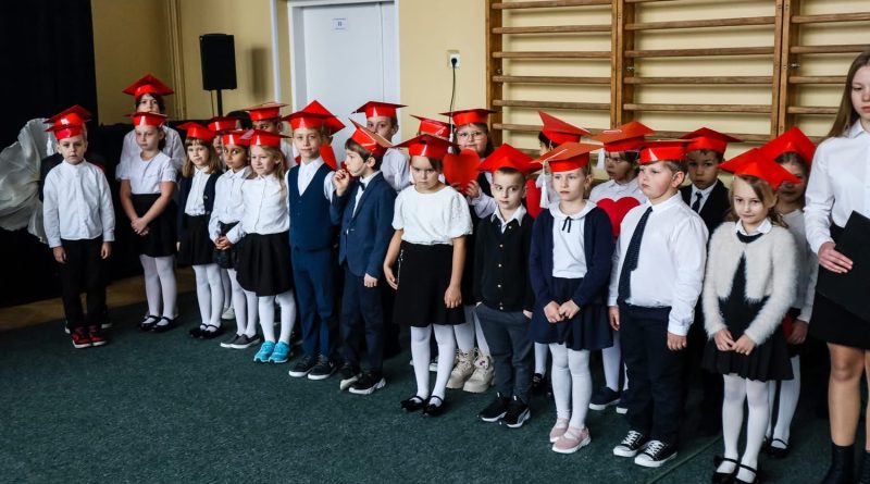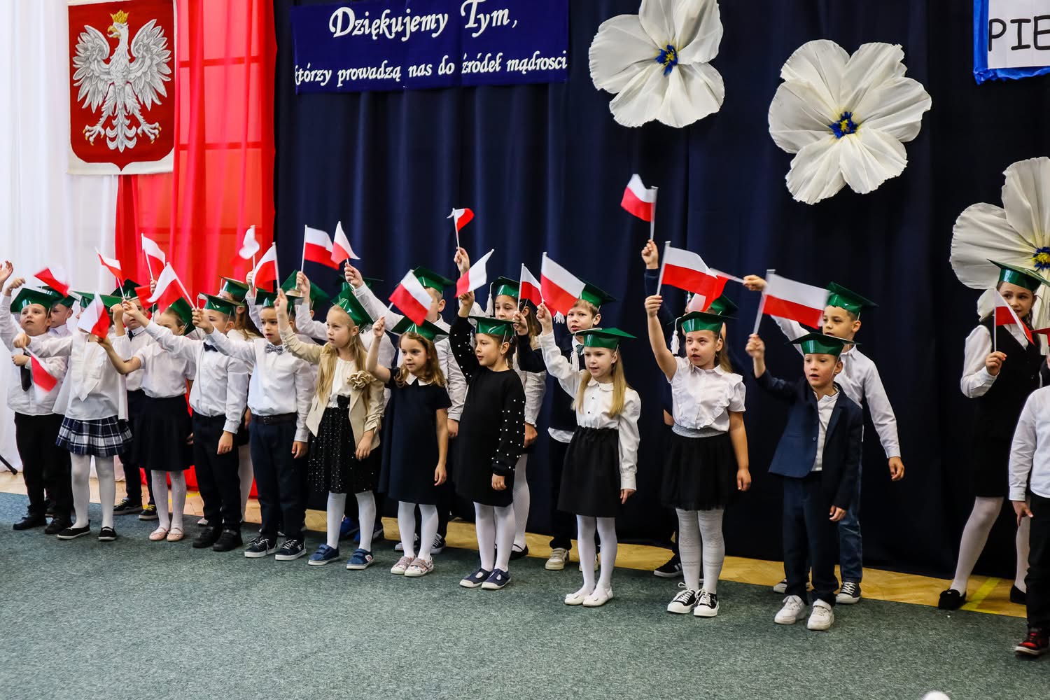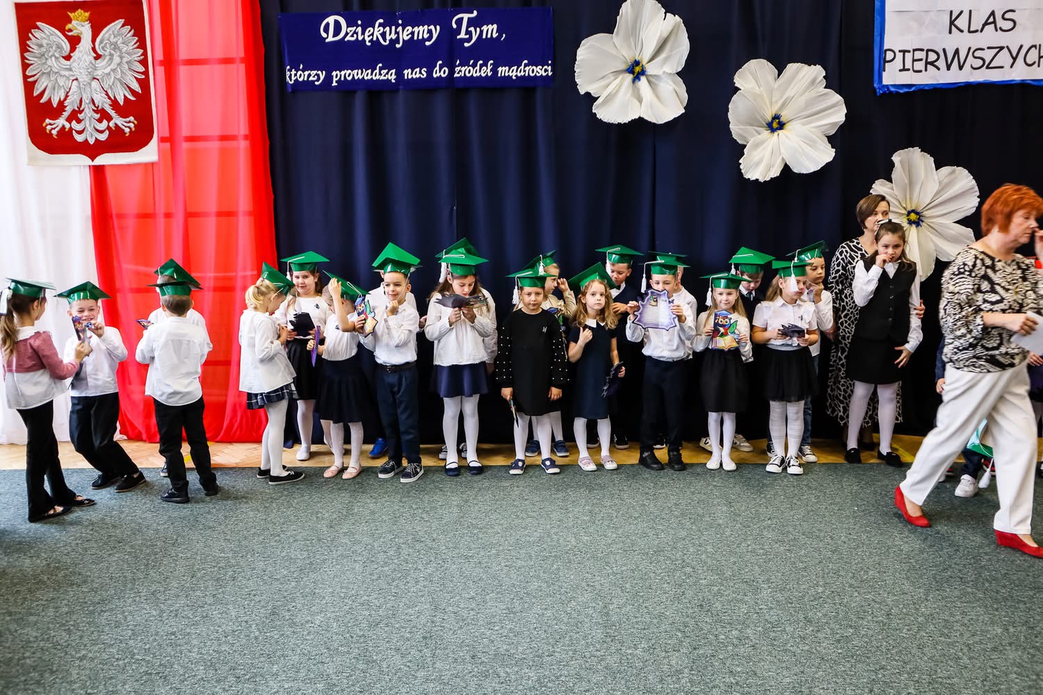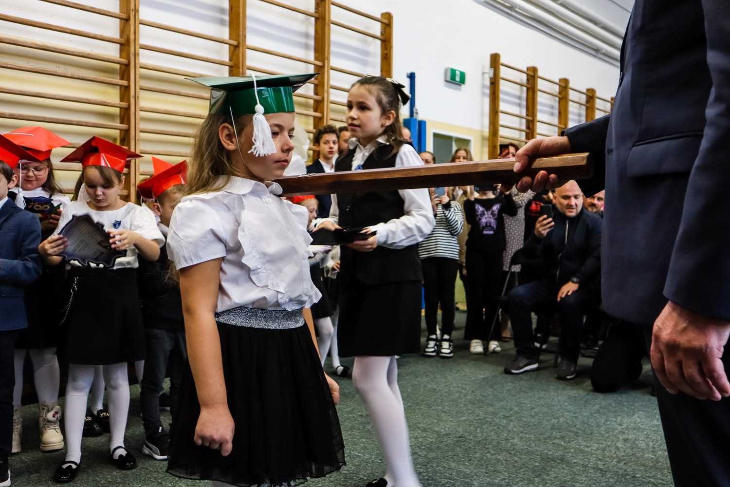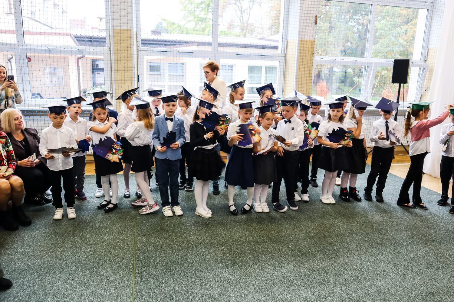 Te słowa wypowiedziały wszystkie pierwszaki w czasie uroczystości na sali gimnastycznej w dniu 14 października 2025 r. Dzieci recytowały również wiersze i śpiewały piosenki o tematyce szkolnej i patriotycznej.