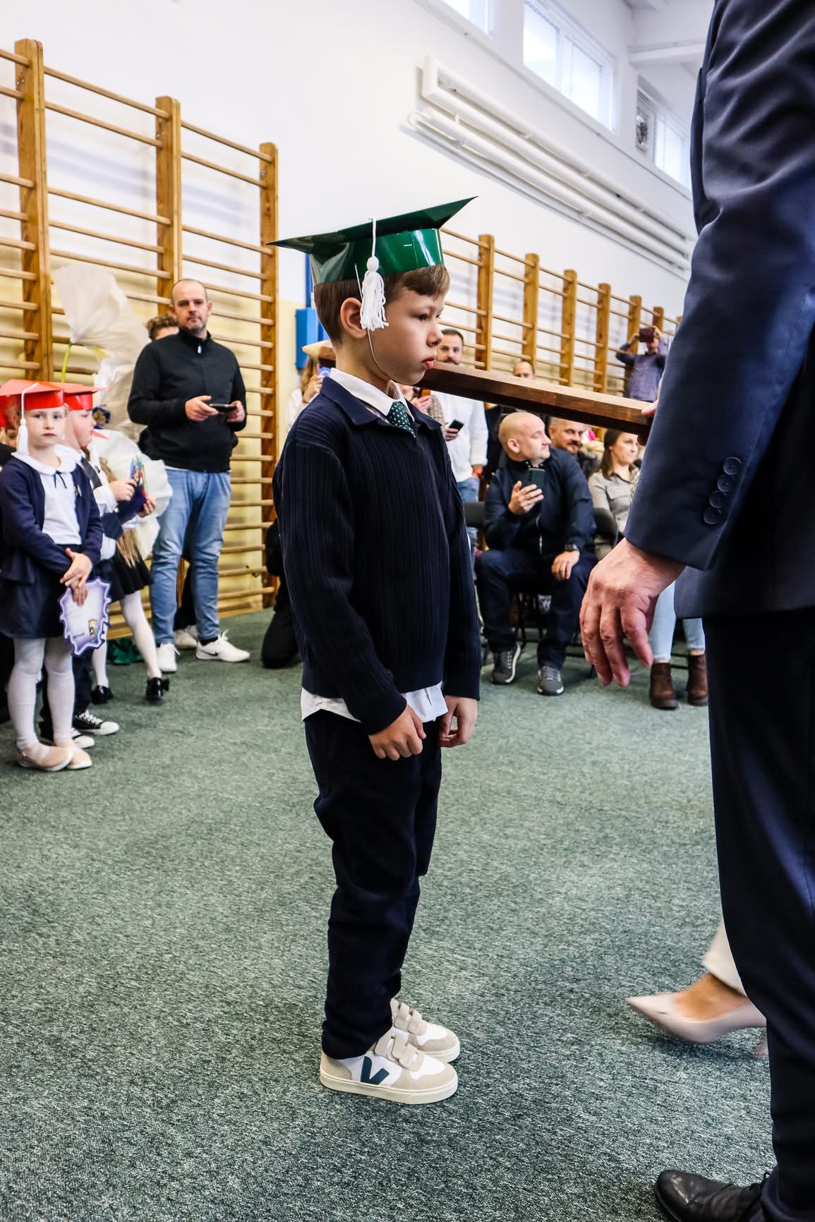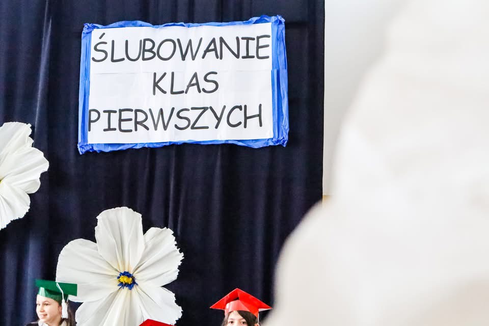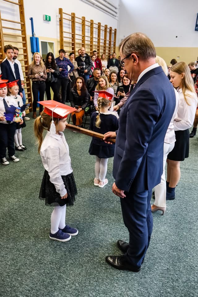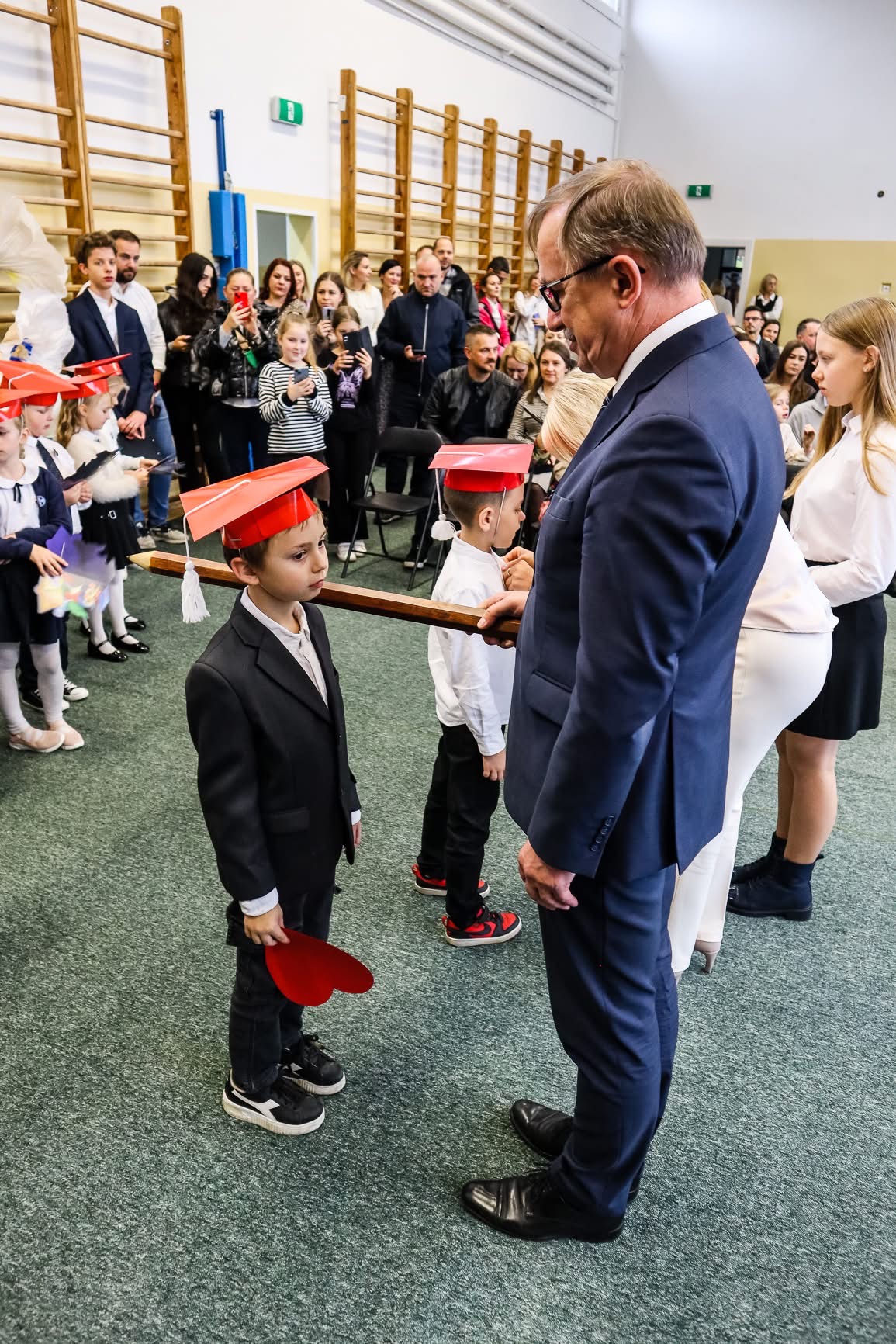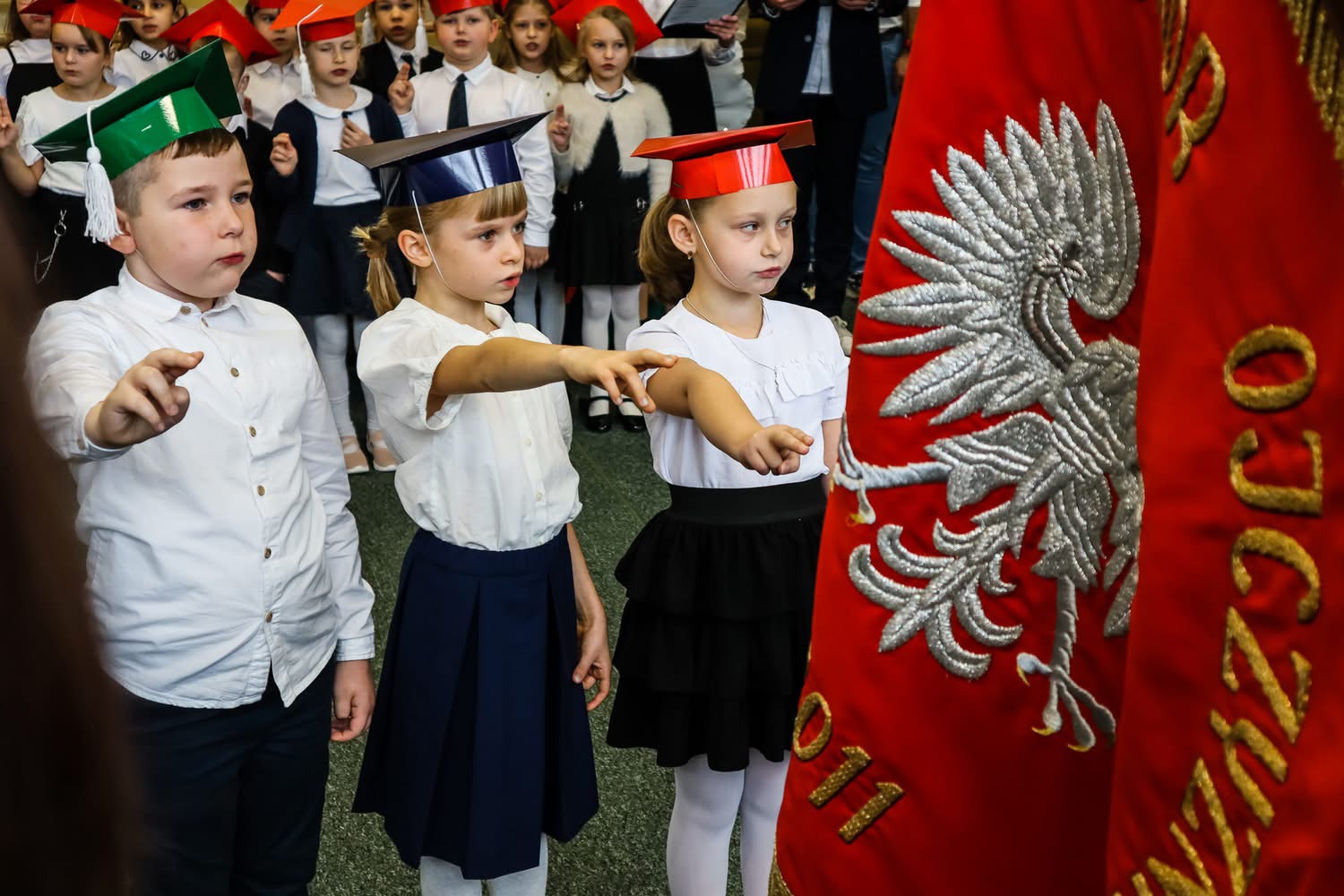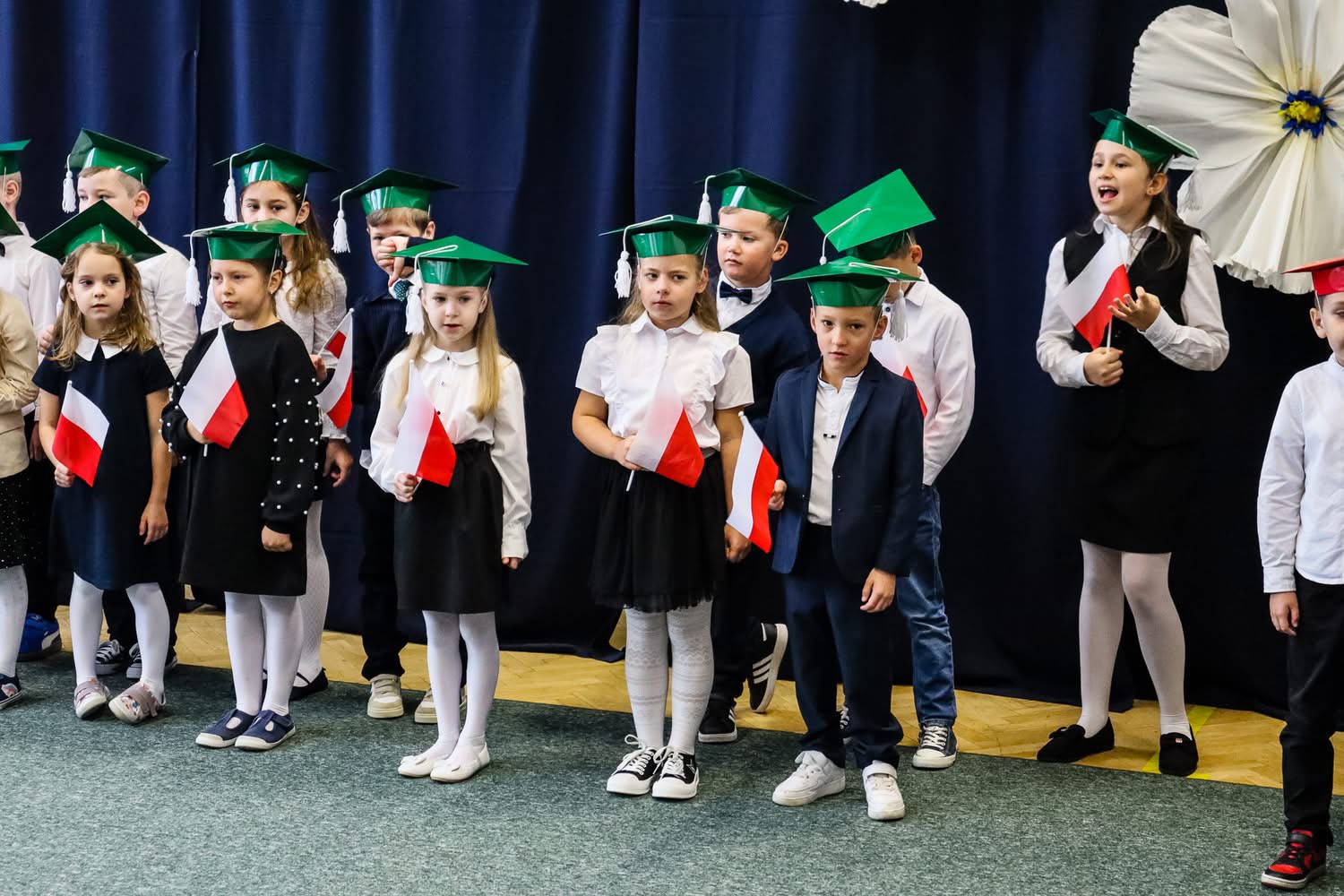 Te słowa wypowiedziały wszystkie pierwszaki w czasie uroczystości na sali gimnastycznej w dniu 14 października 2025 r. Dzieci recytowały również wiersze i śpiewały piosenki o tematyce szkolnej i patriotycznej.