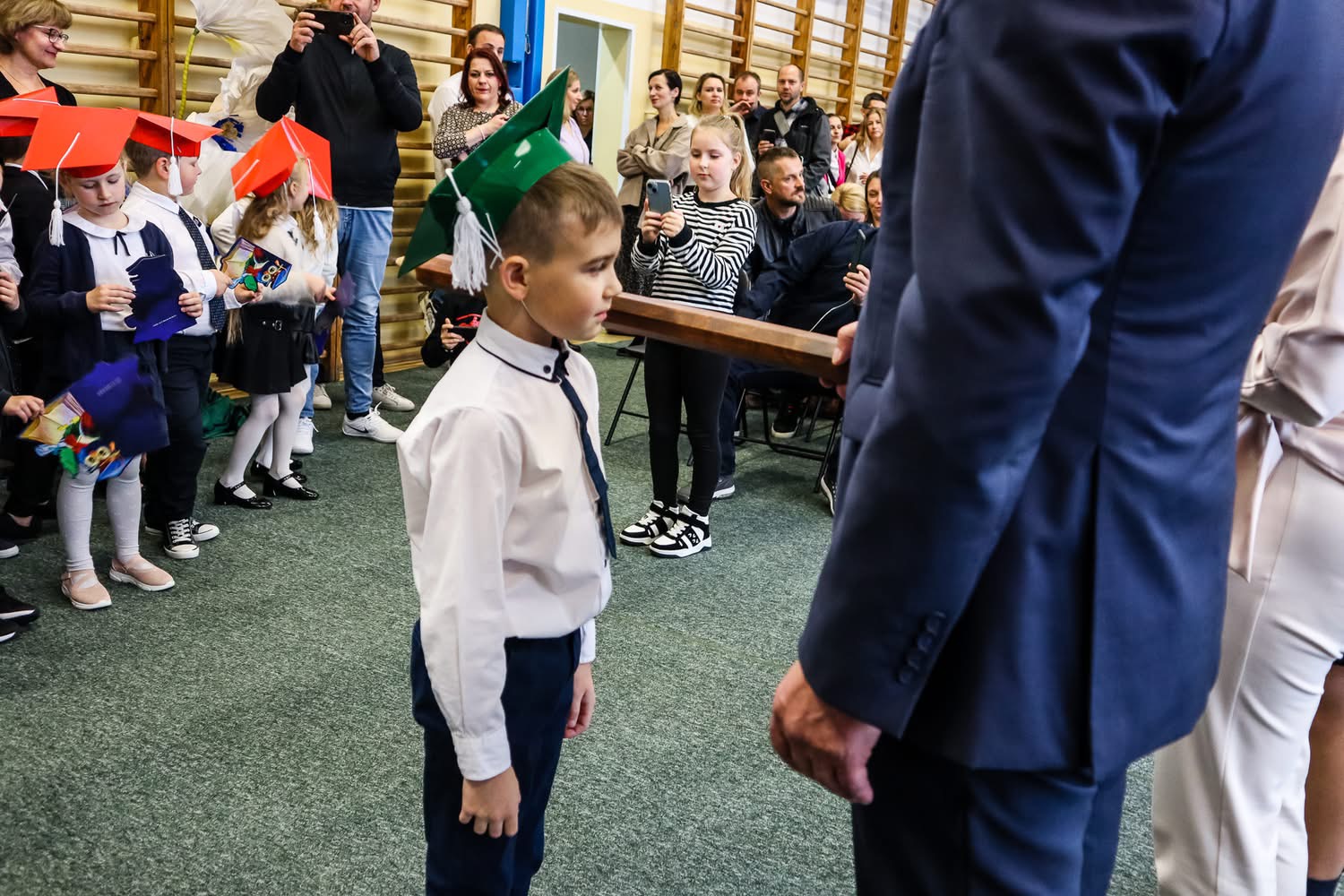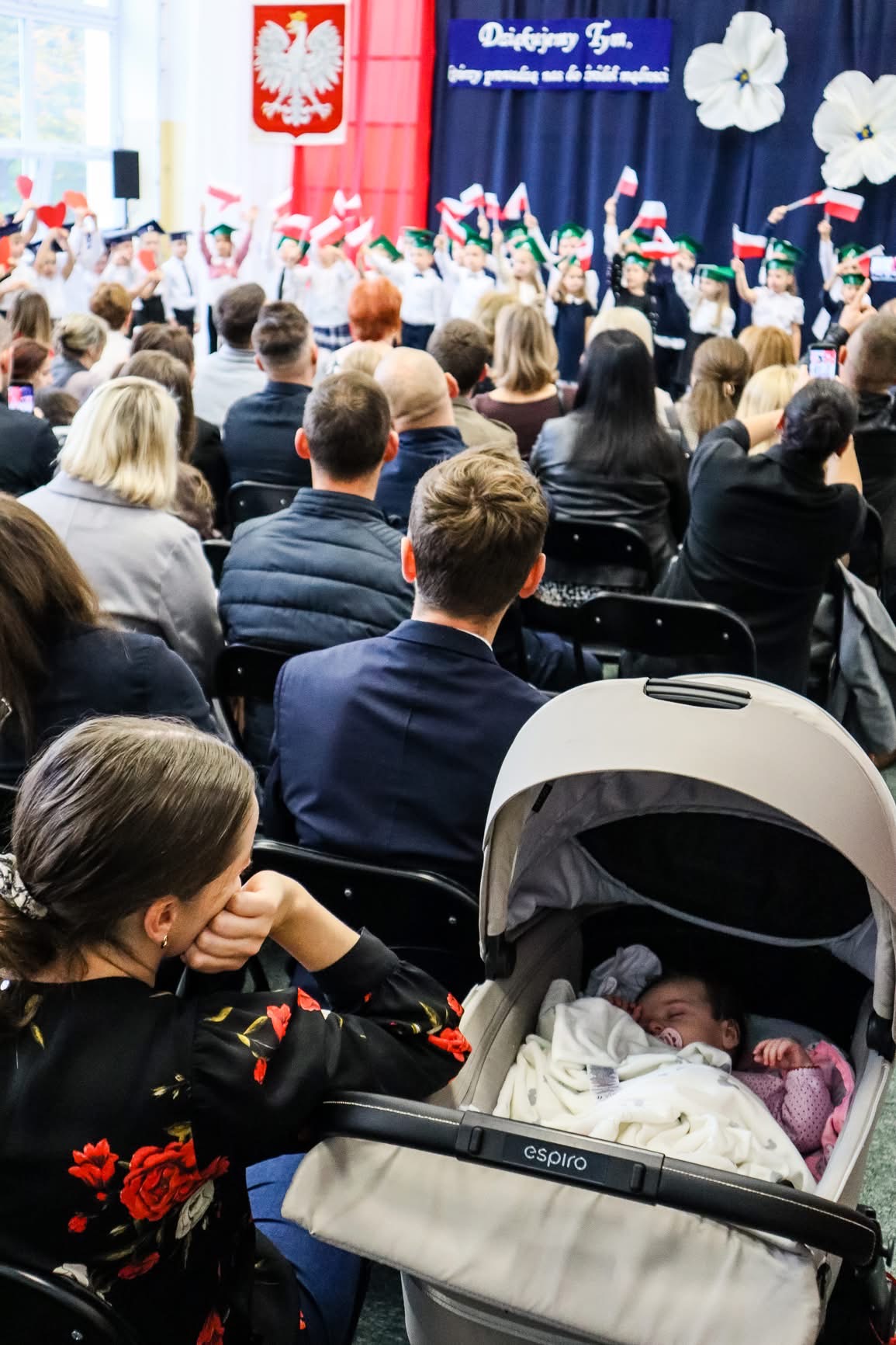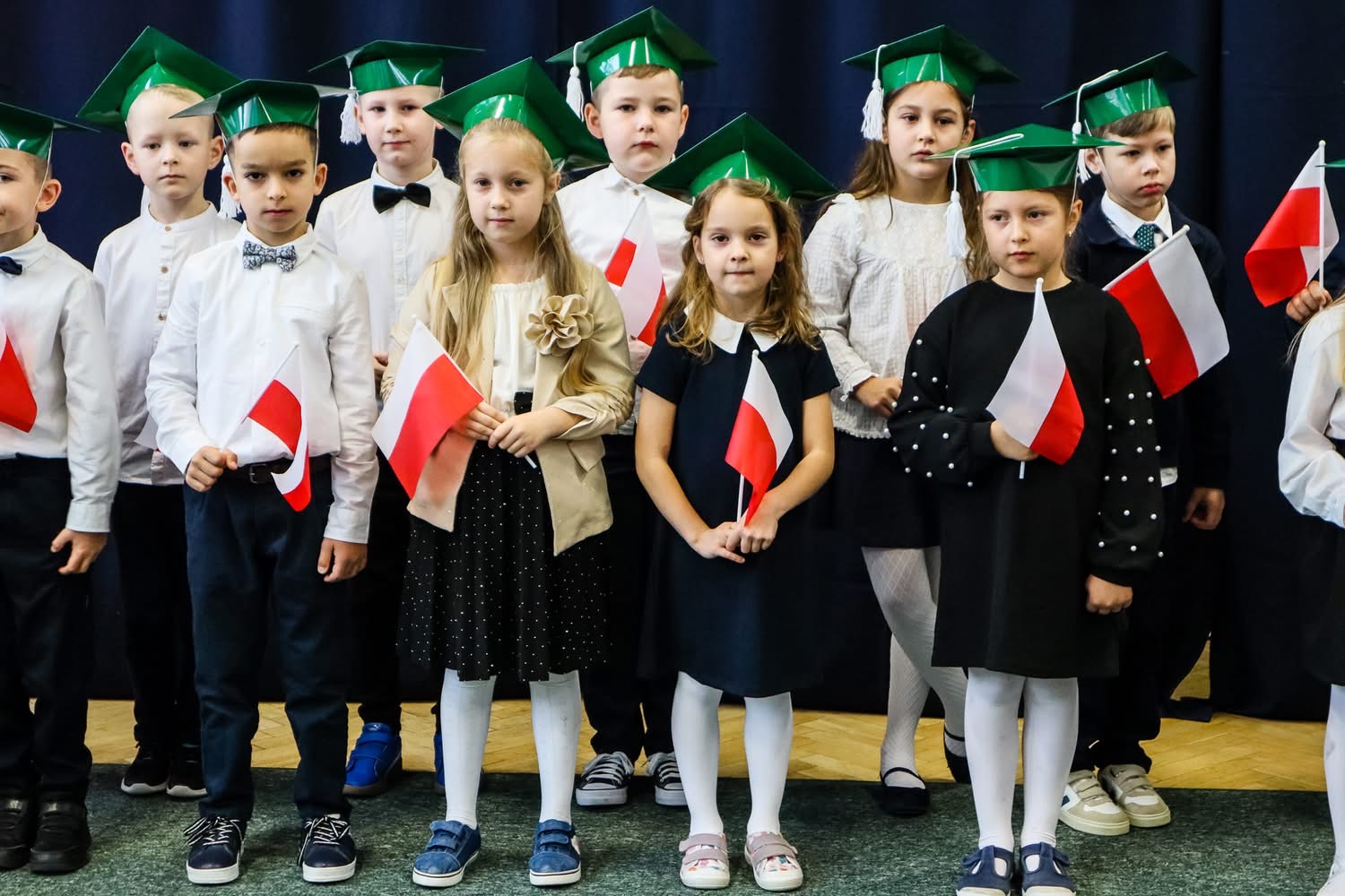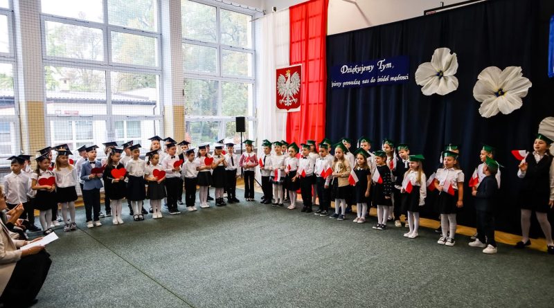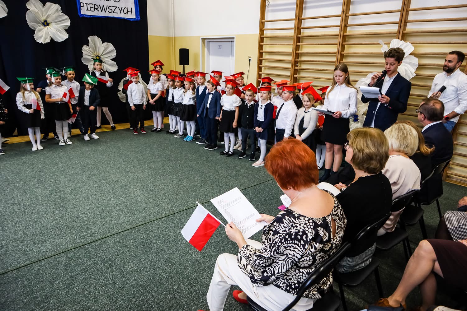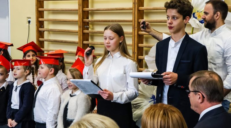 Te słowa wypowiedziały wszystkie pierwszaki w czasie uroczystości na sali gimnastycznej w dniu 14 października 2025 r. Dzieci recytowały również wiersze i śpiewały piosenki o tematyce szkolnej i patriotycznej.