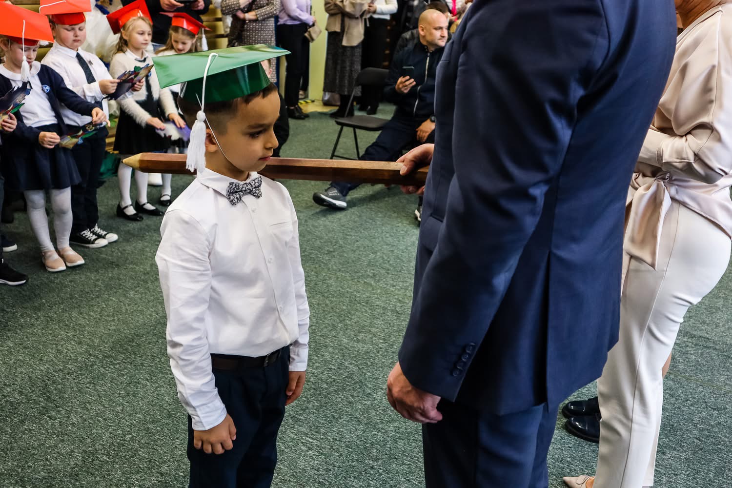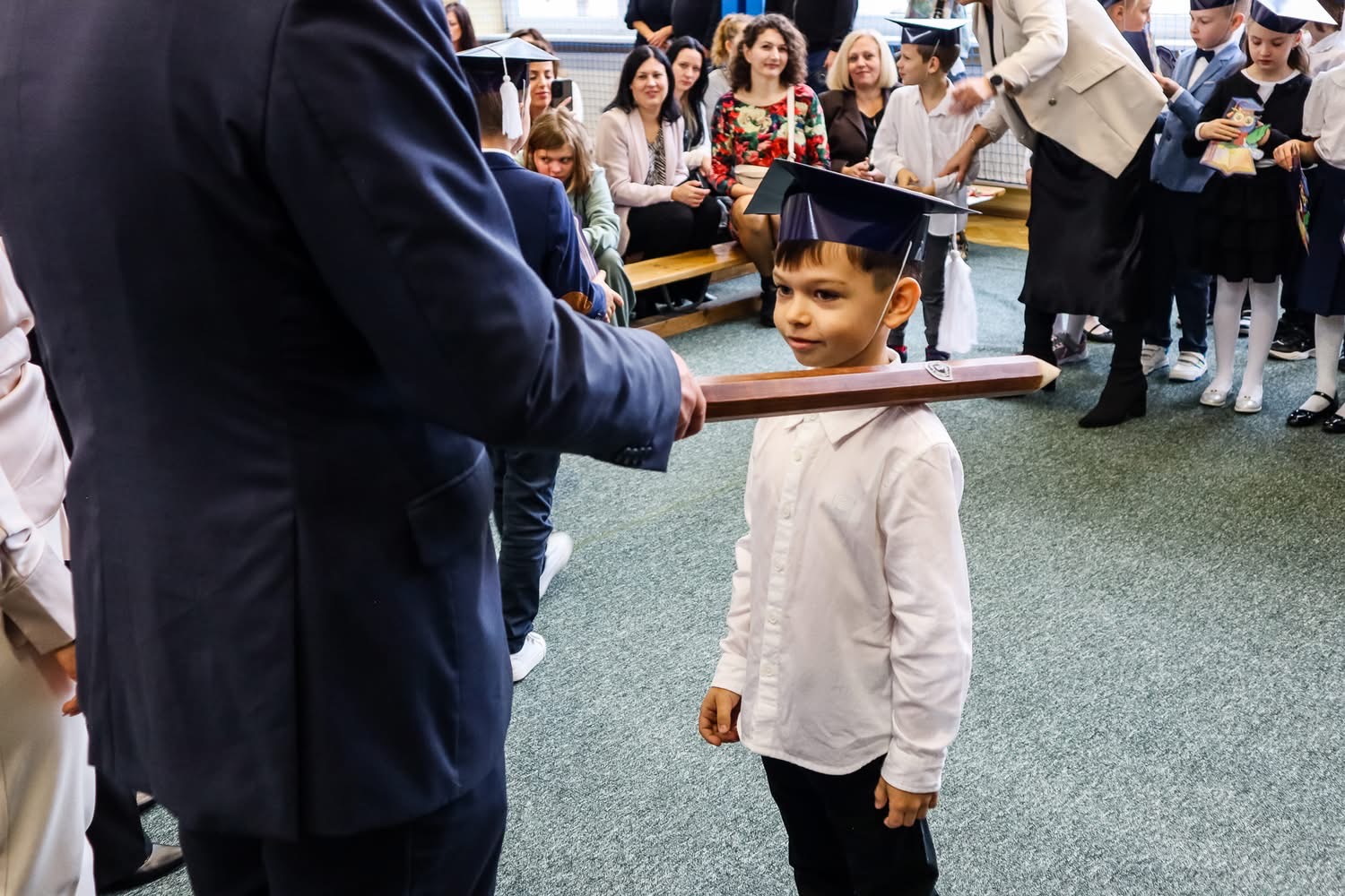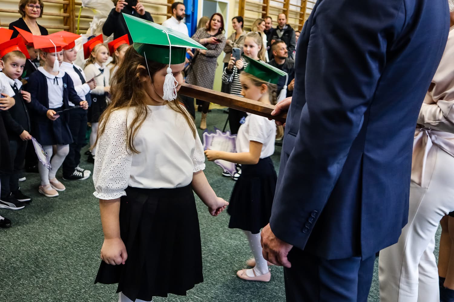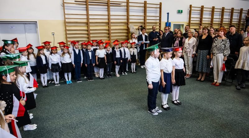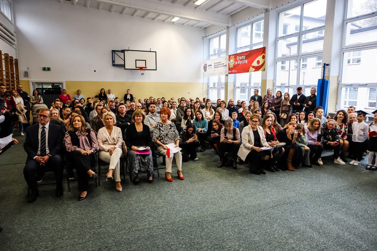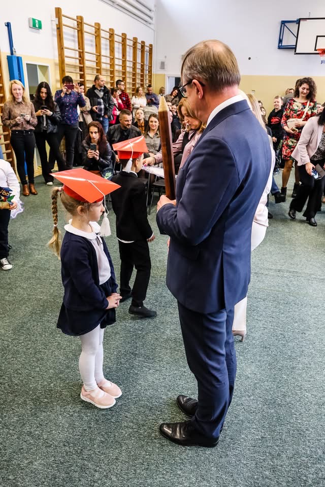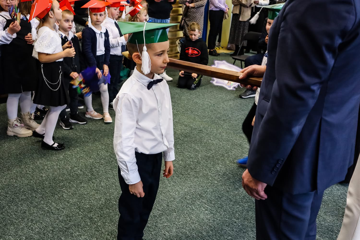 Te słowa wypowiedziały wszystkie pierwszaki w czasie uroczystości na sali gimnastycznej w dniu 14 października 2025 r. Dzieci recytowały również wiersze i śpiewały piosenki o tematyce szkolnej i patriotycznej.