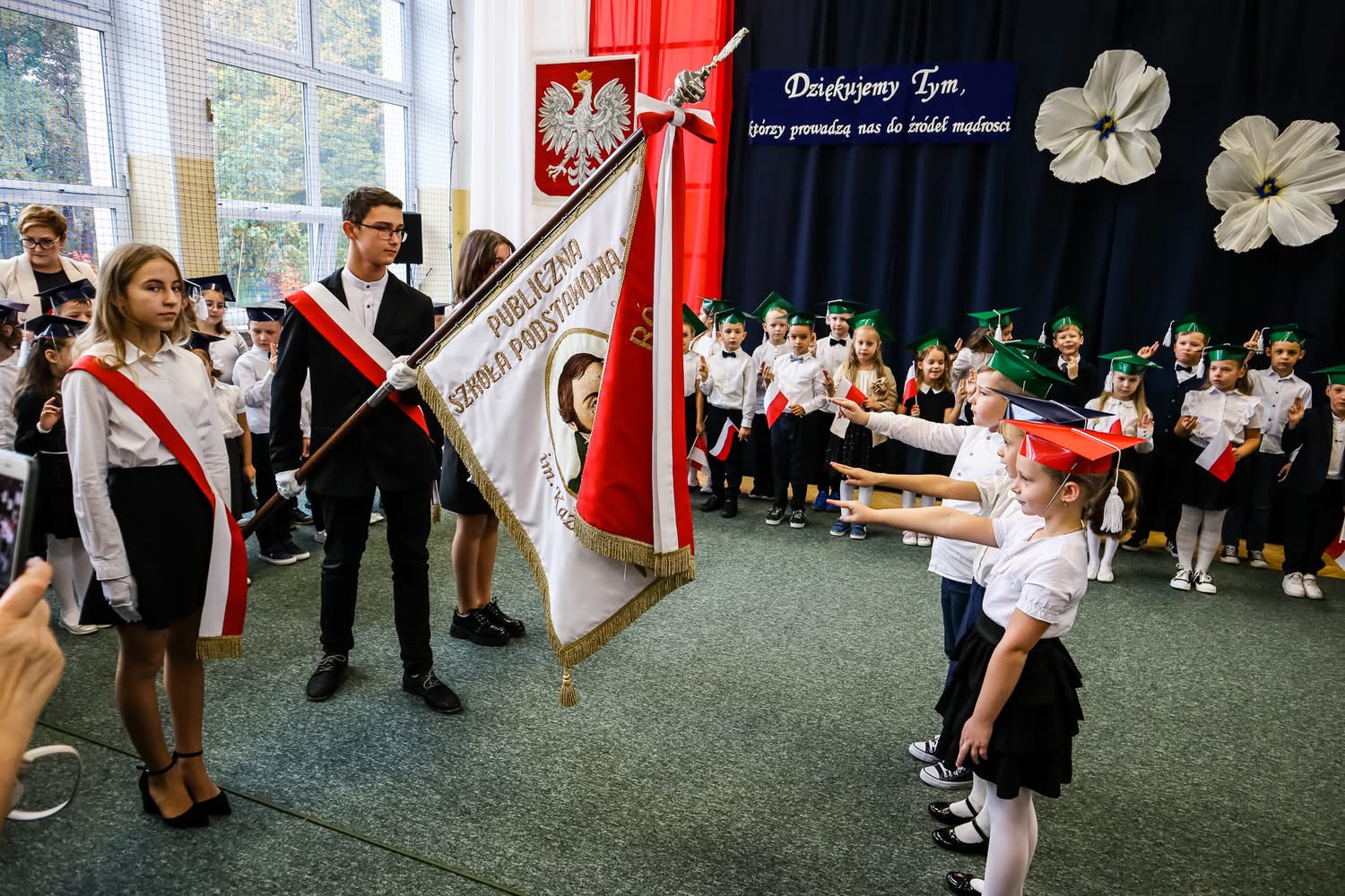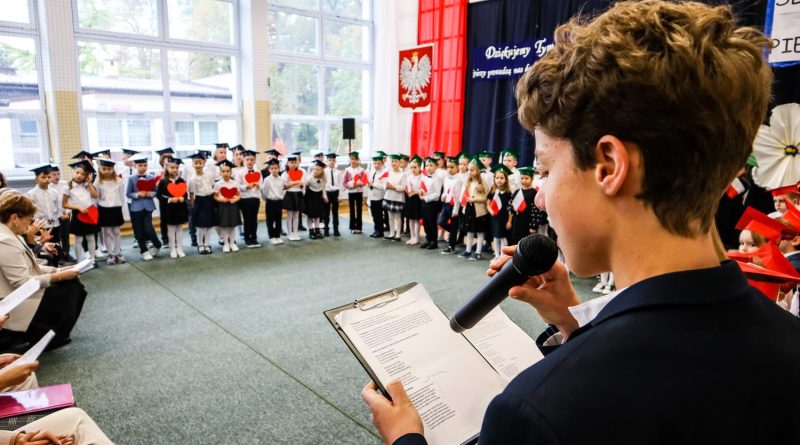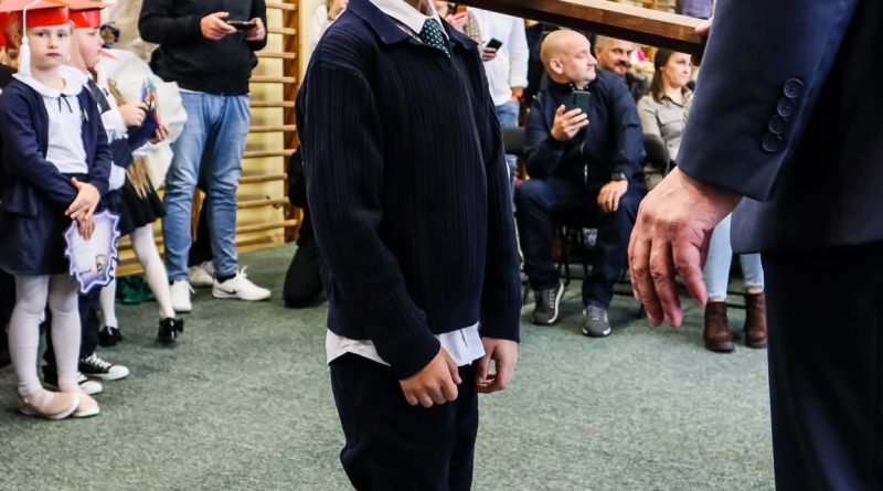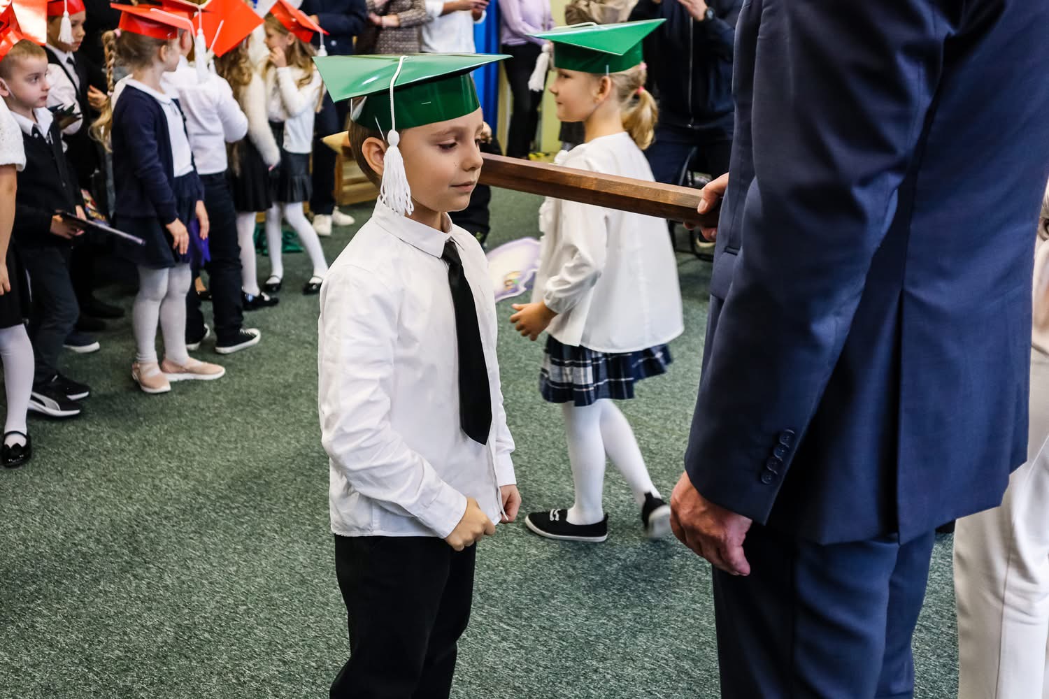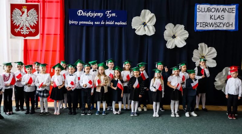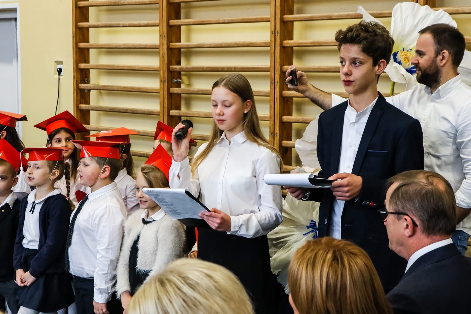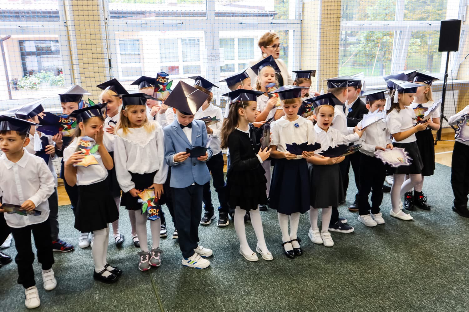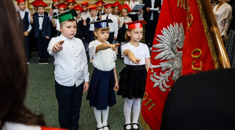 Te słowa wypowiedziały wszystkie pierwszaki w czasie uroczystości na sali gimnastycznej w dniu 14 października 2025 r. Dzieci recytowały również wiersze i śpiewały piosenki o tematyce szkolnej i patriotycznej.