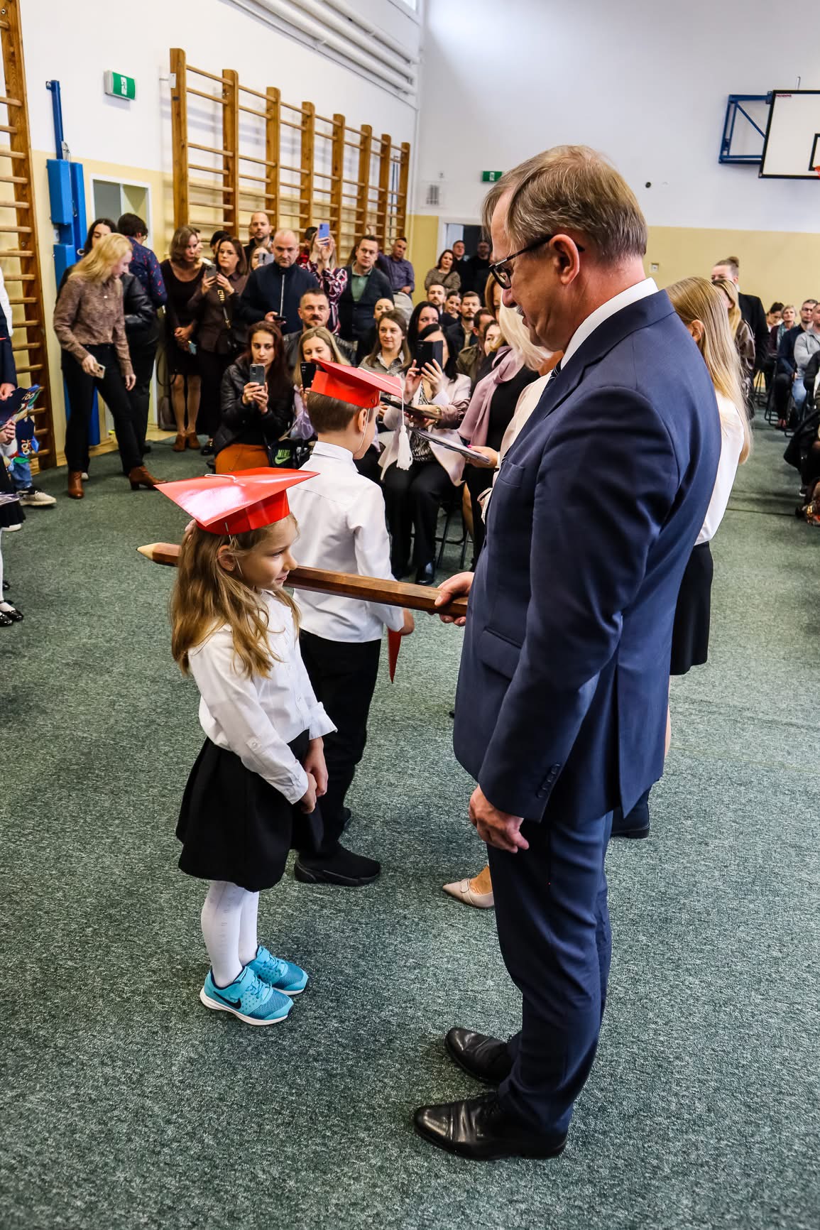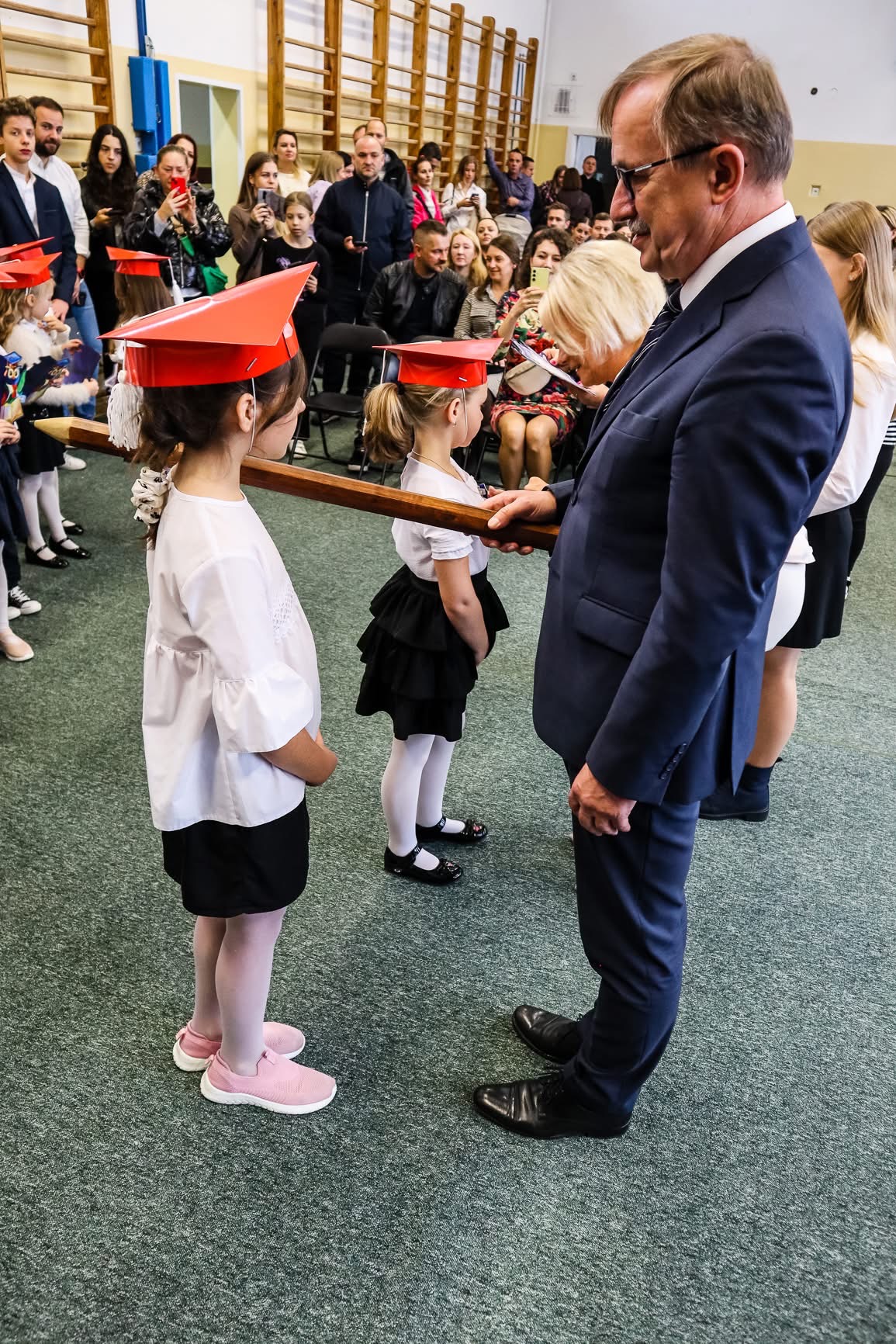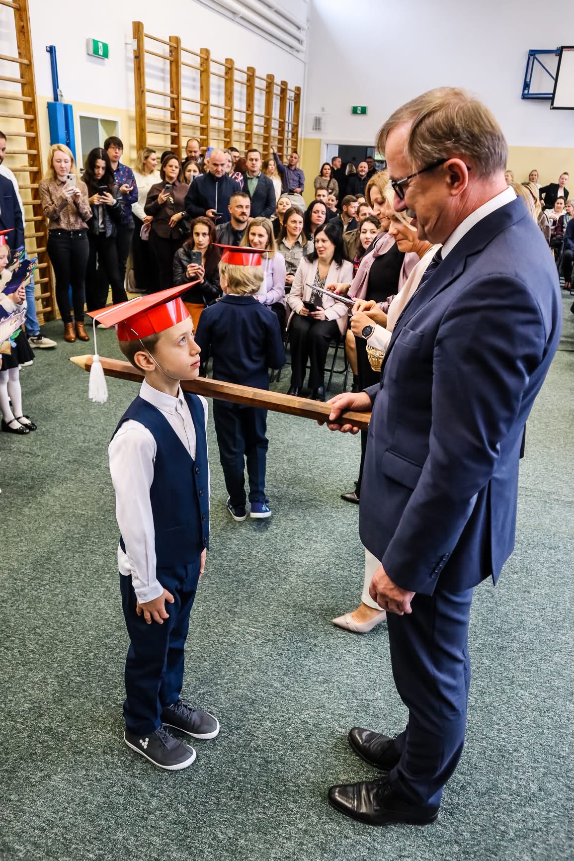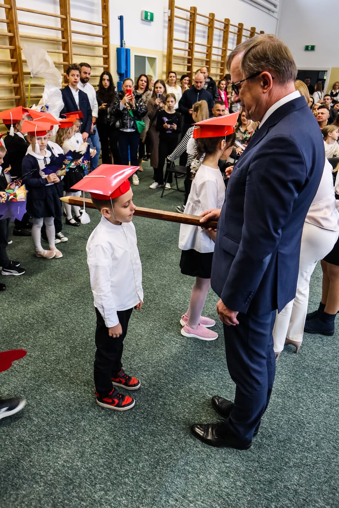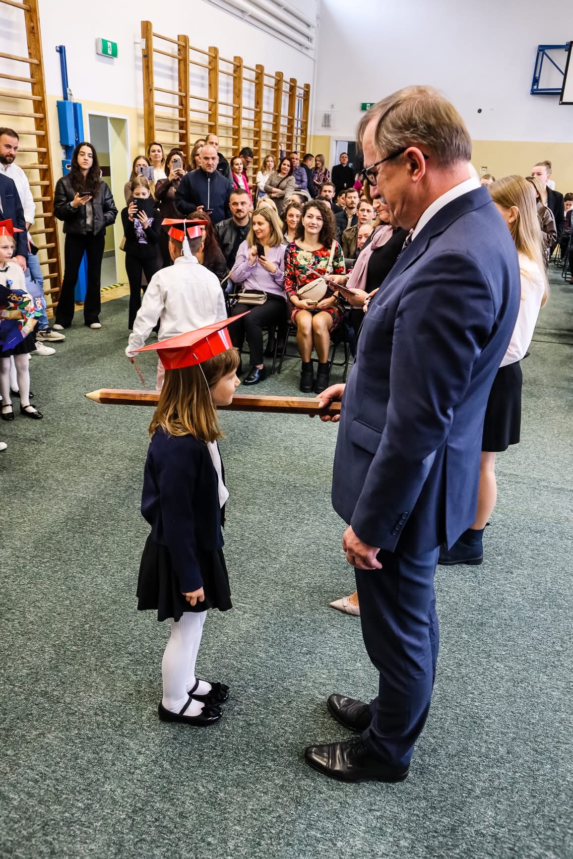 Dyrektor szkoły p. Zbigniew Solak symbolicznym ołówkiem pasował każdego pierwszaka na ucznia, a na pamiątkę tego wydarzenia dzieci otrzymały szkolne tarcze oraz okolicznościowe dyplomy.