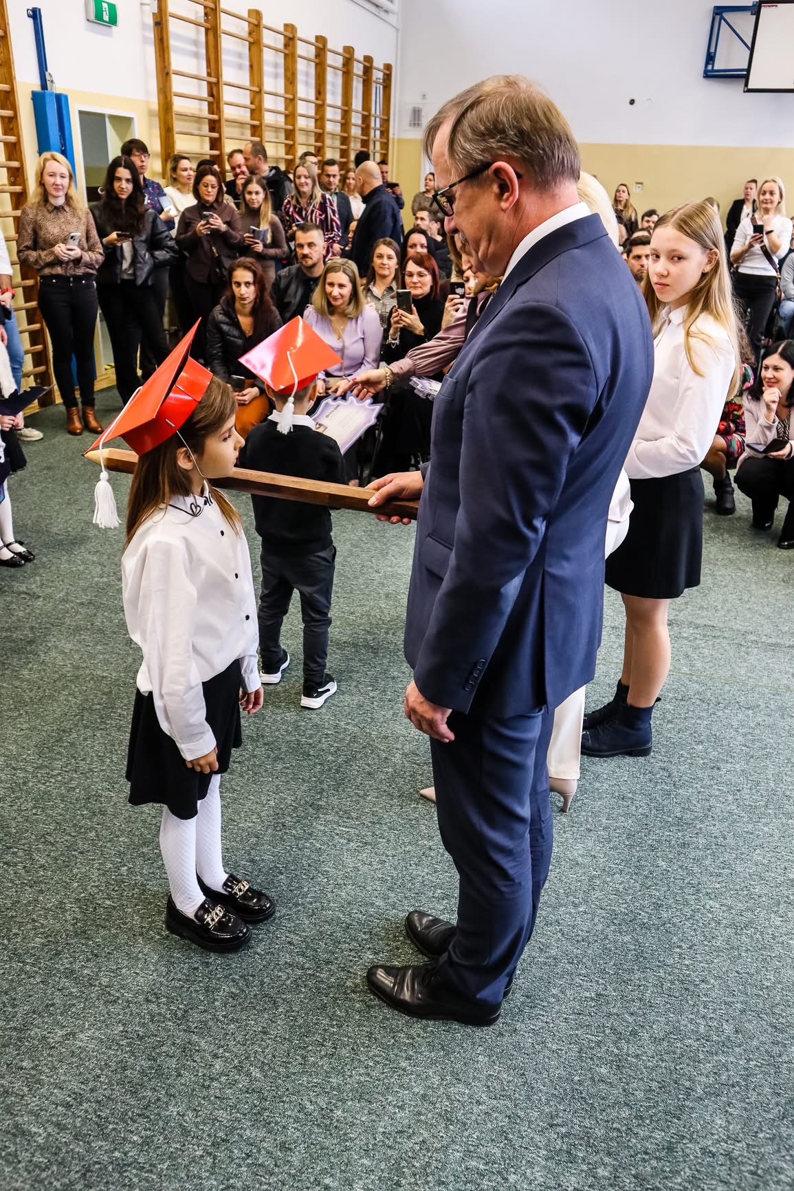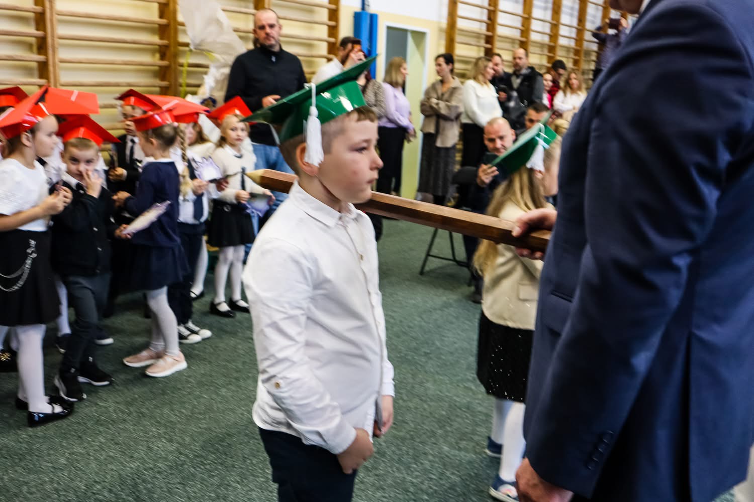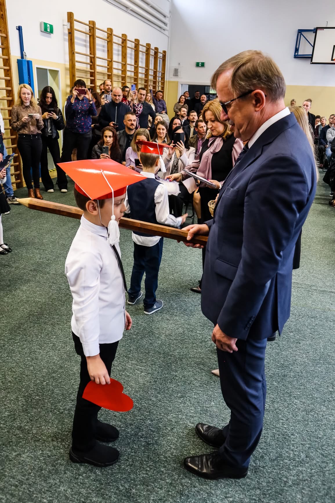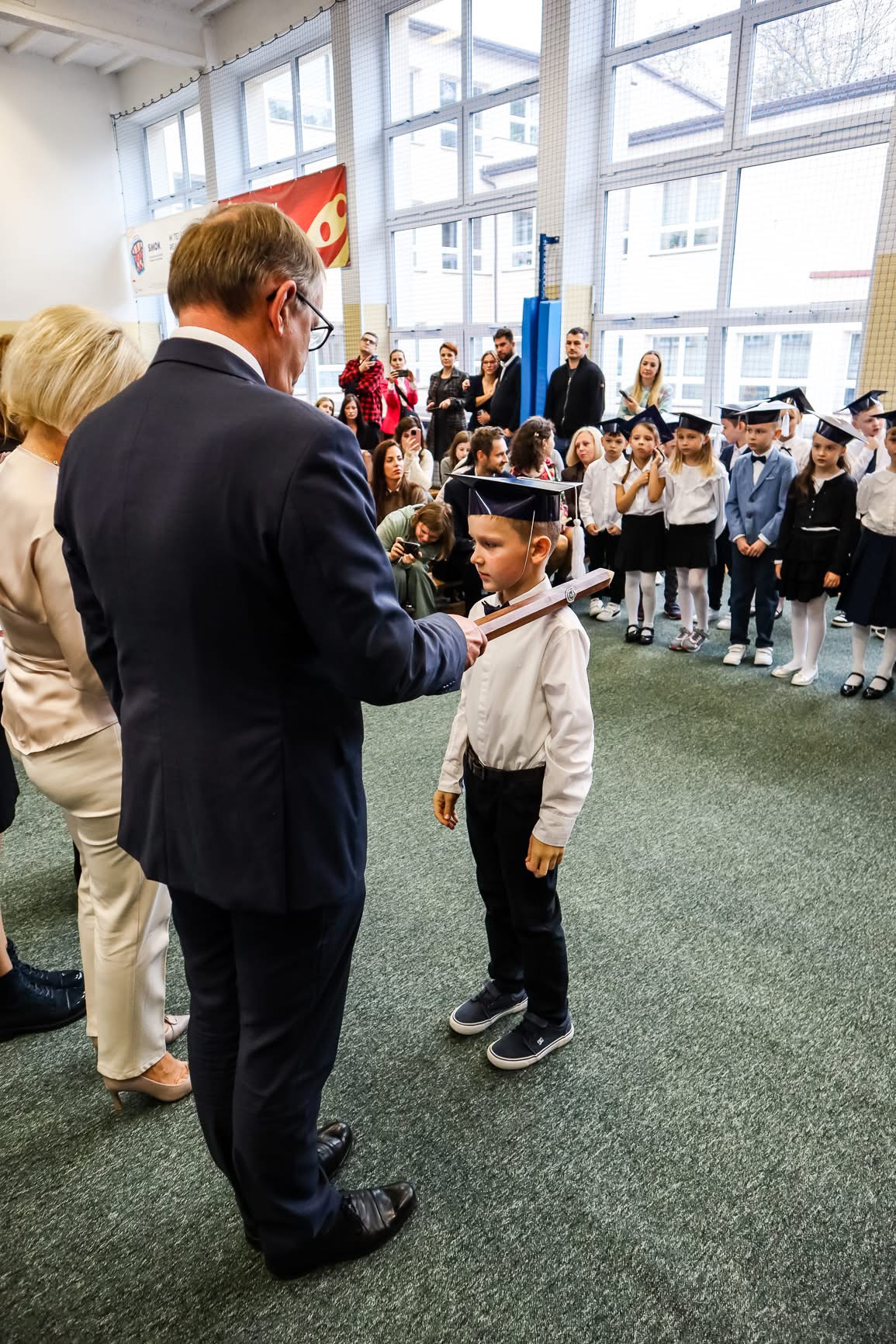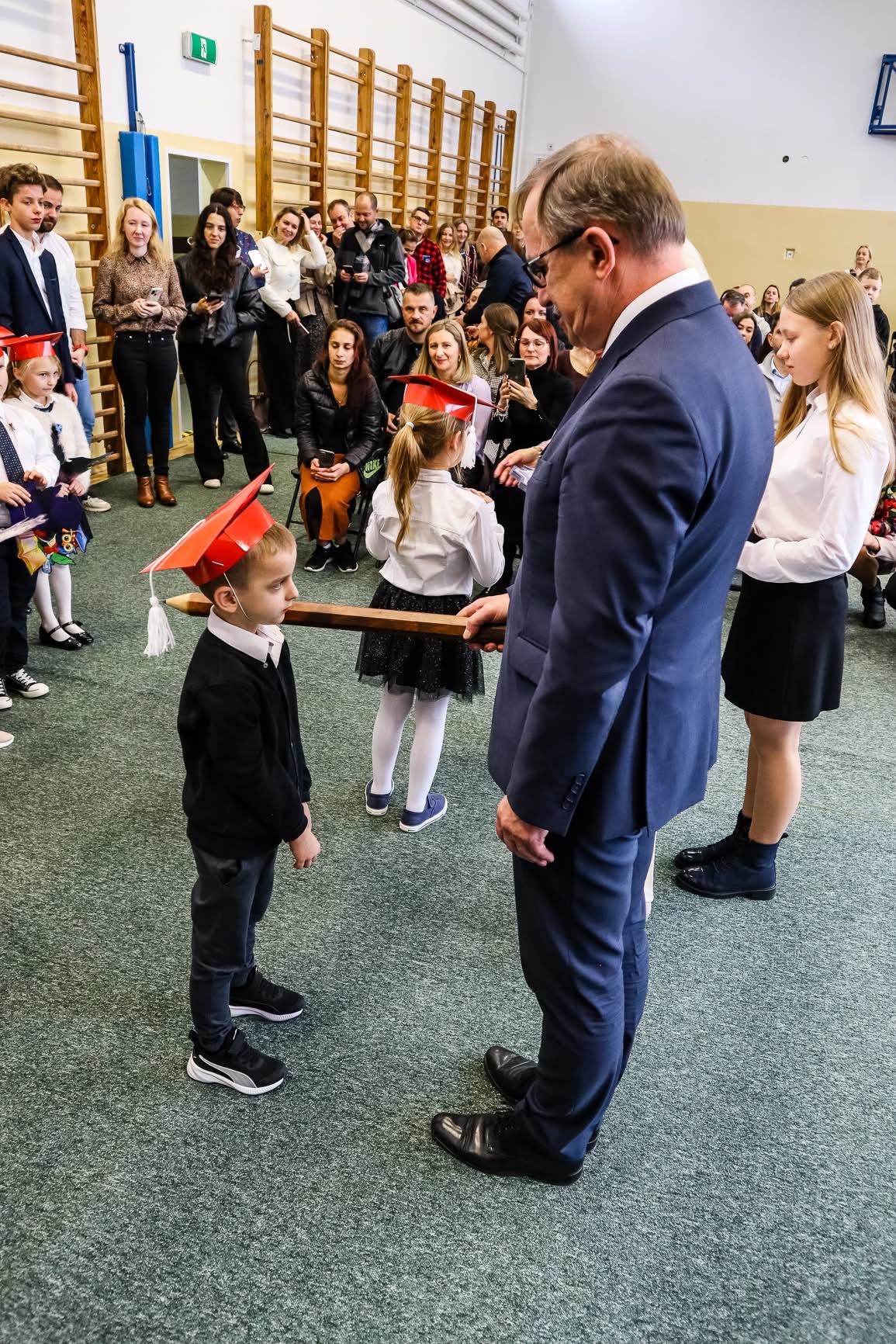 Dyrektor szkoły p. Zbigniew Solak symbolicznym ołówkiem pasował każdego pierwszaka na ucznia, a na pamiątkę tego wydarzenia dzieci otrzymały szkolne tarcze oraz okolicznościowe dyplomy.