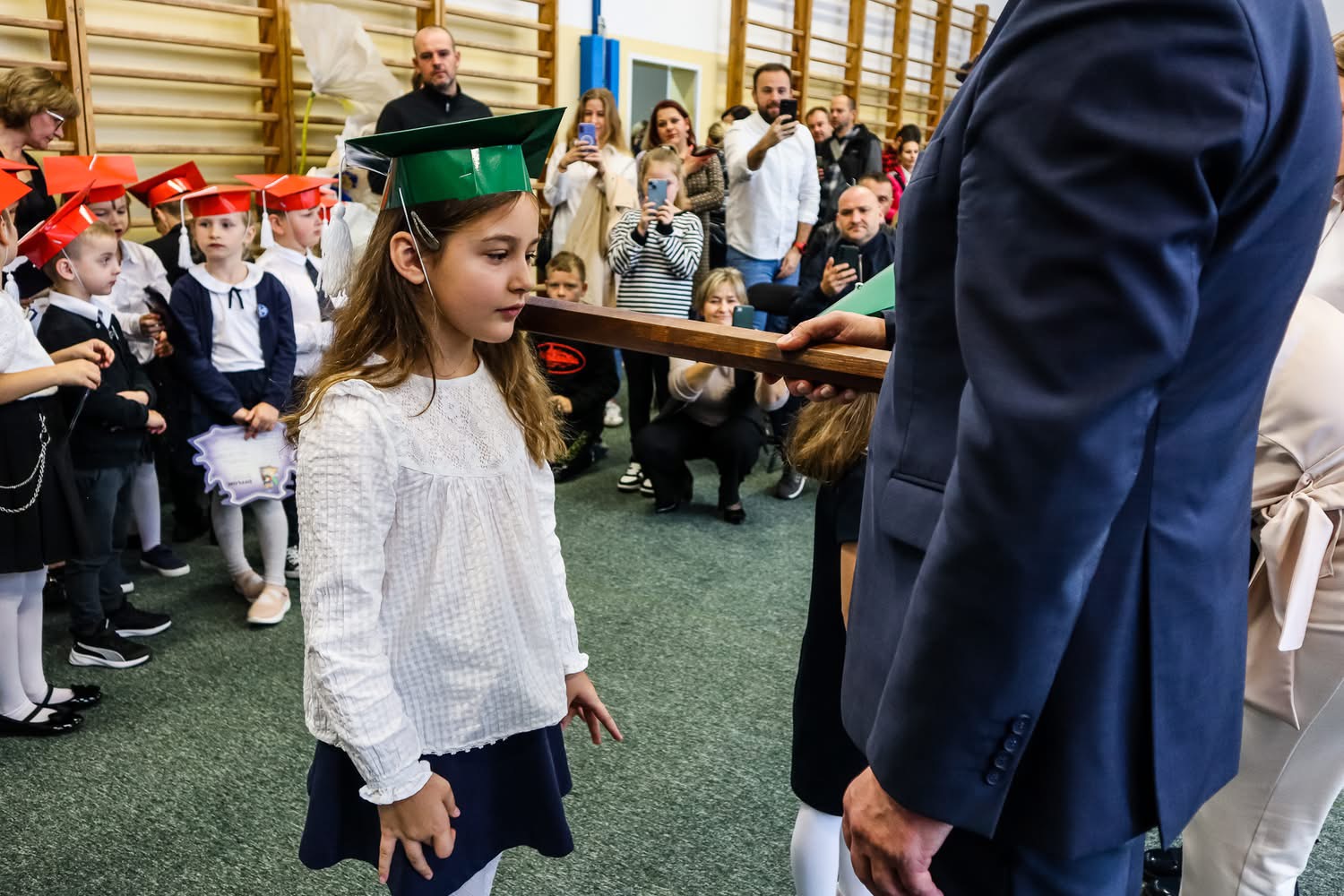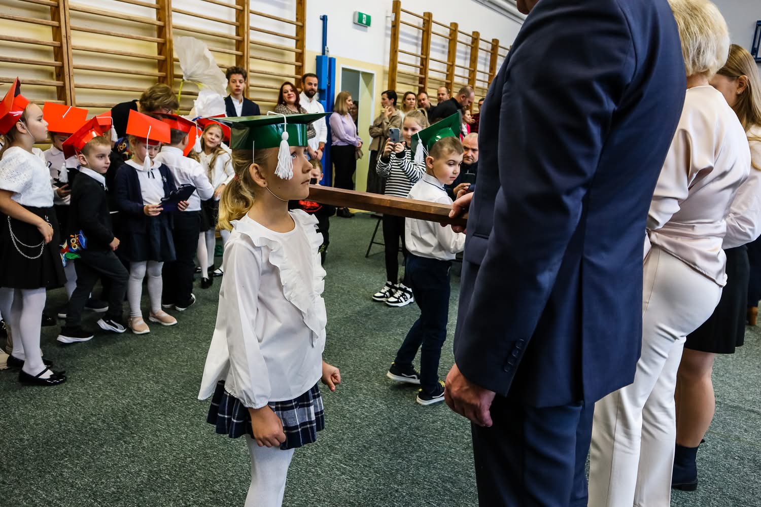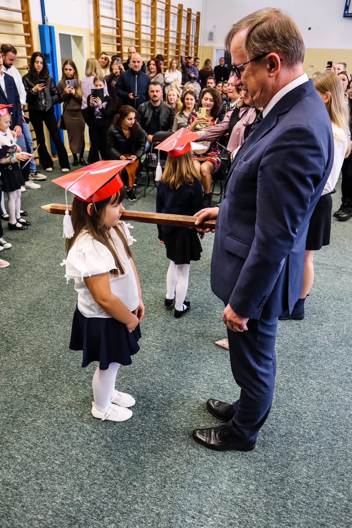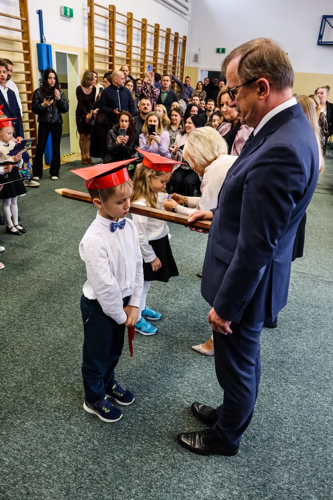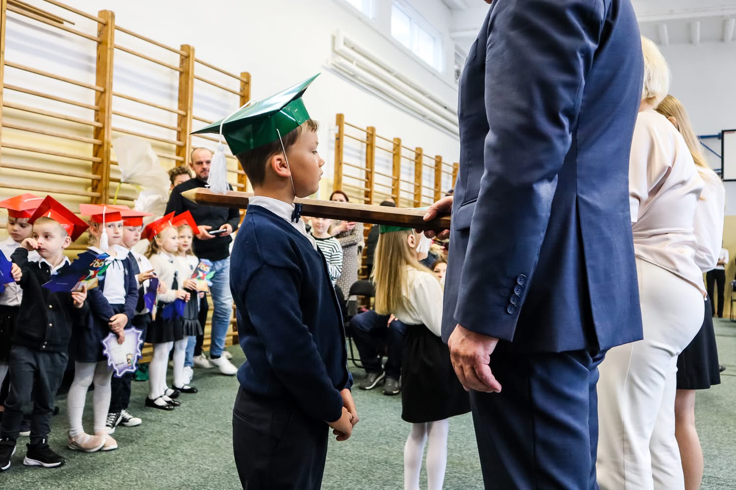 Dyrektor szkoły p. Zbigniew Solak symbolicznym ołówkiem pasował każdego pierwszaka na ucznia, a na pamiątkę tego wydarzenia dzieci otrzymały szkolne tarcze oraz okolicznościowe dyplomy.