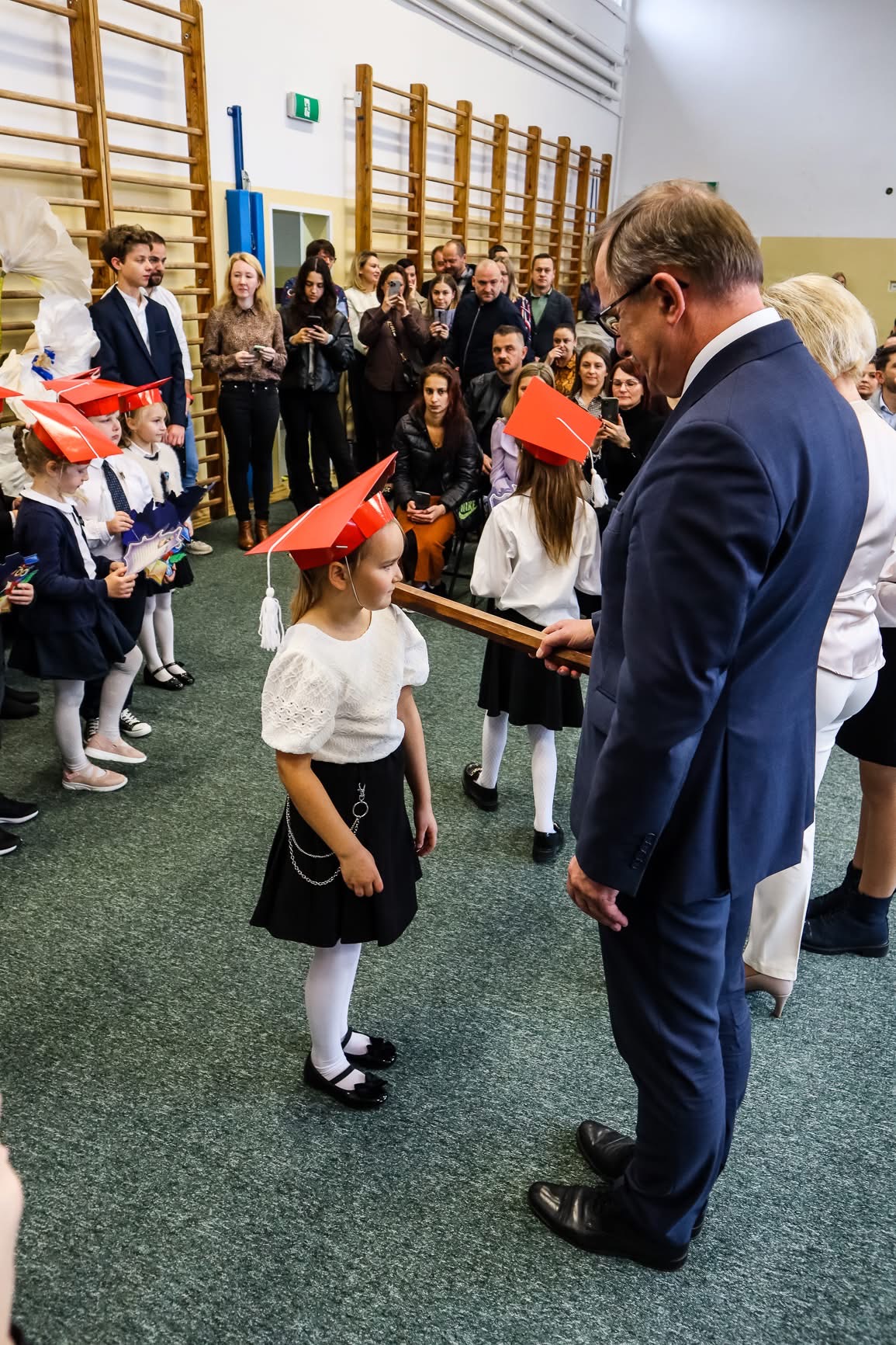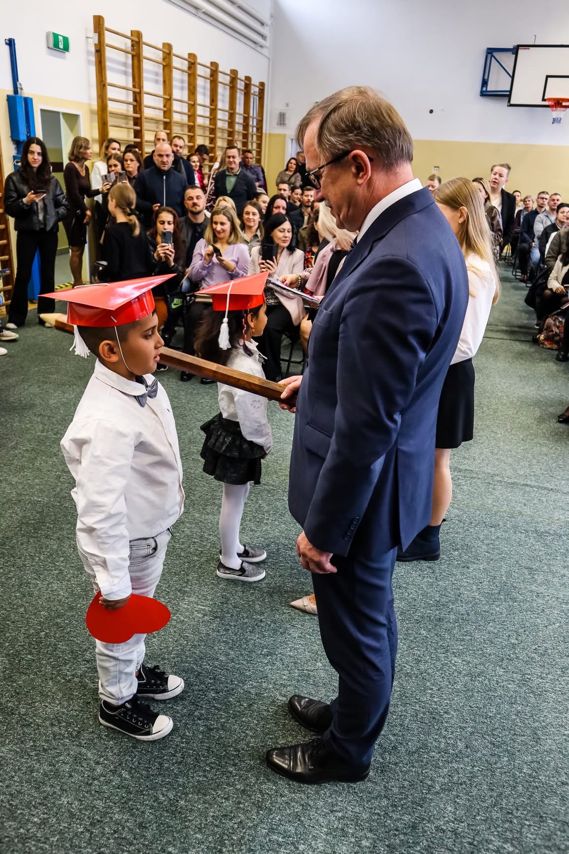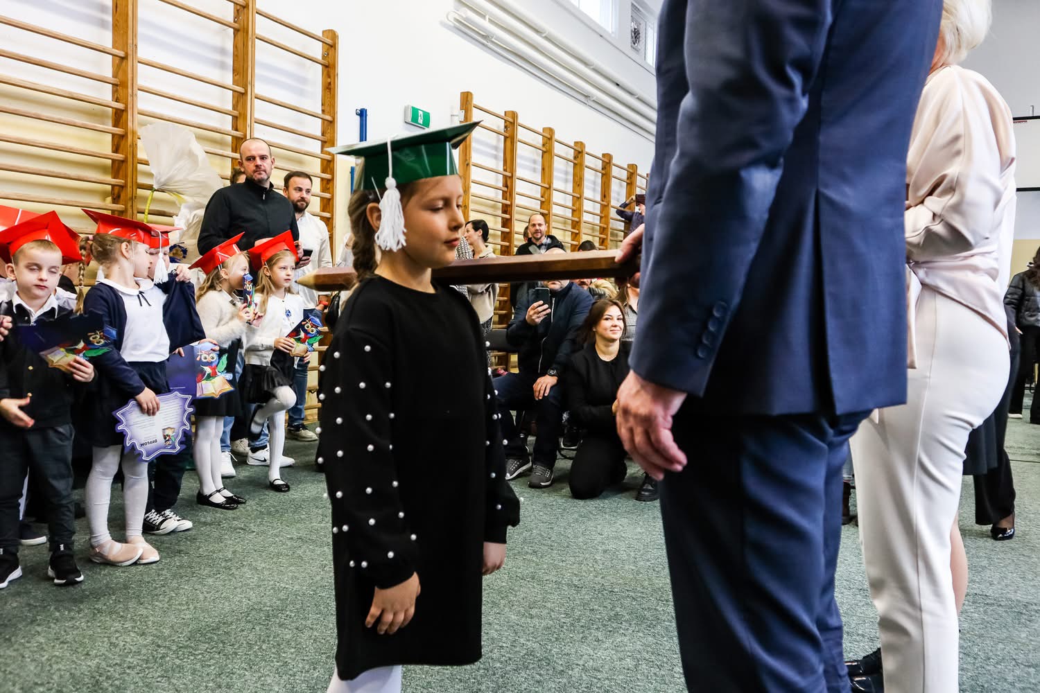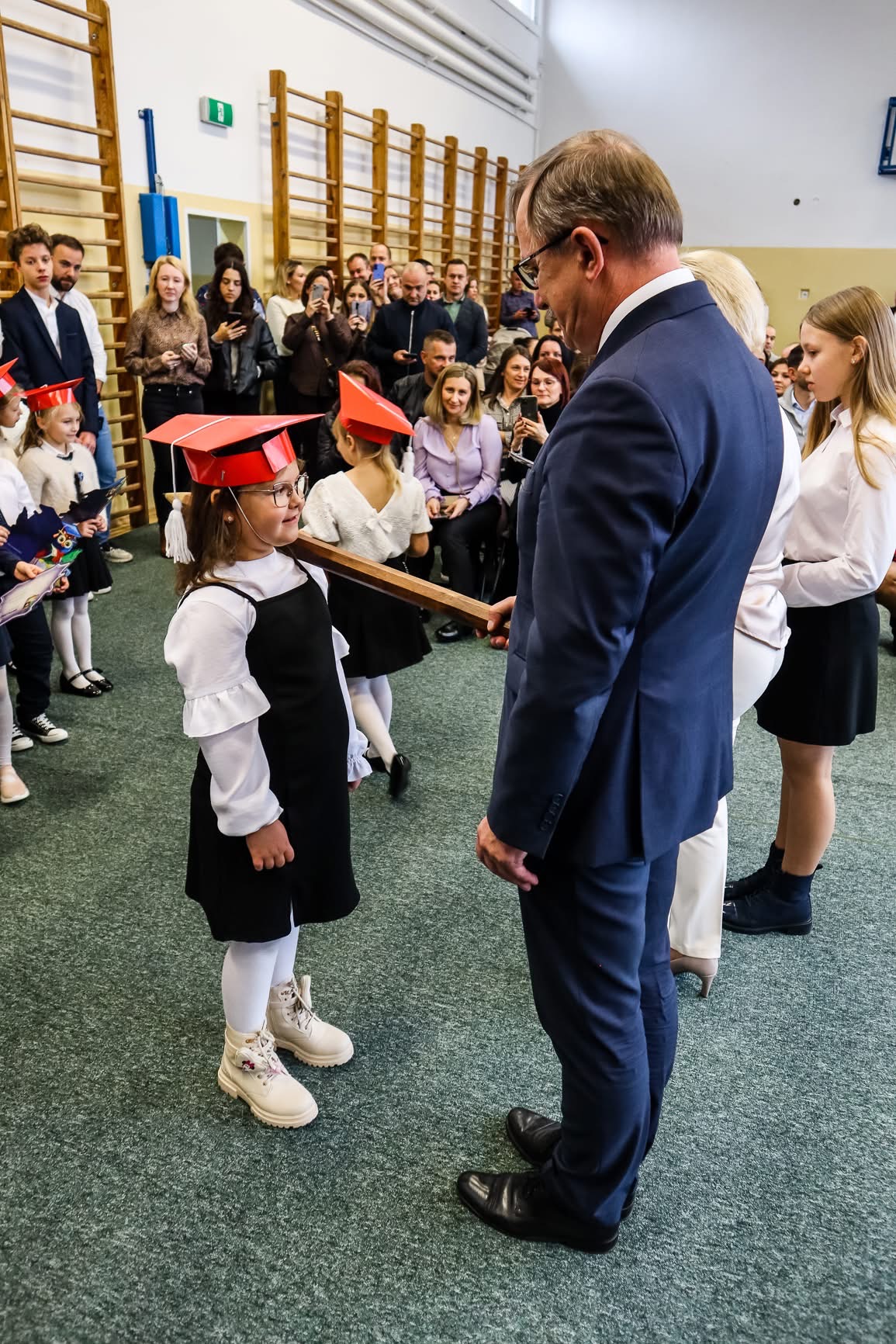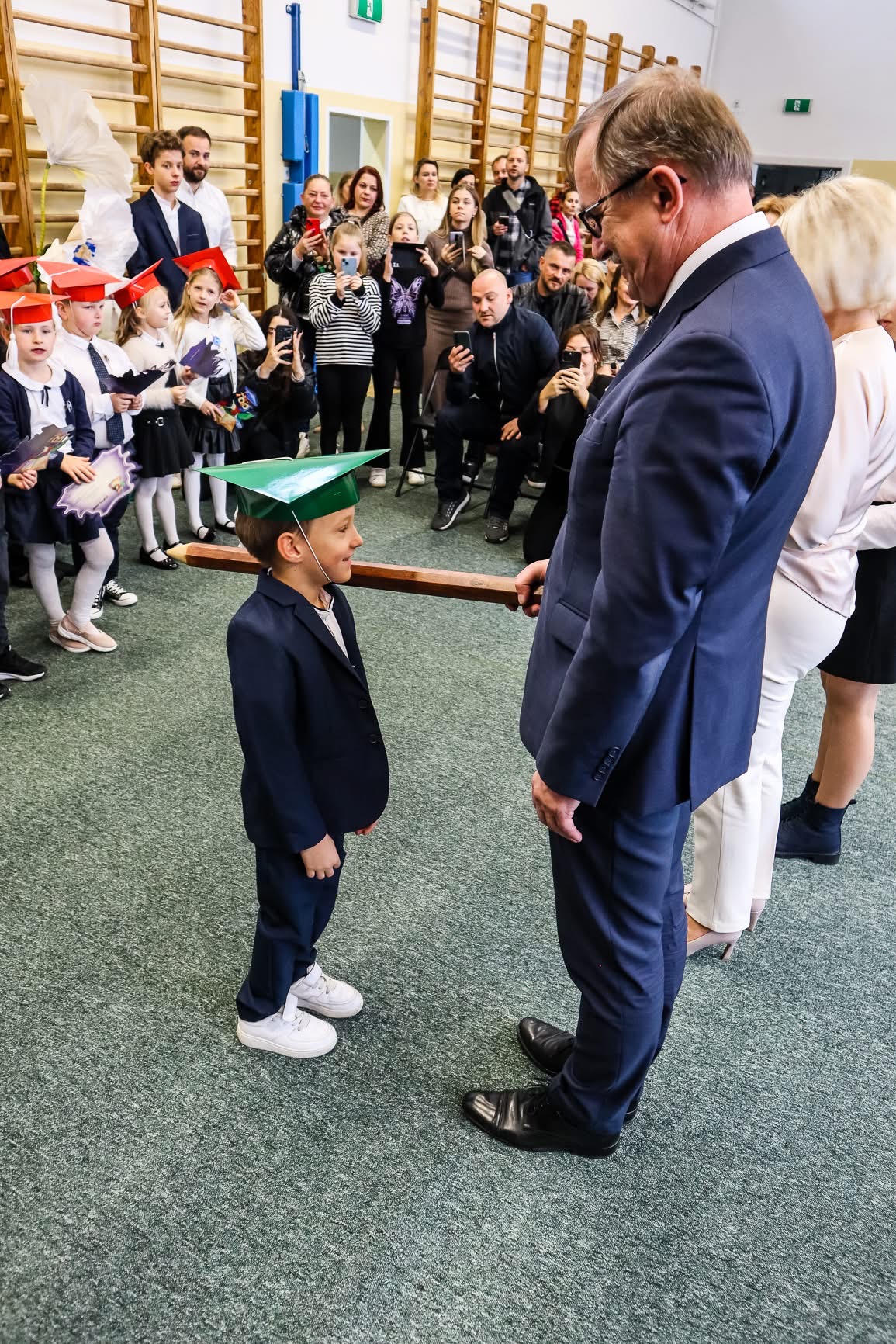 Dyrektor szkoły p. Zbigniew Solak symbolicznym ołówkiem pasował każdego pierwszaka na ucznia, a na pamiątkę tego wydarzenia dzieci otrzymały szkolne tarcze oraz okolicznościowe dyplomy.