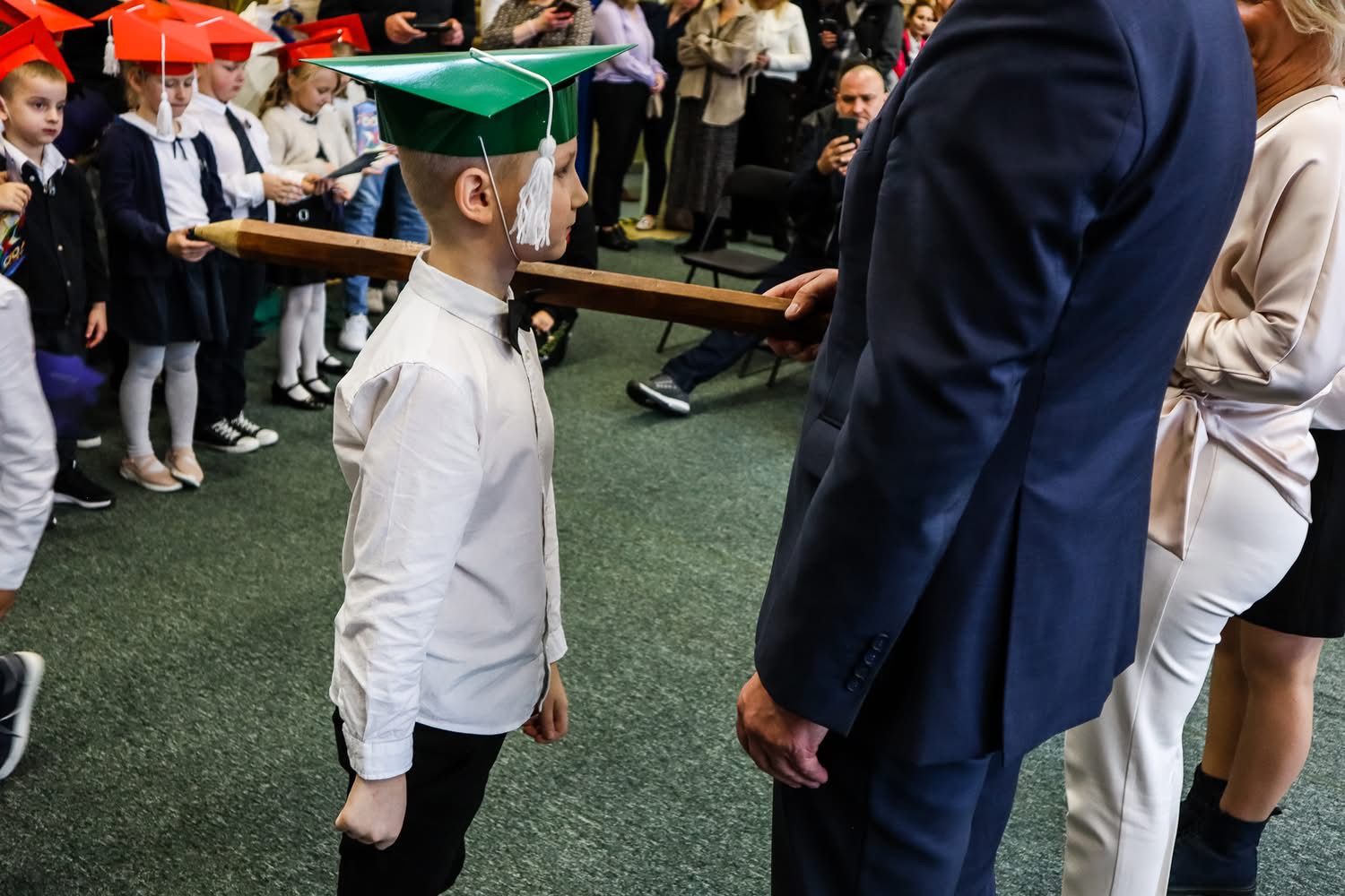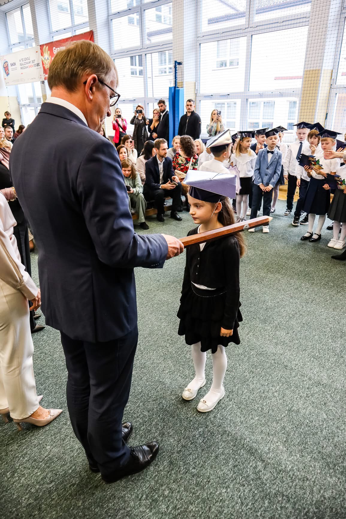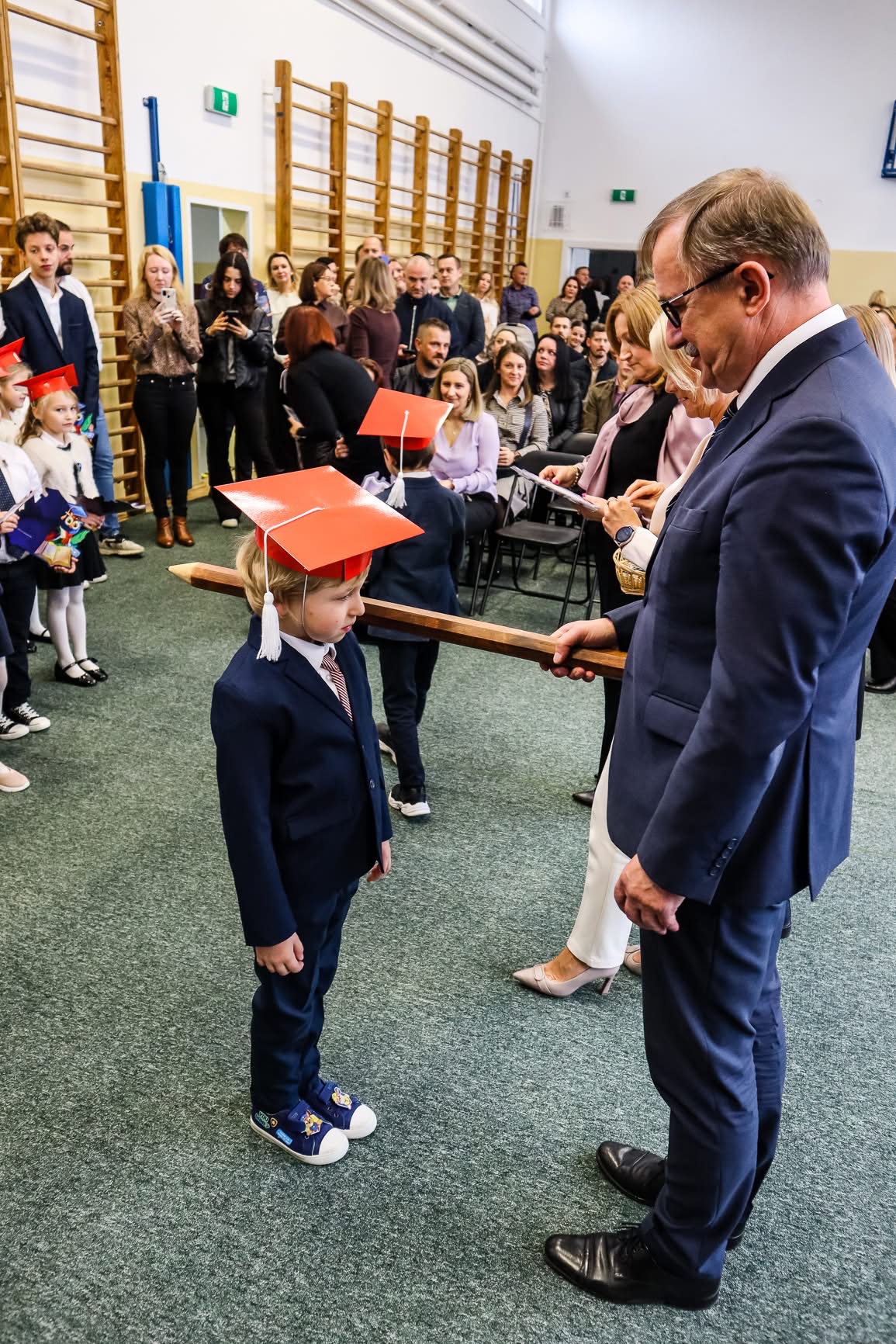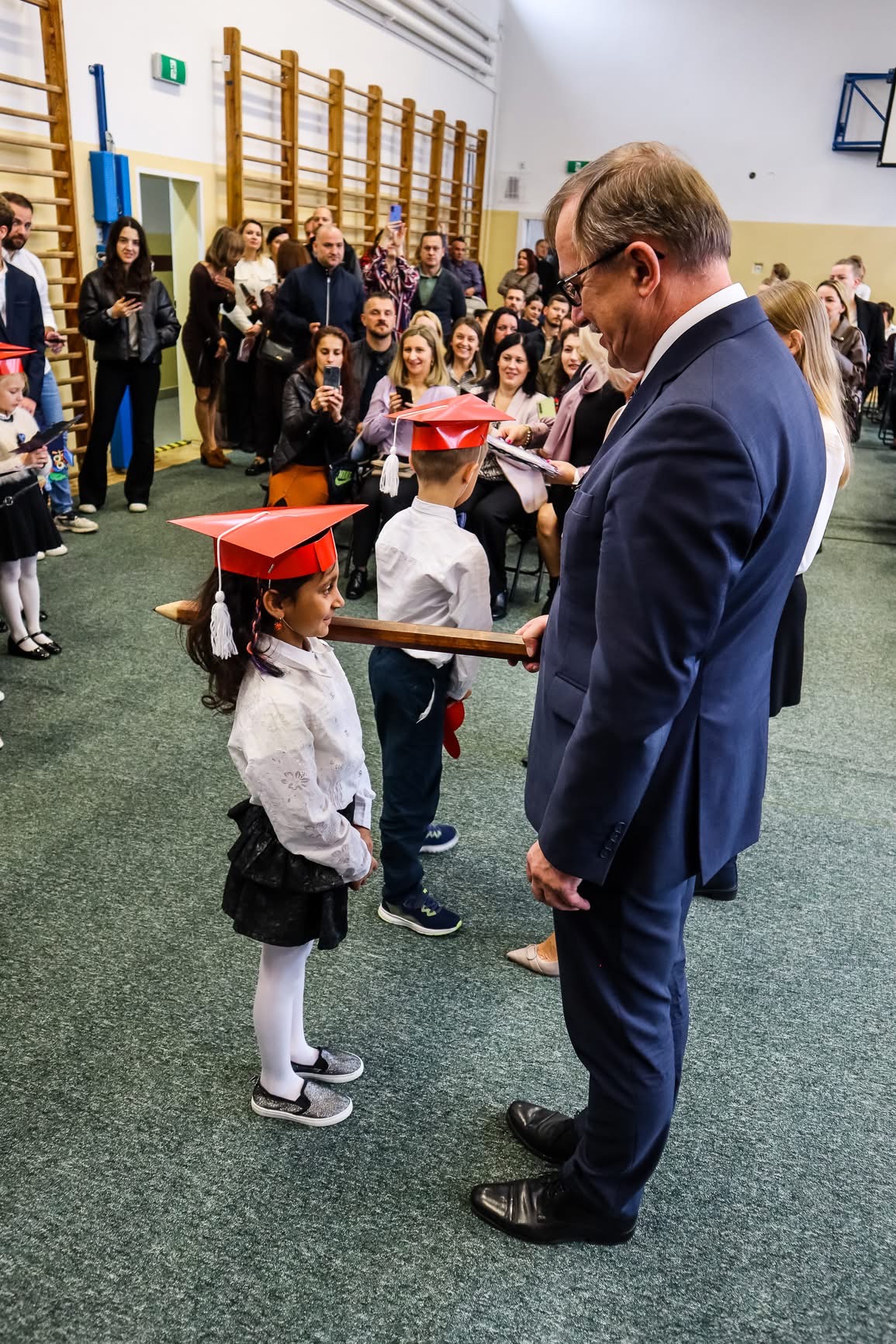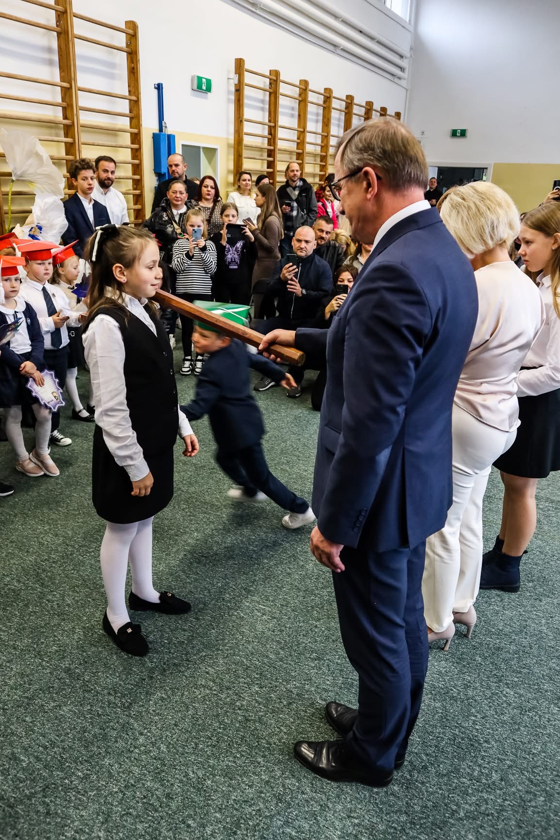 Dyrektor szkoły p. Zbigniew Solak symbolicznym ołówkiem pasował każdego pierwszaka na ucznia, a na pamiątkę tego wydarzenia dzieci otrzymały szkolne tarcze oraz okolicznościowe dyplomy.