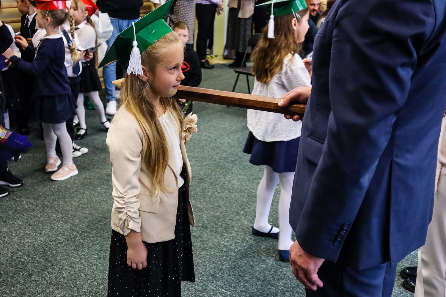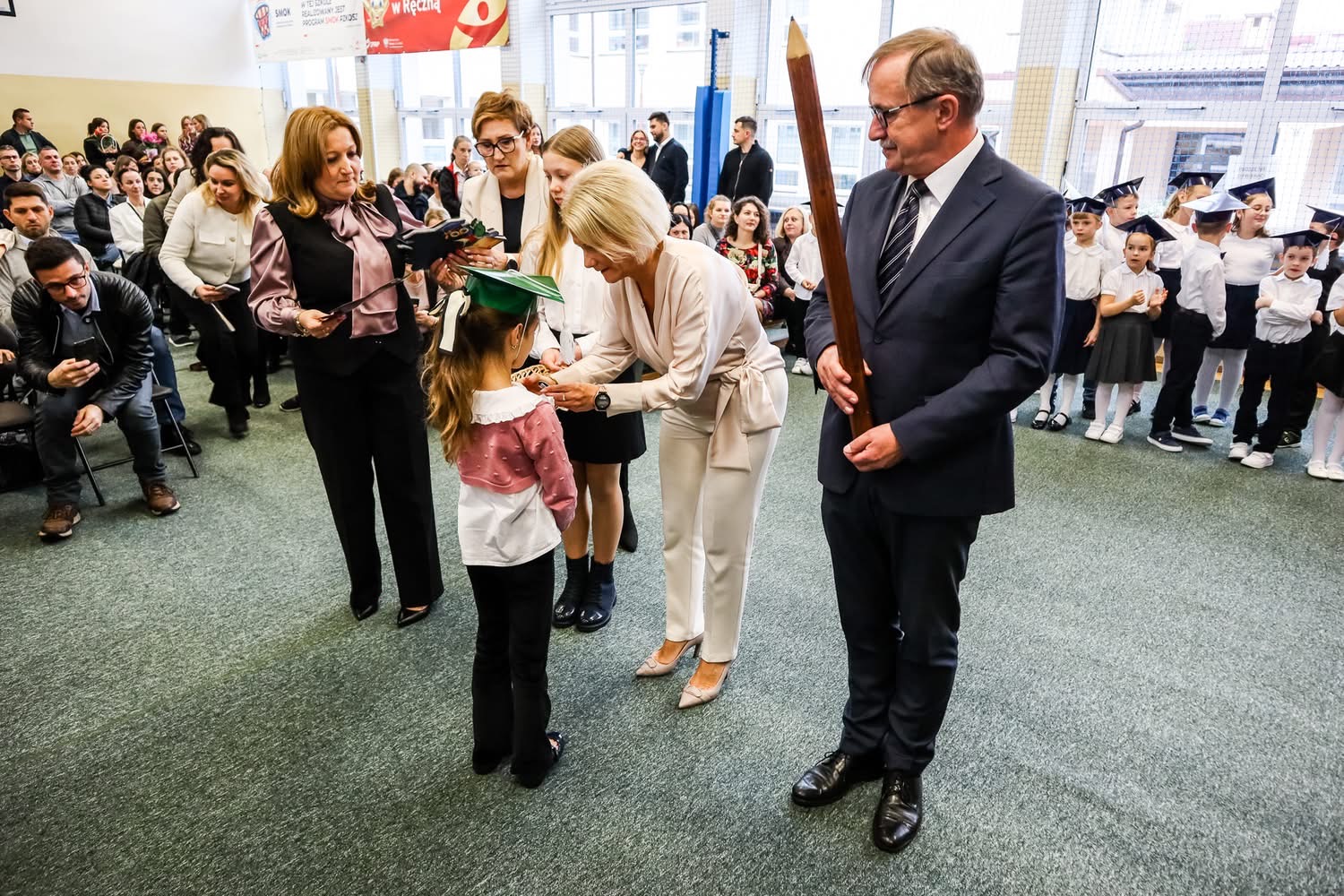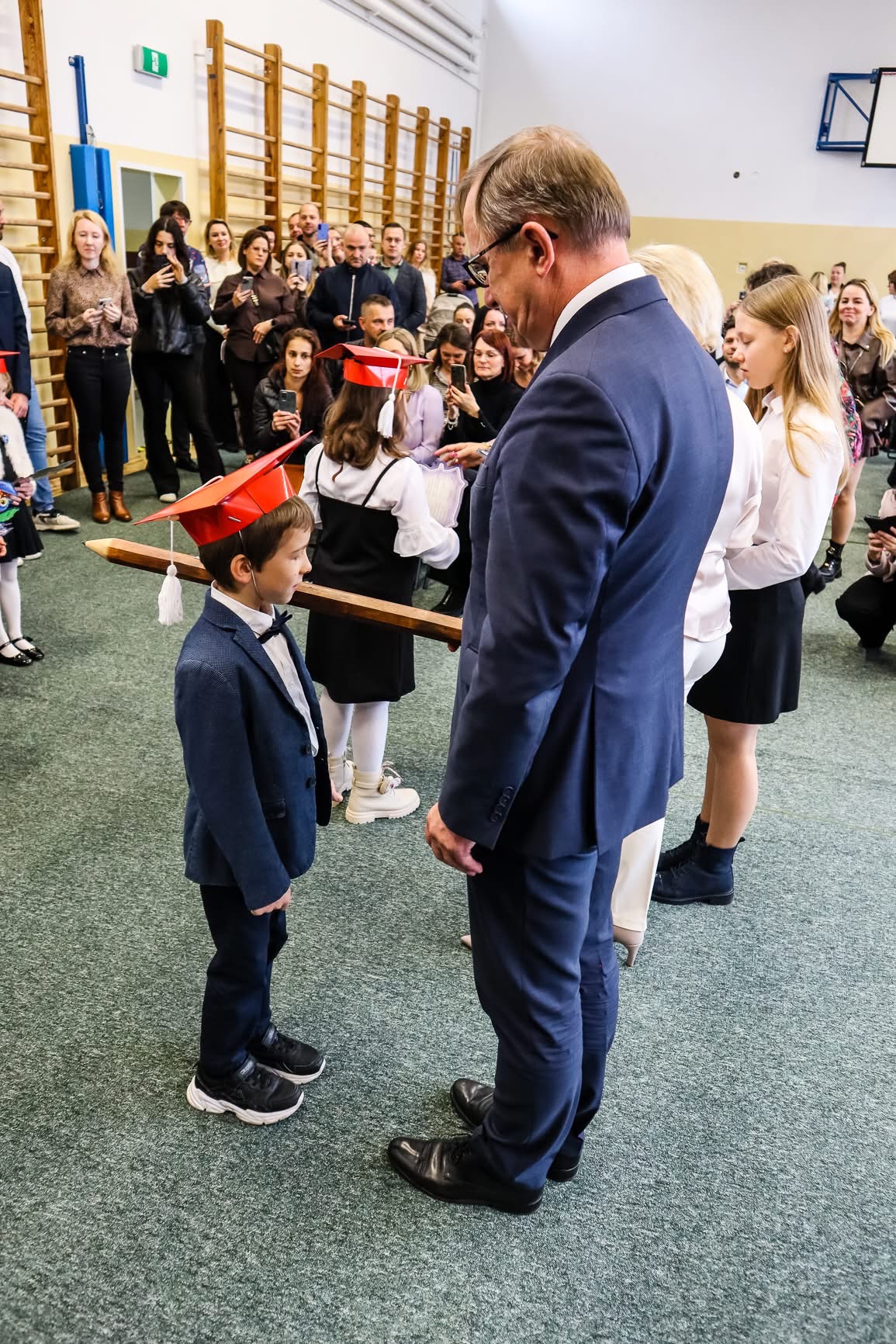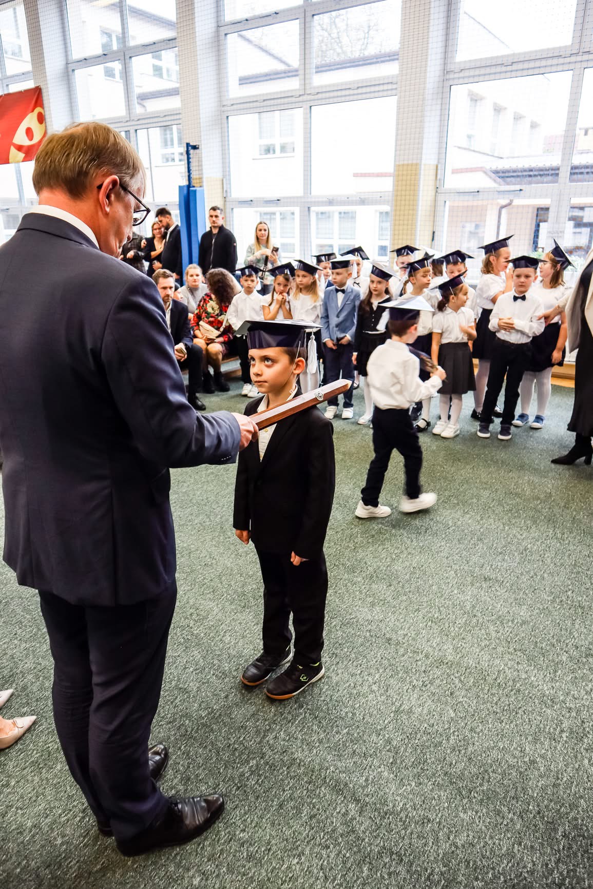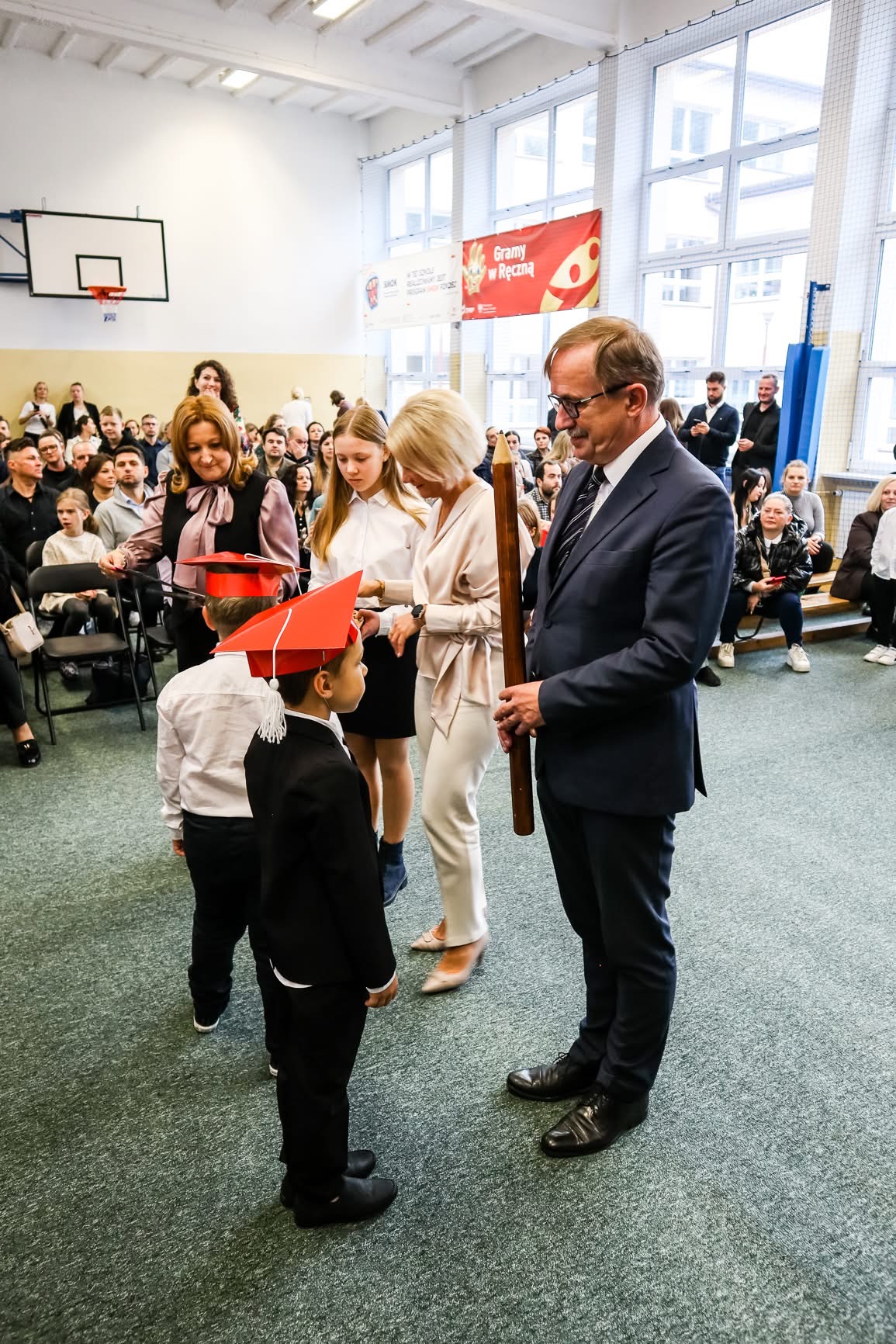 Dyrektor szkoły p. Zbigniew Solak symbolicznym ołówkiem pasował każdego pierwszaka na ucznia, a na pamiątkę tego wydarzenia dzieci otrzymały szkolne tarcze oraz okolicznościowe dyplomy.