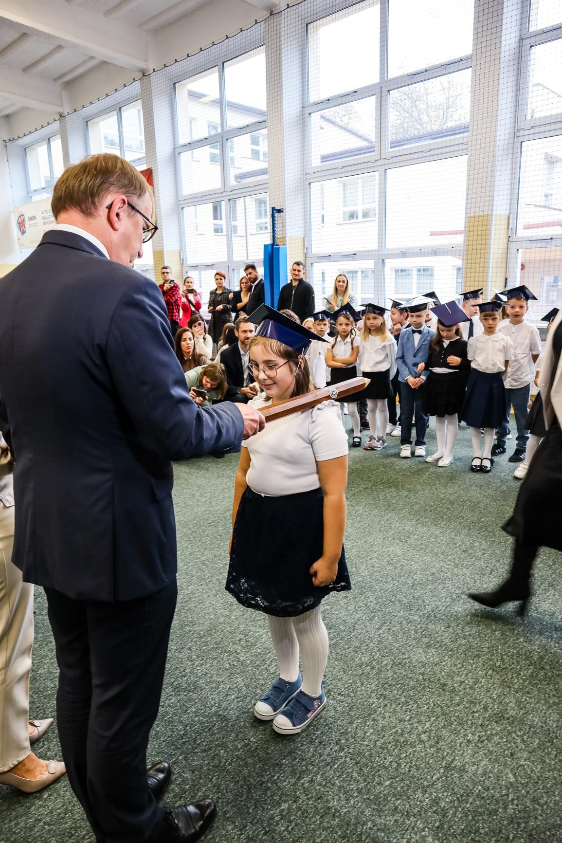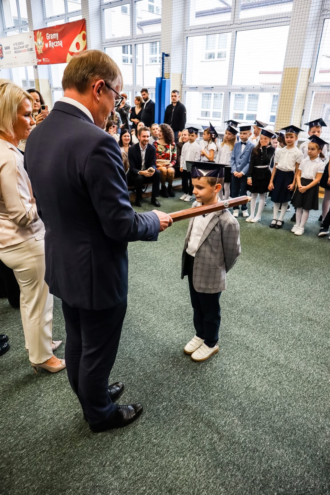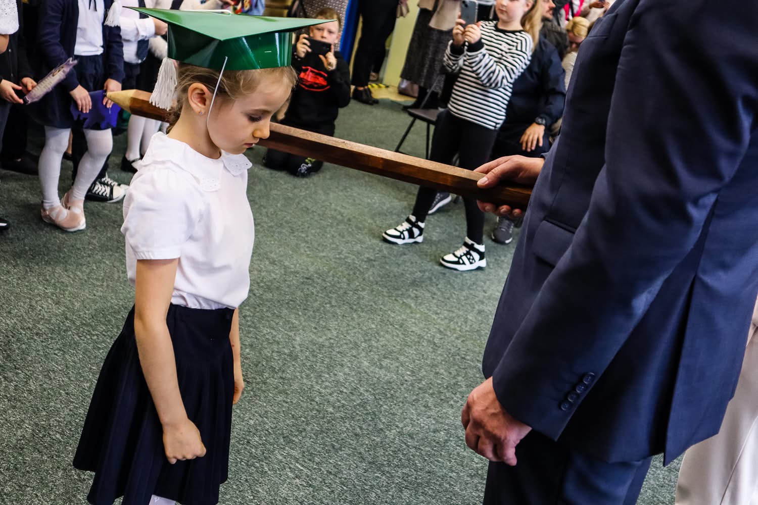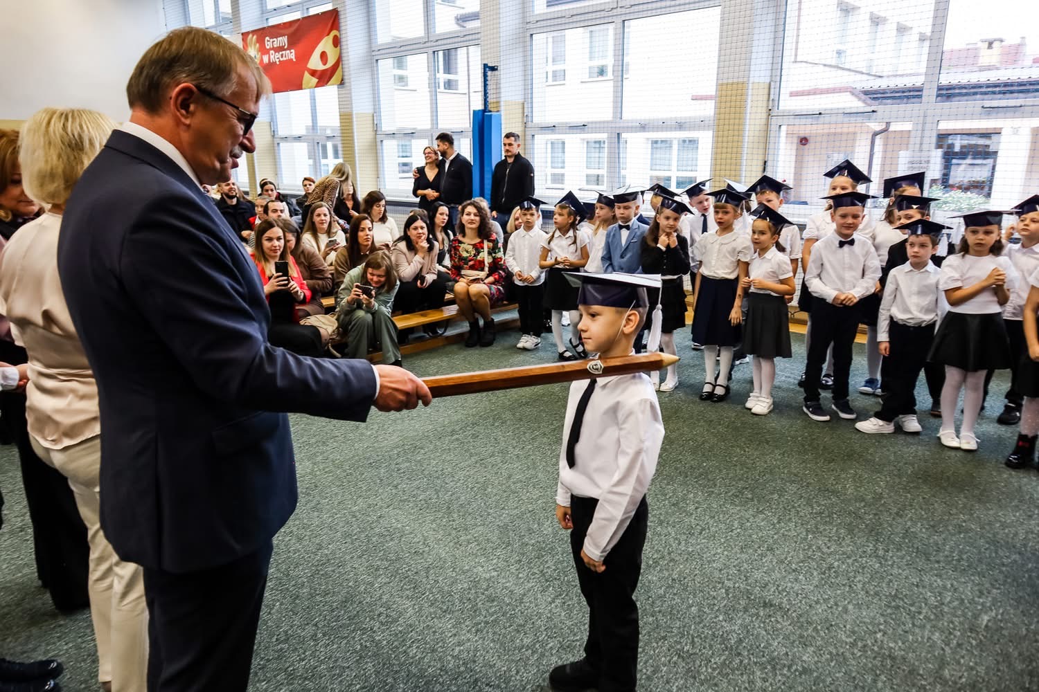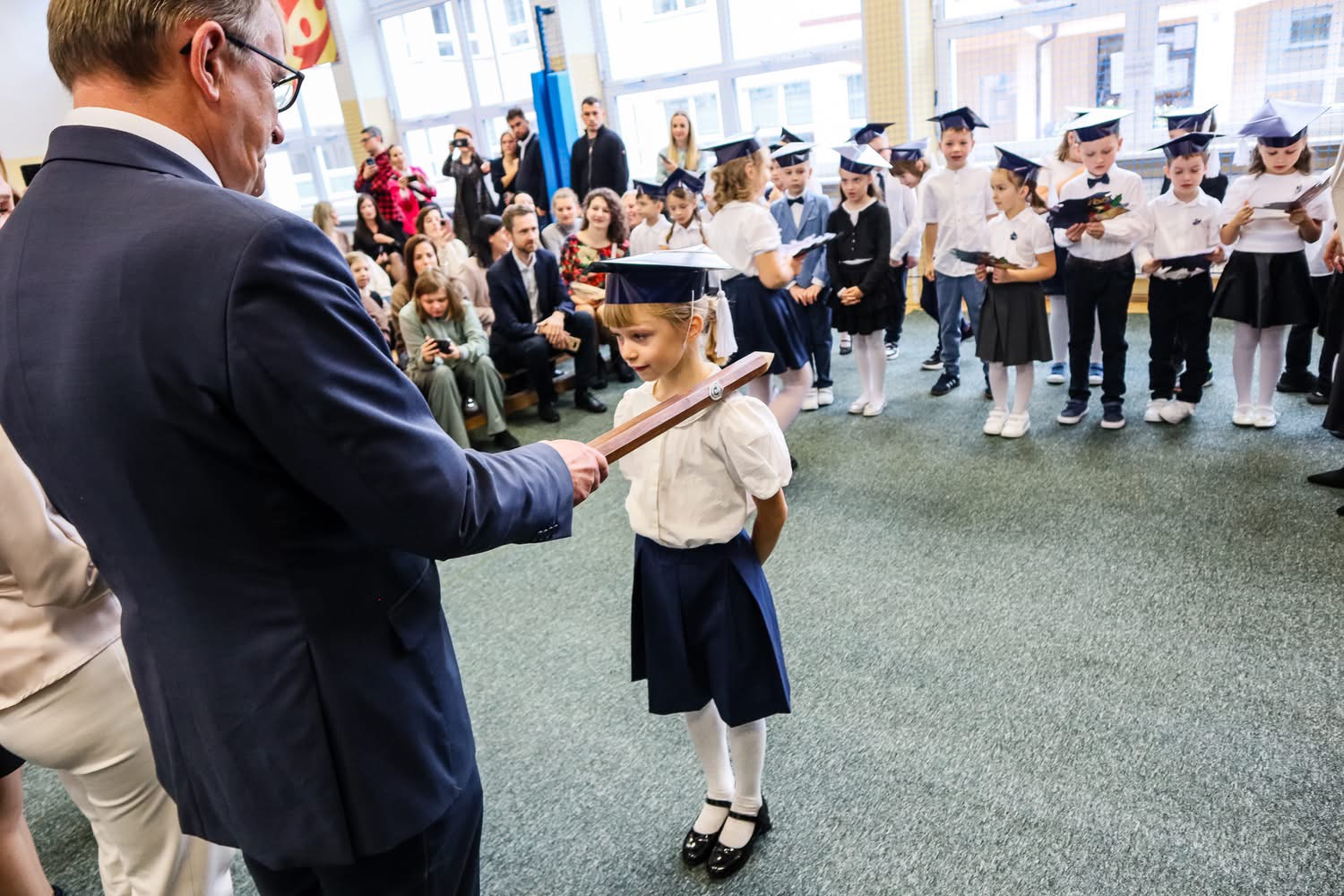 Dyrektor szkoły p. Zbigniew Solak symbolicznym ołówkiem pasował każdego pierwszaka na ucznia, a na pamiątkę tego wydarzenia dzieci otrzymały szkolne tarcze oraz okolicznościowe dyplomy.