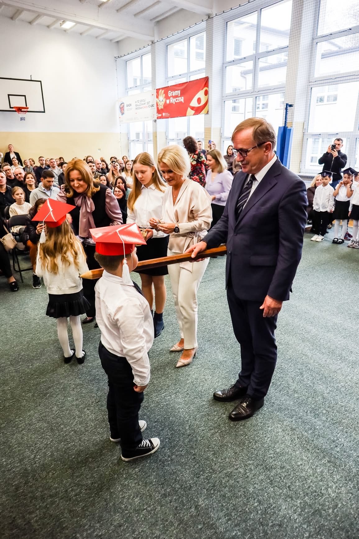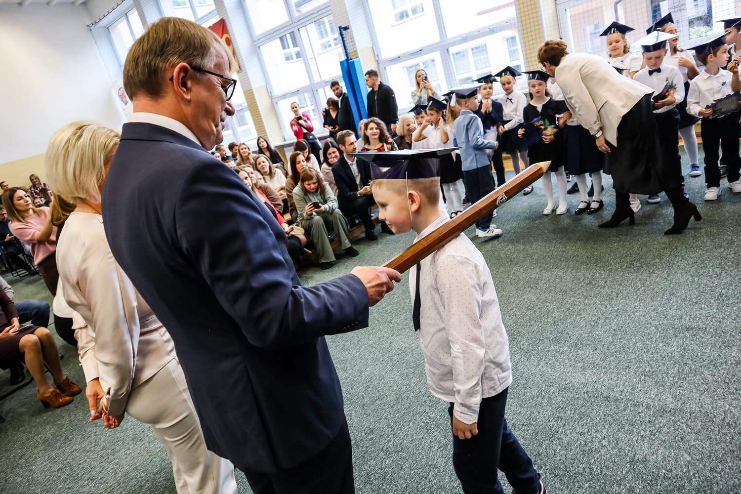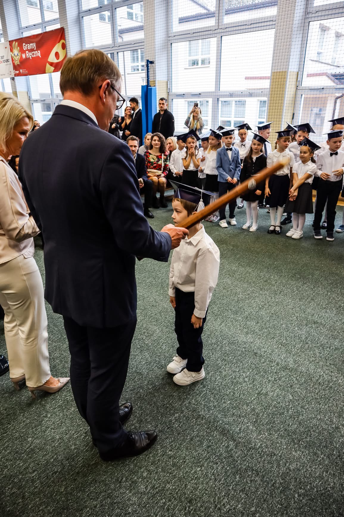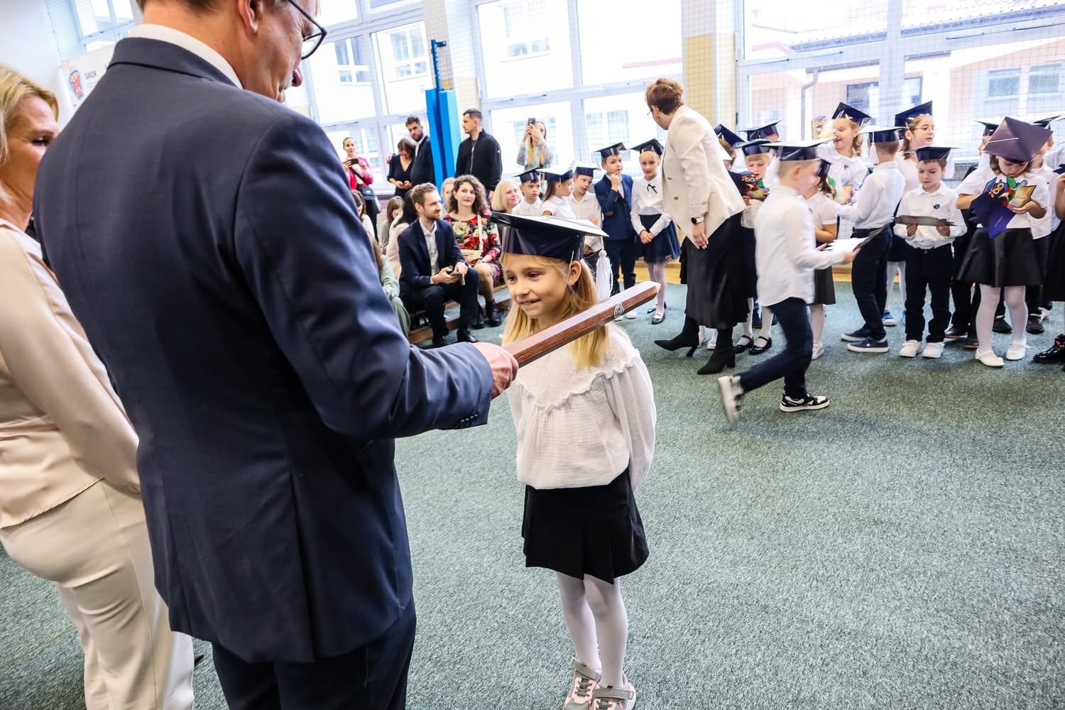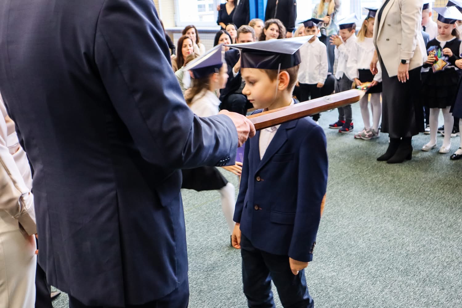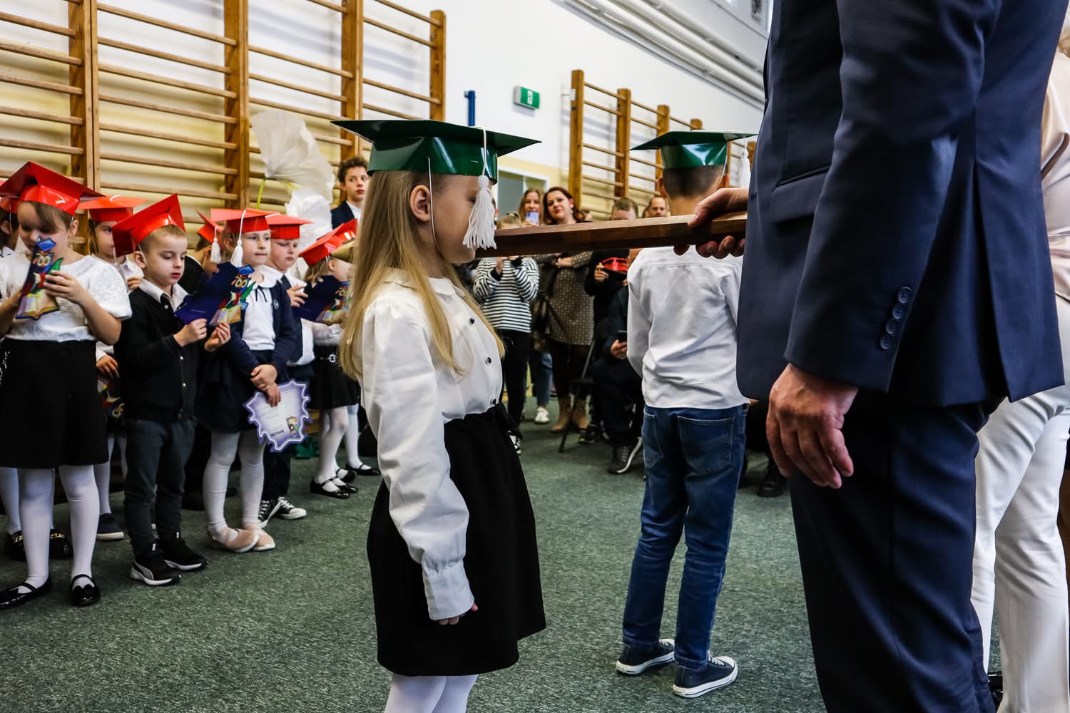 Dyrektor szkoły p. Zbigniew Solak symbolicznym ołówkiem pasował każdego pierwszaka na ucznia, a na pamiątkę tego wydarzenia dzieci otrzymały szkolne tarcze oraz okolicznościowe dyplomy.