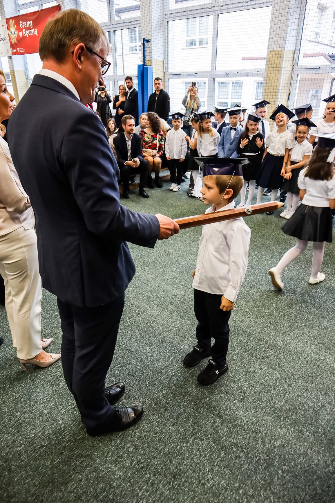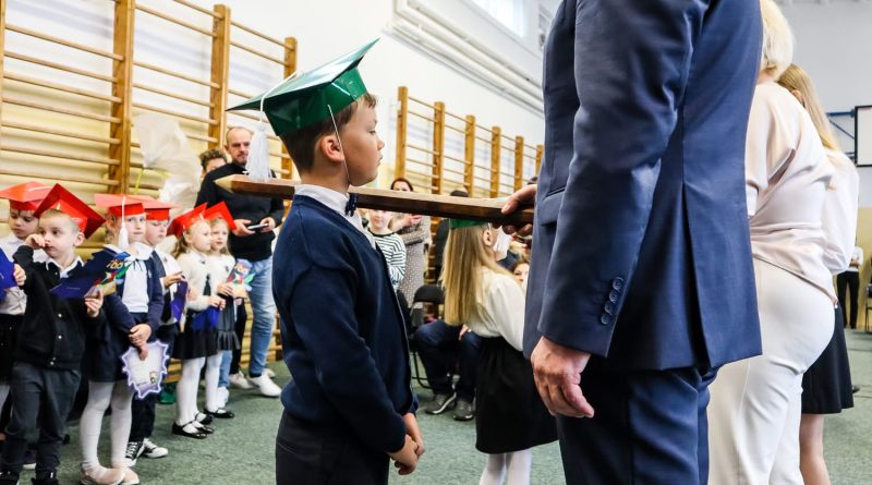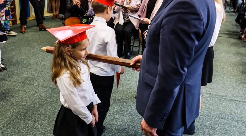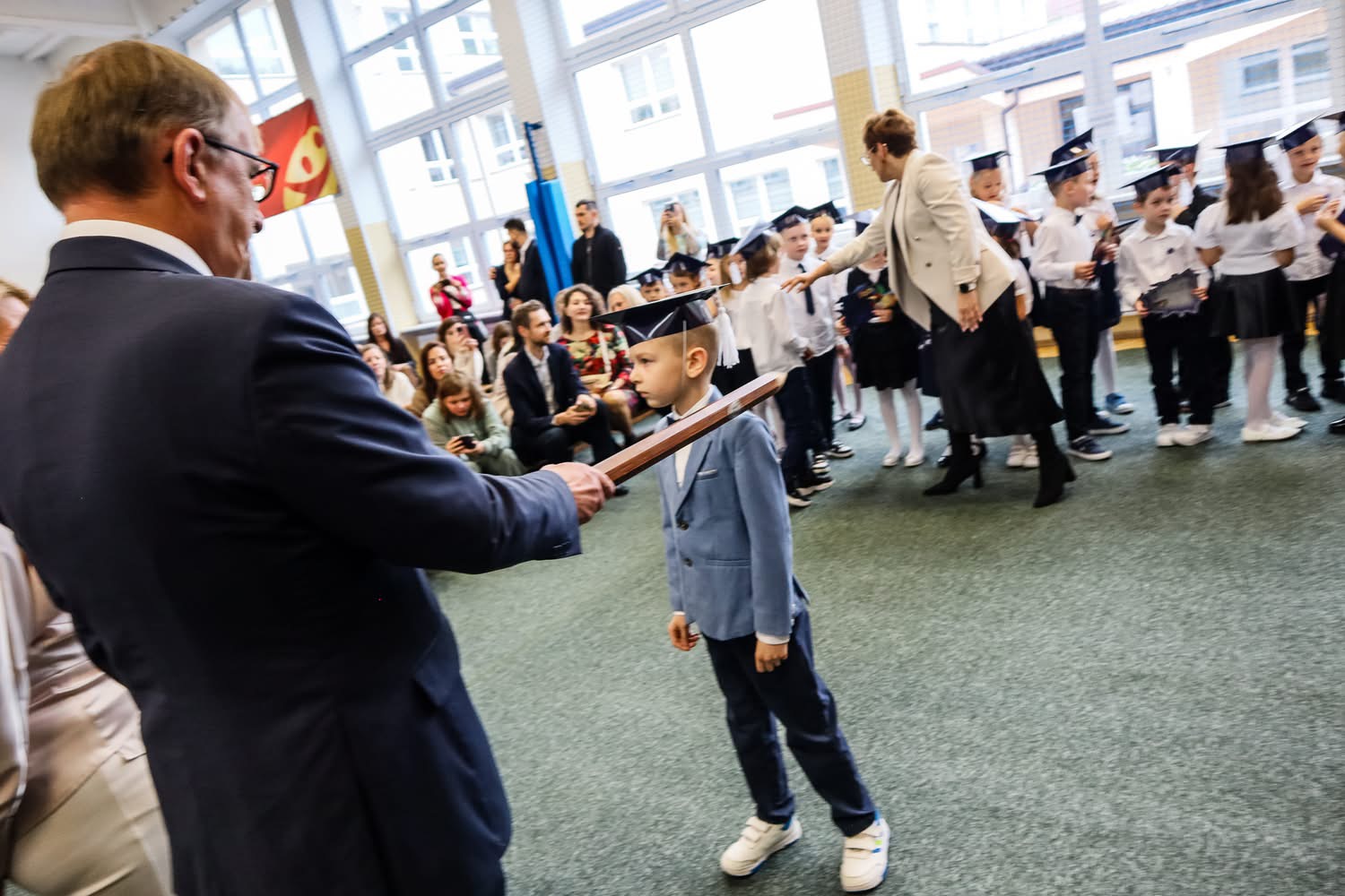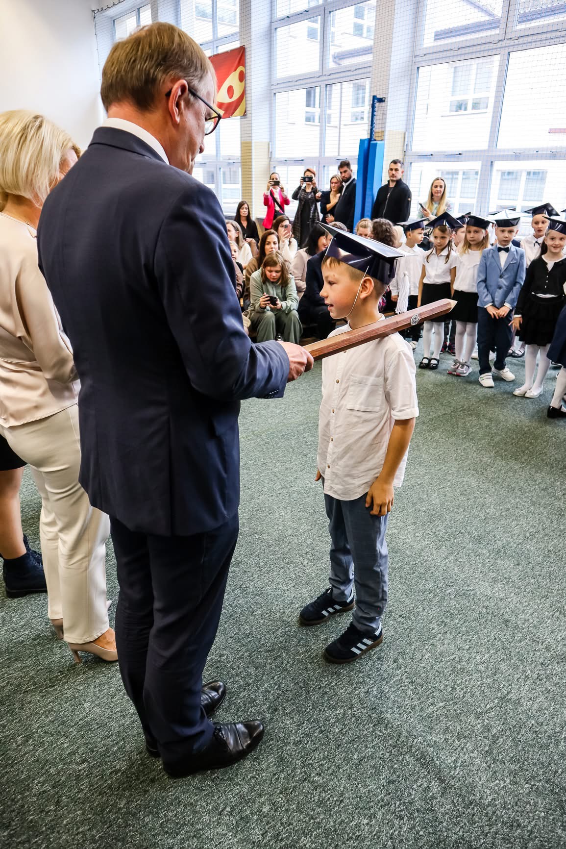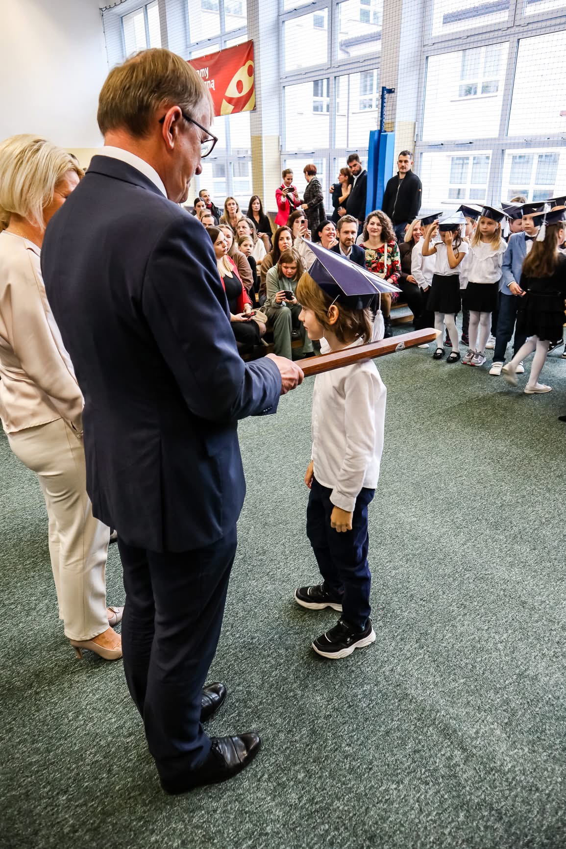 Dyrektor szkoły p. Zbigniew Solak symbolicznym ołówkiem pasował każdego pierwszaka na ucznia, a na pamiątkę tego wydarzenia dzieci otrzymały szkolne tarcze oraz okolicznościowe dyplomy.