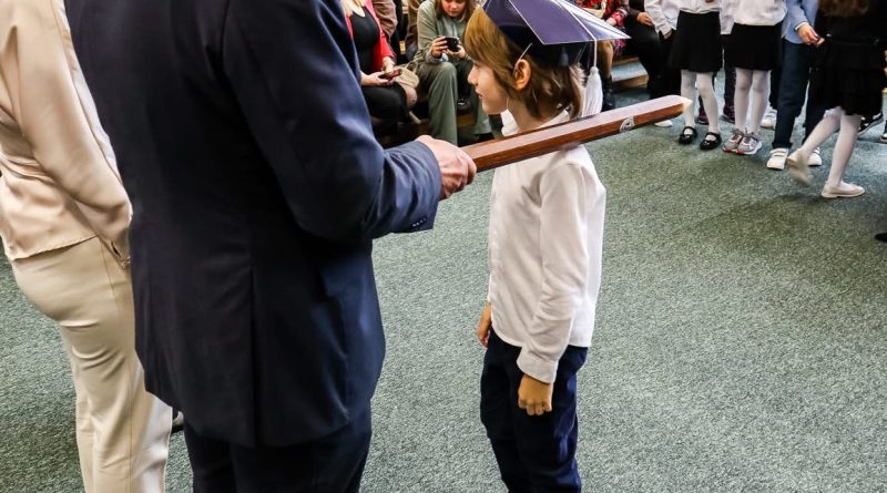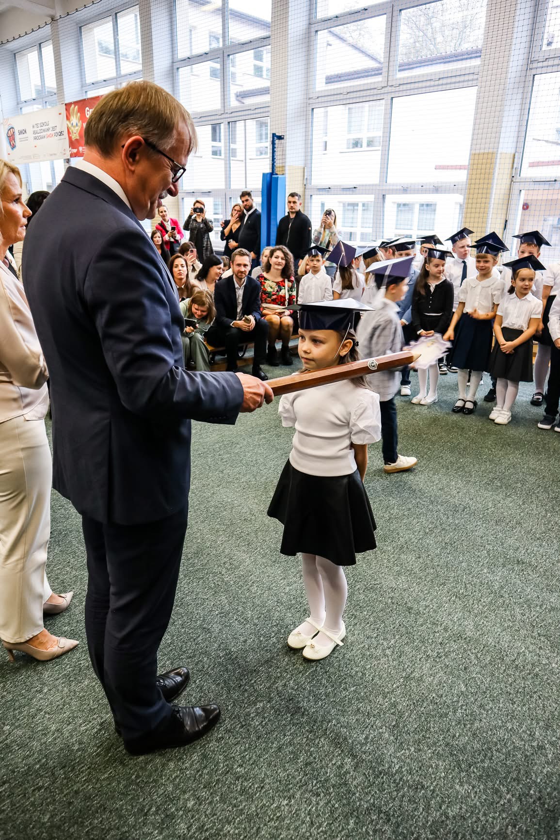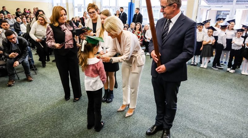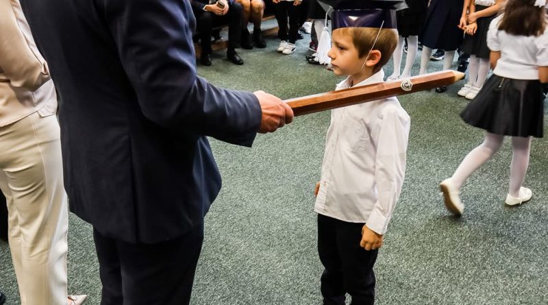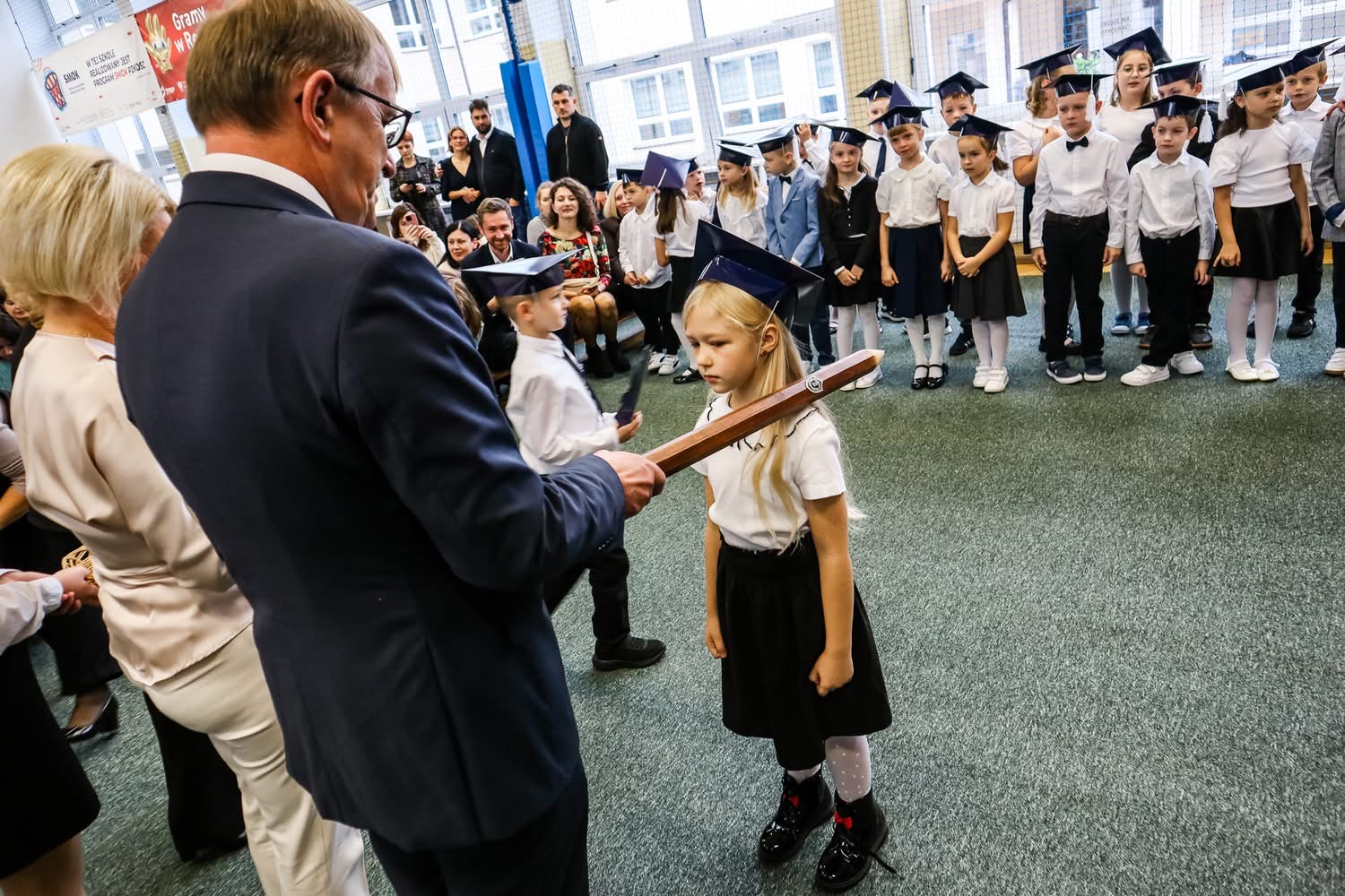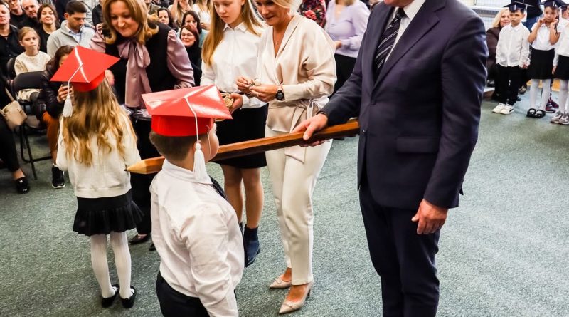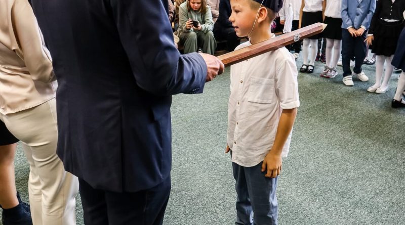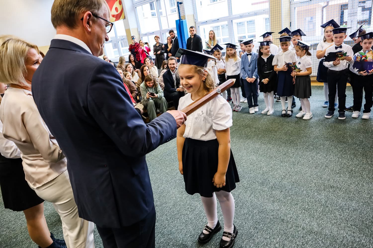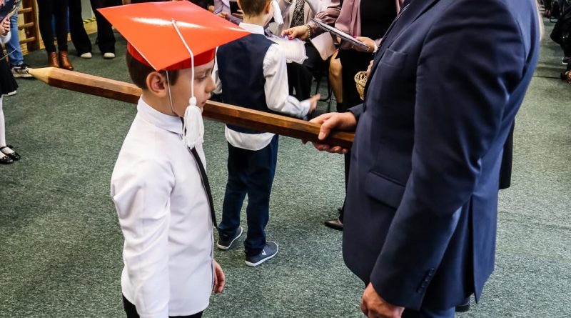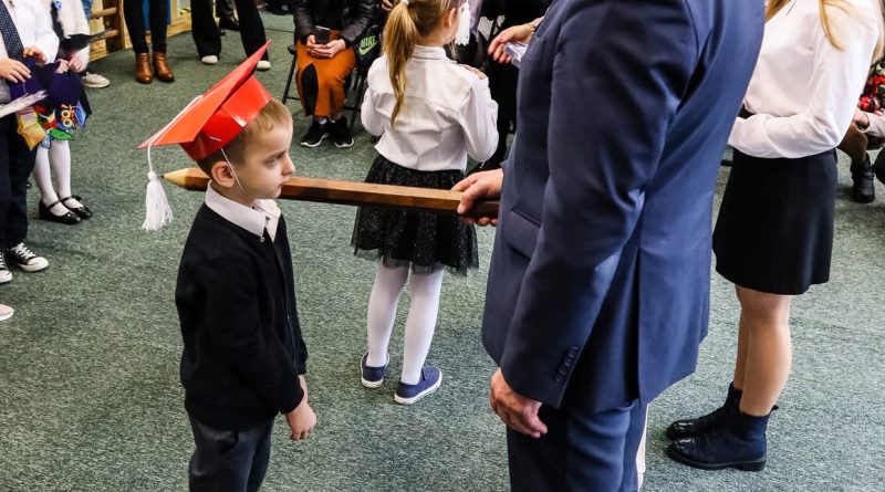Dyrektor szkoły p. Zbigniew Solak symbolicznym ołówkiem pasował każdego pierwszaka na ucznia, a na pamiątkę tego wydarzenia dzieci otrzymały szkolne tarcze oraz okolicznościowe dyplomy.