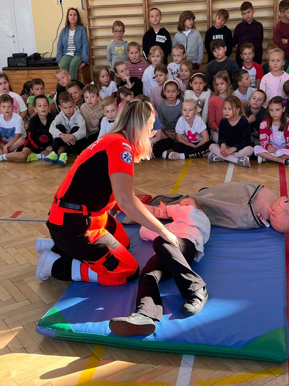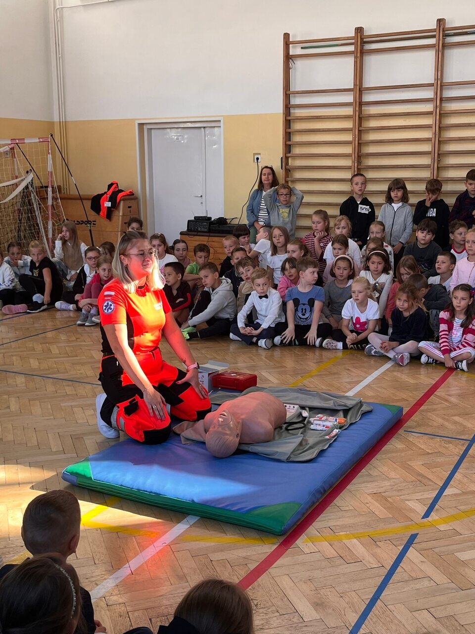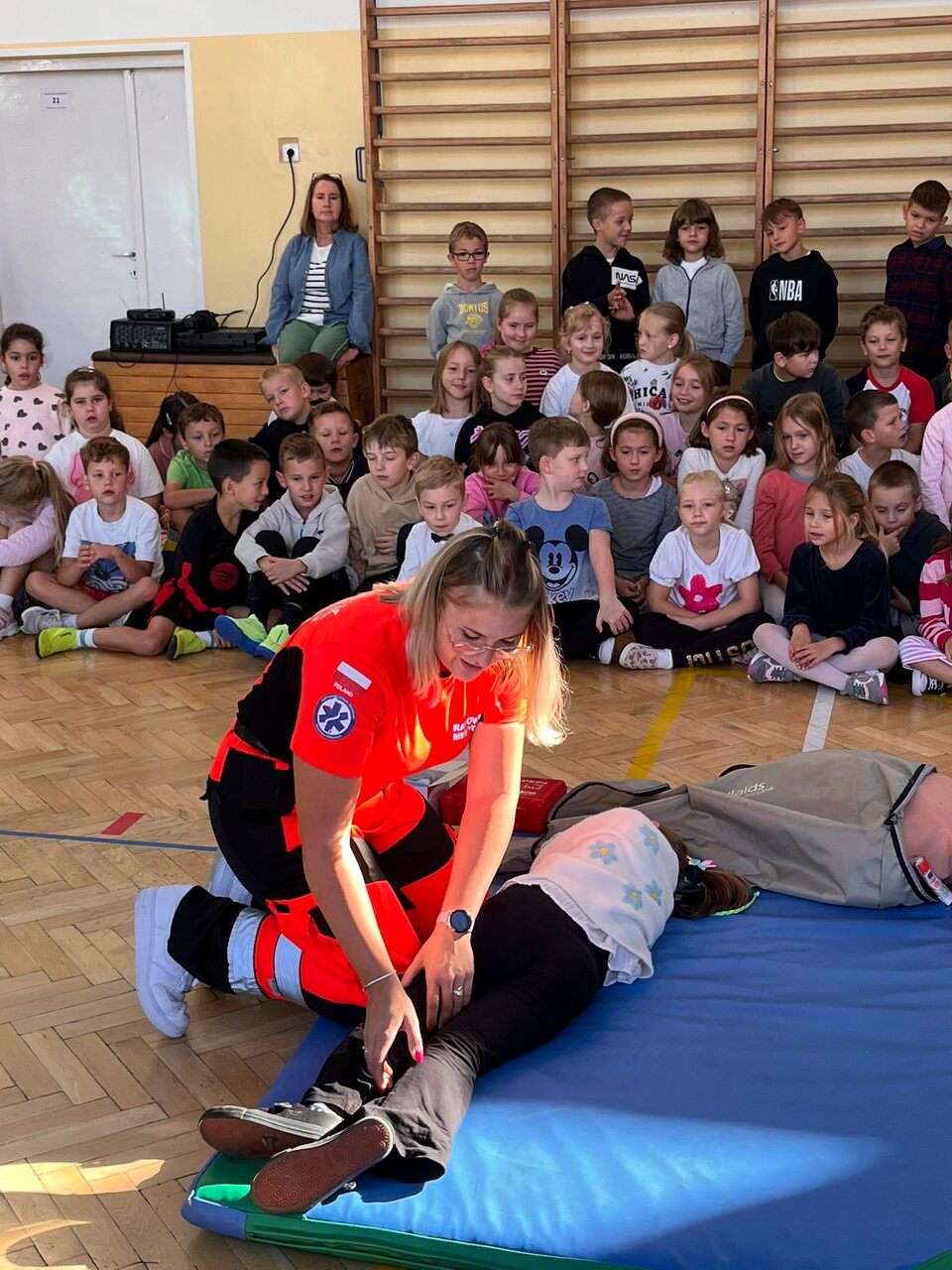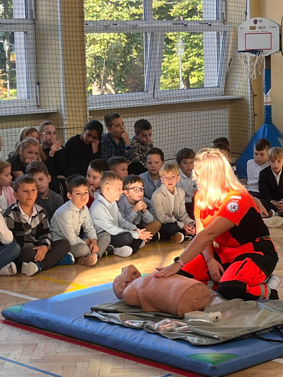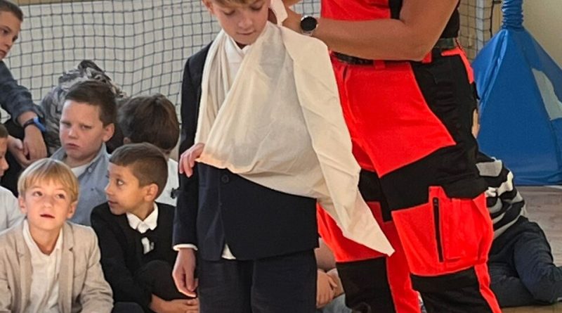 Podczas spotkania pani ratownik omówiła zasady wzywania pomocy, numery alarmowe oraz sposób przekazywania informacji dyspozytorowi. Uczniowie dowiedzieli się, jak sprawdzić przytomność poszkodowanego, ocenić oddech i ułożyć osobę w pozycji bocznej ustalonej. Dzieci miały także okazję przećwiczyć na fantomie podstawowe czynności resuscytacyjne. ☺️