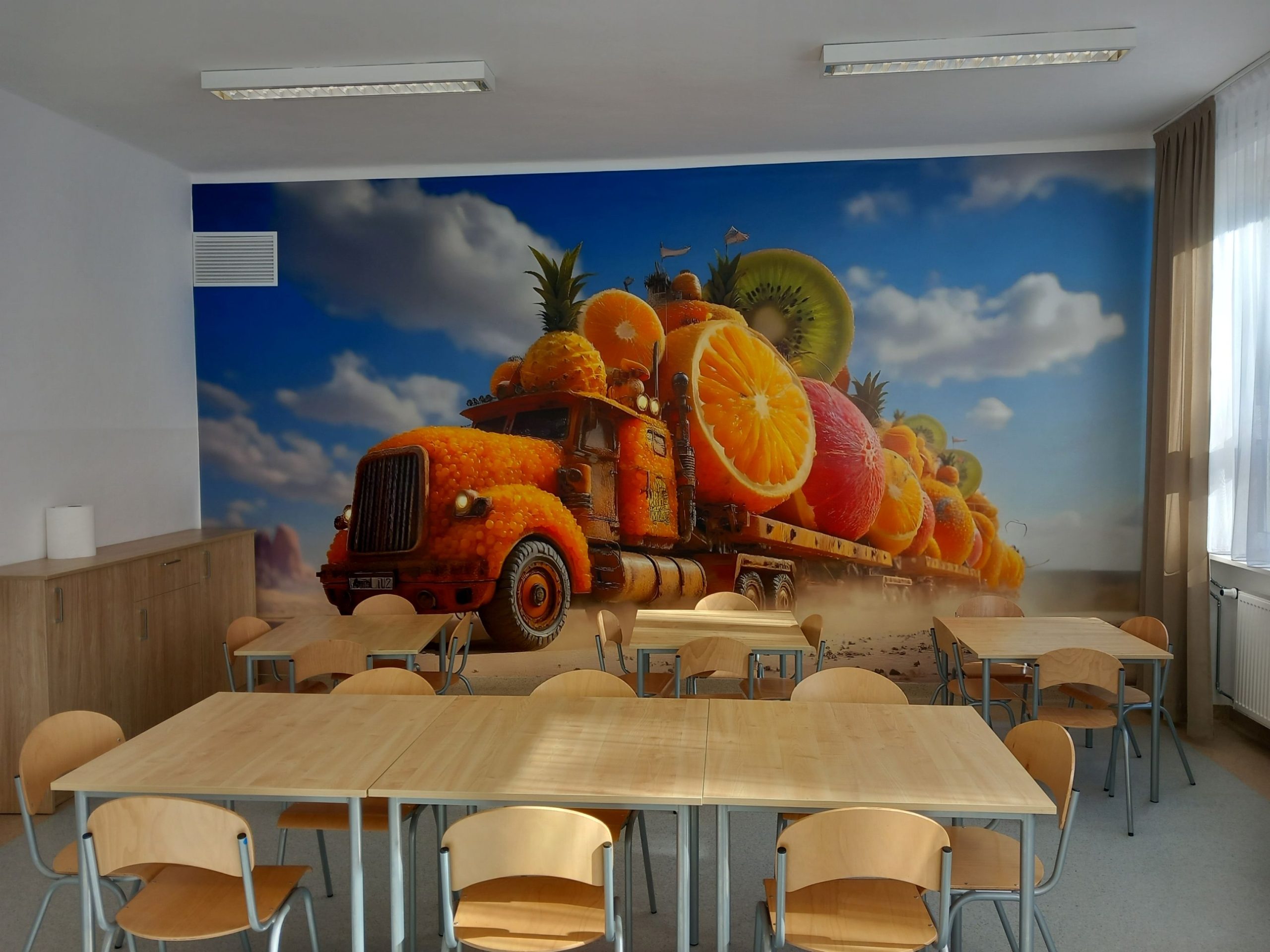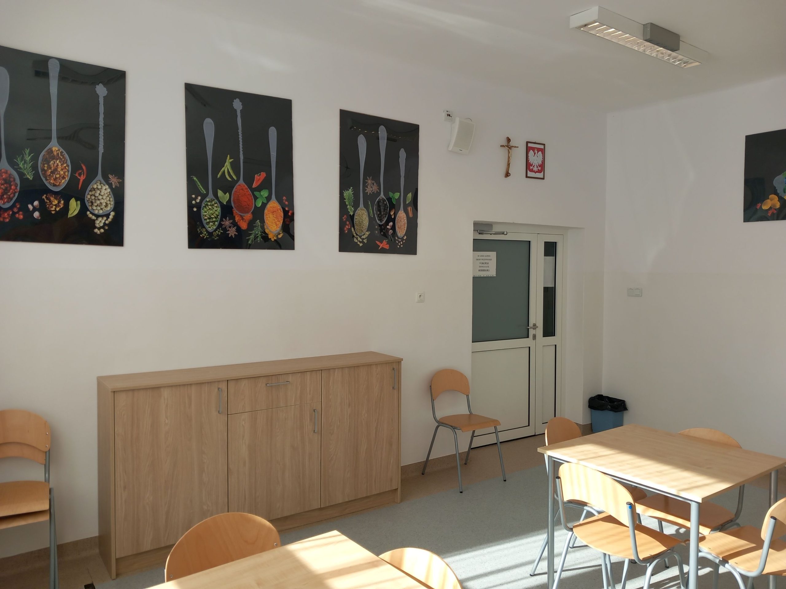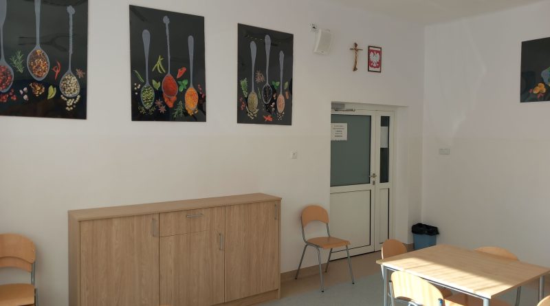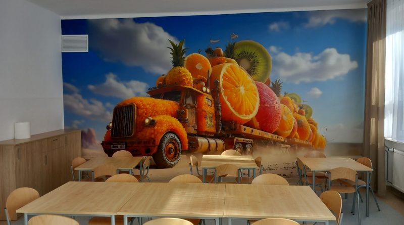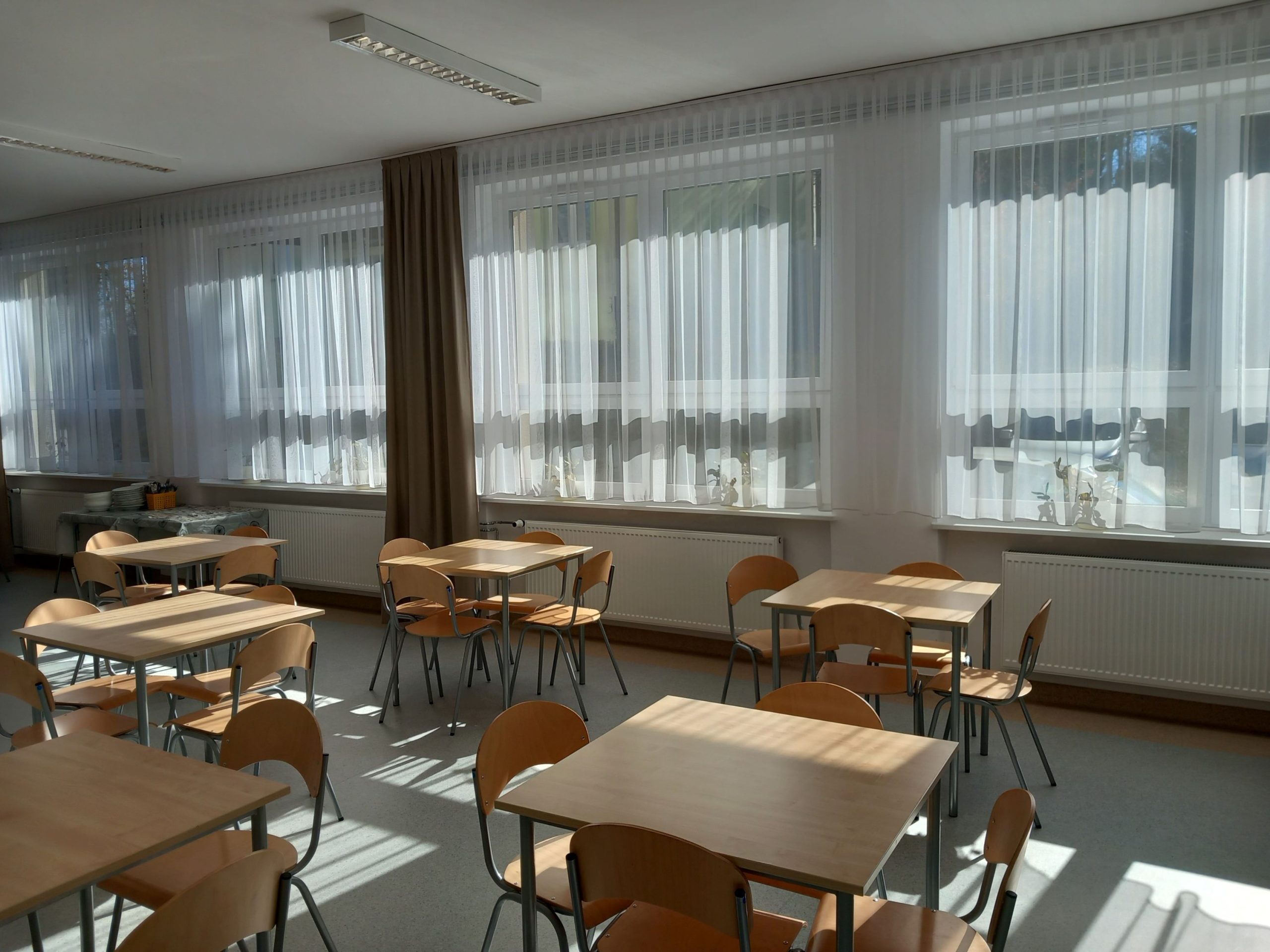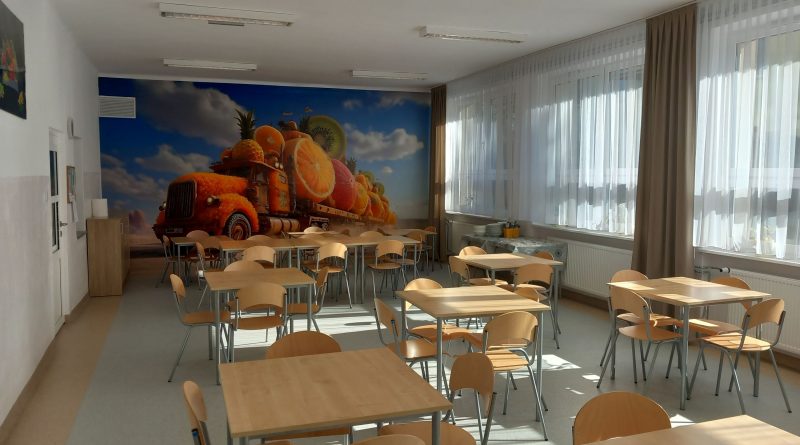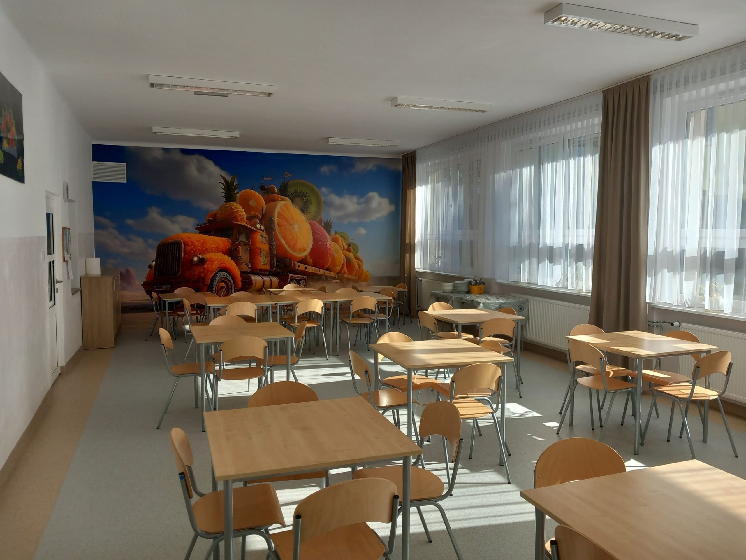 z którego pozyskano środki finansowe. W czasie trwania remontu wymieniono podłogę oraz okienka podawcze pomiędzy kuchnią, a jadalnią, co z pewnością usprawni codzienną pracę personelu. Ściany jadalni zostały odmalowane, a wnętrze ozdobiła dekoracyjna fototapeta, która nadaje przestrzeni ciepłego i przyjaznego charakteru. Warto również dodać, iż jadalnia wyposażona została w nowoczesne meble, które posłużą jako dodatkowe miejsce do przechowywania. Dzięki przeprowadzonemu remontowi stołówka stała się miejscem nie tylko funkcjonalnym, ale też estetycznym i przyjaznym dla wszystkich uczniów i pracowników szkoły.